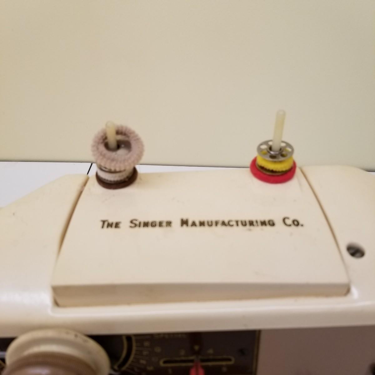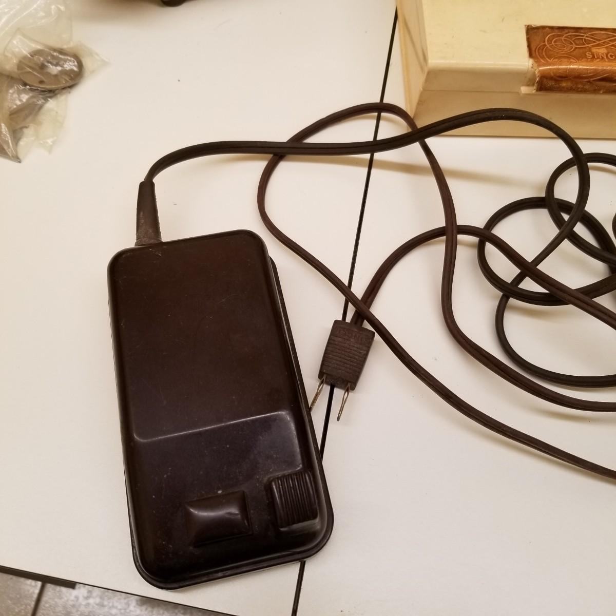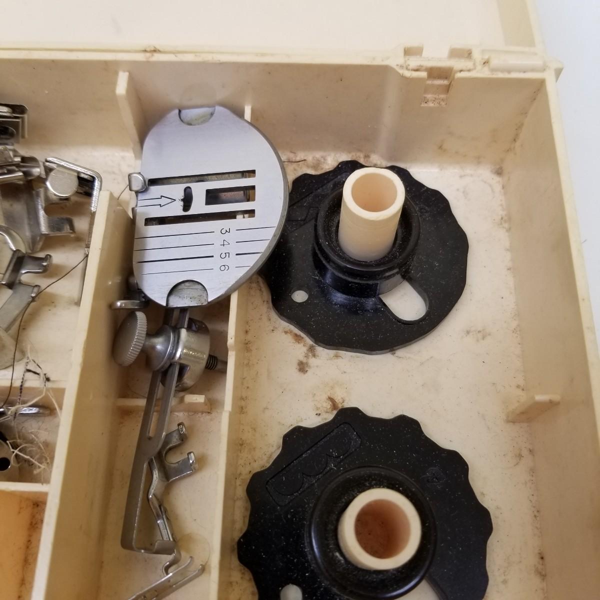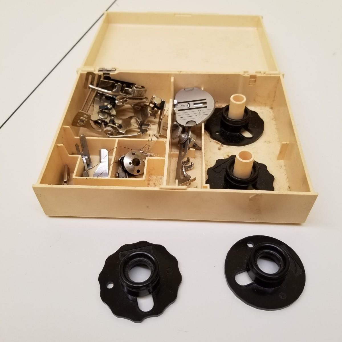 A pair of vintage Singers from their 400 series line. Both of these machines hail to late 50's date of manufacture. The 404 model is a little more basic while the 401A has the ability to use two needles and specialty discs to do pattern sewing and basic embroidery. Both machines power on but do not turn, will need cleaning and oiling. Footpedals and an accessory box of discs and parts are included.
