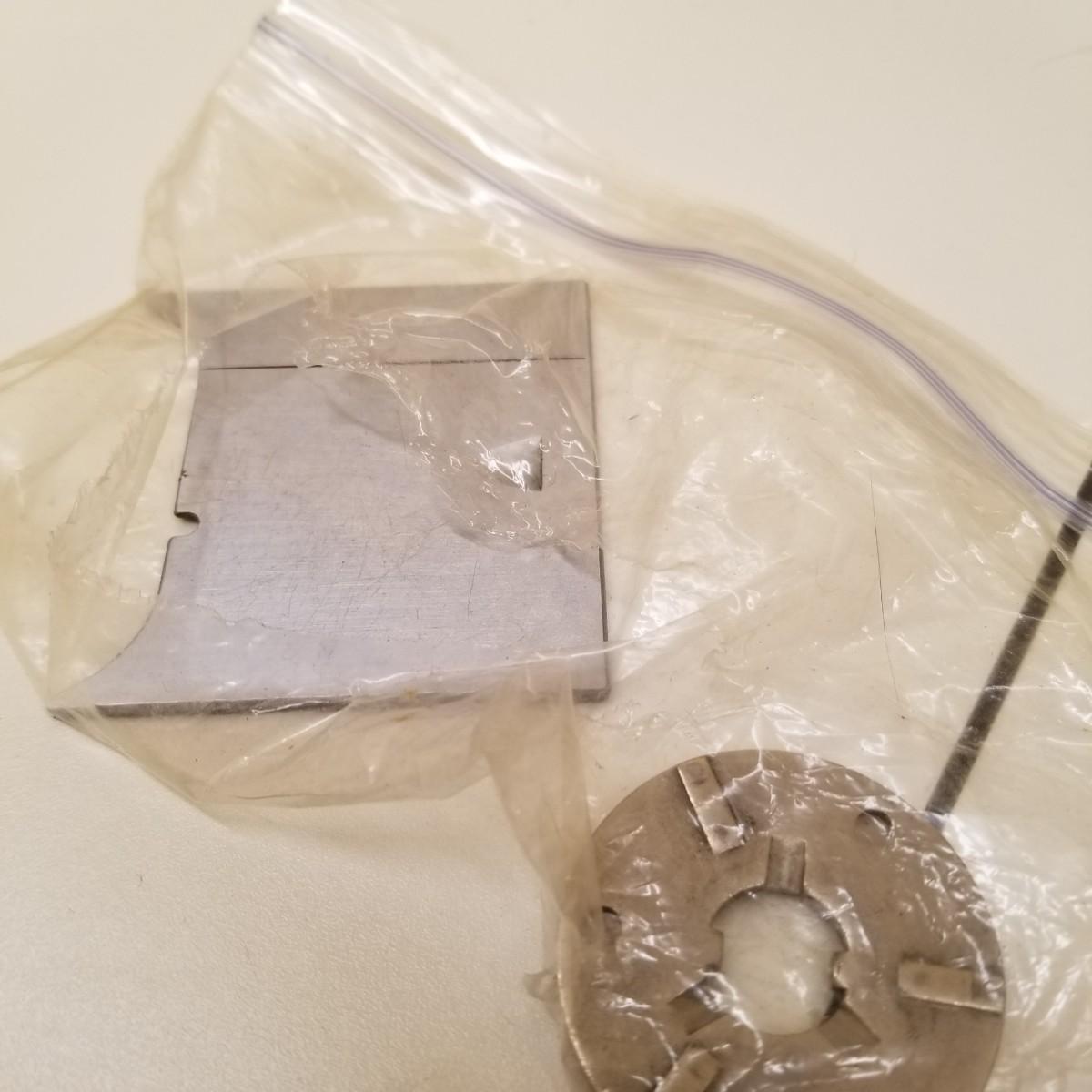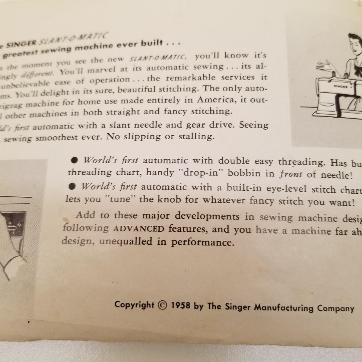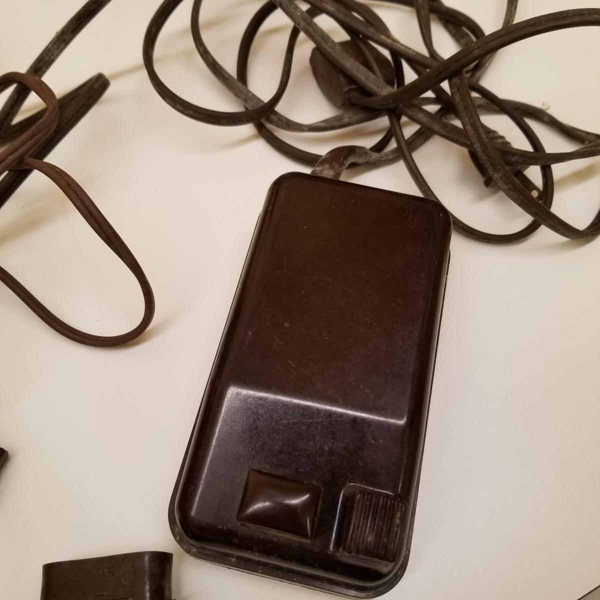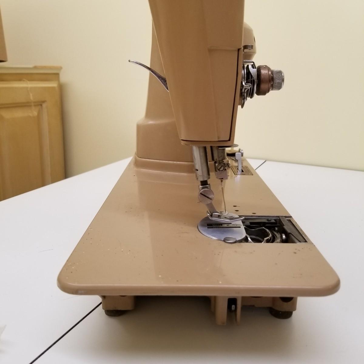 A pair of vintage Singers from their 400 series line. Both of these machines hail to late 50's date of manufacture. The 404 model is a little more basic while the 401A has the ability to use two needles and specialty discs to do pattern sewing and basic embroidery. Both machines power on but do not turn, will need cleaning and oiling. Footpedals and an accessory box of discs and parts are included.