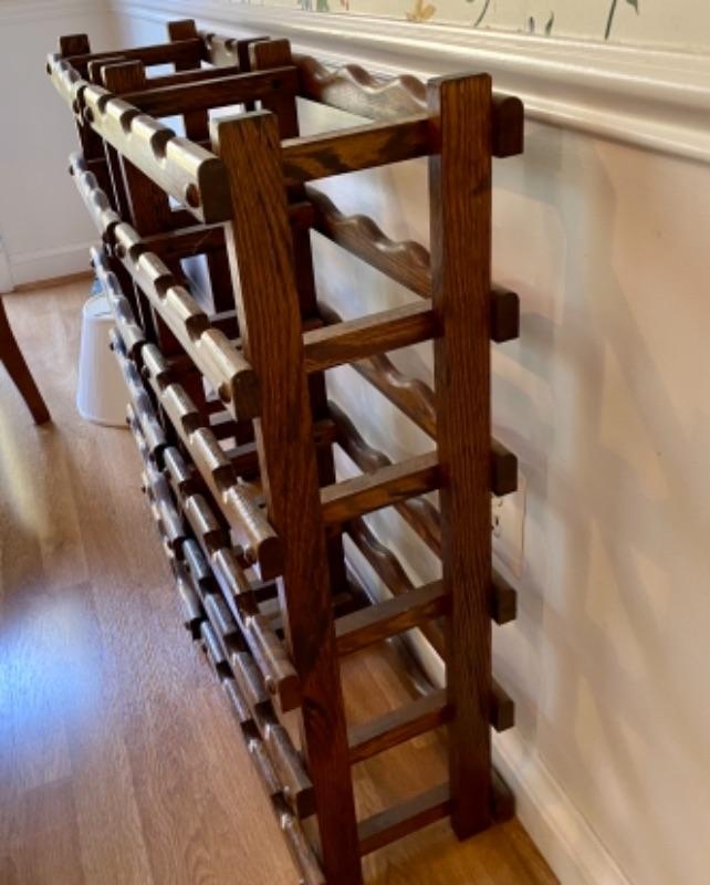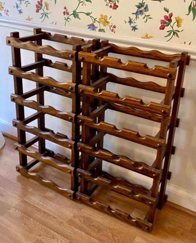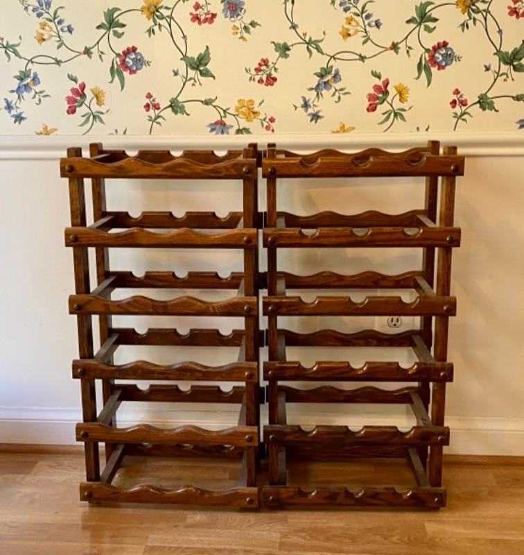 Great sturdy pair of 60s era wine holders - each 31” tall x 16 wide x 9 deep. Looks like stained sawn oak with studded screw covers.