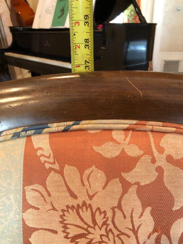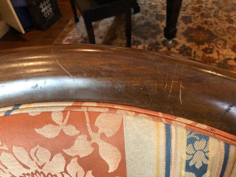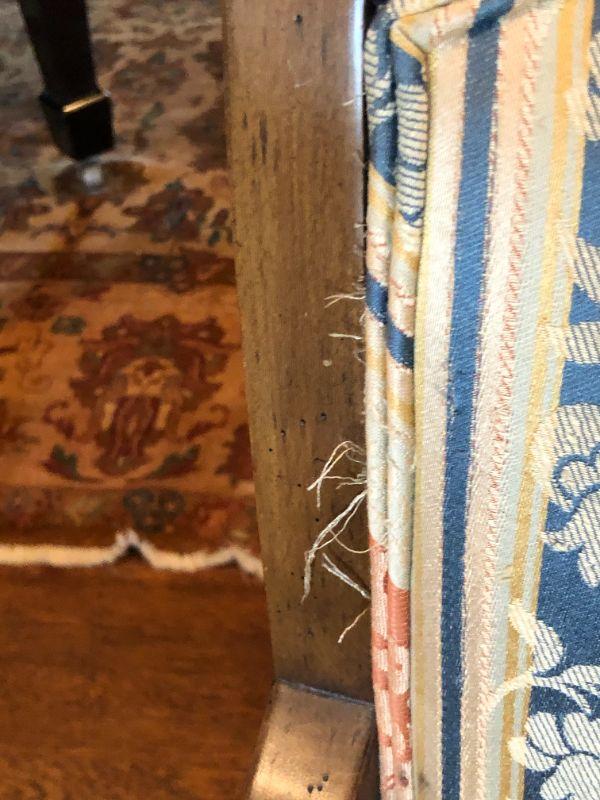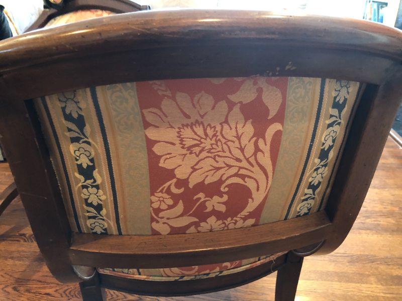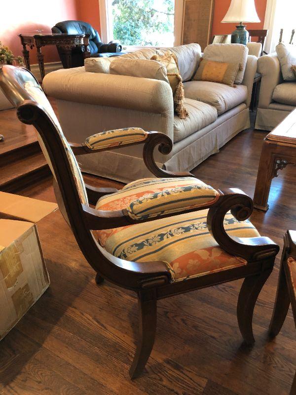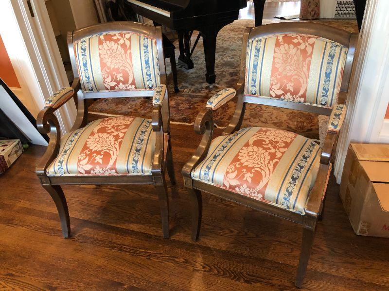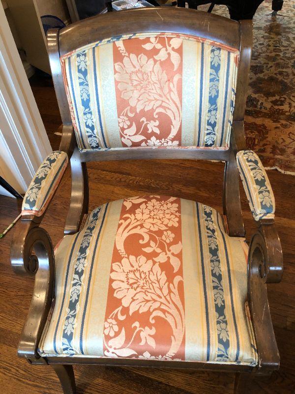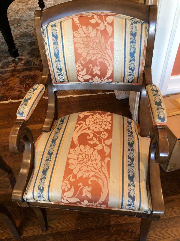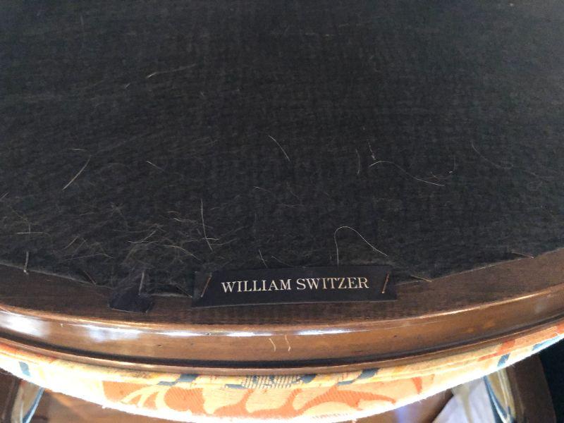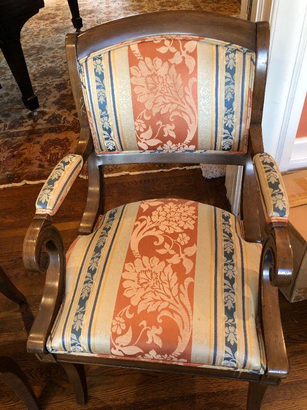 Beautiful pair of William Switzer arm chairs with an elegant fabric pattern and medium brown wood finish. Two arm chairs. In very good condition, with some signs of wear and fraying (shown in photos)