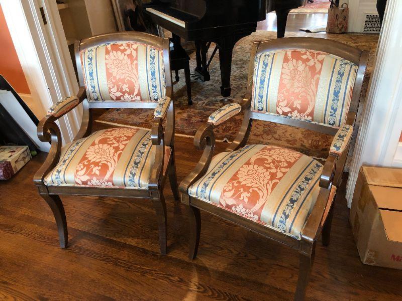 Pair William Switzer Arm Chairs with Medium Brown Wood and Pattern Fabric