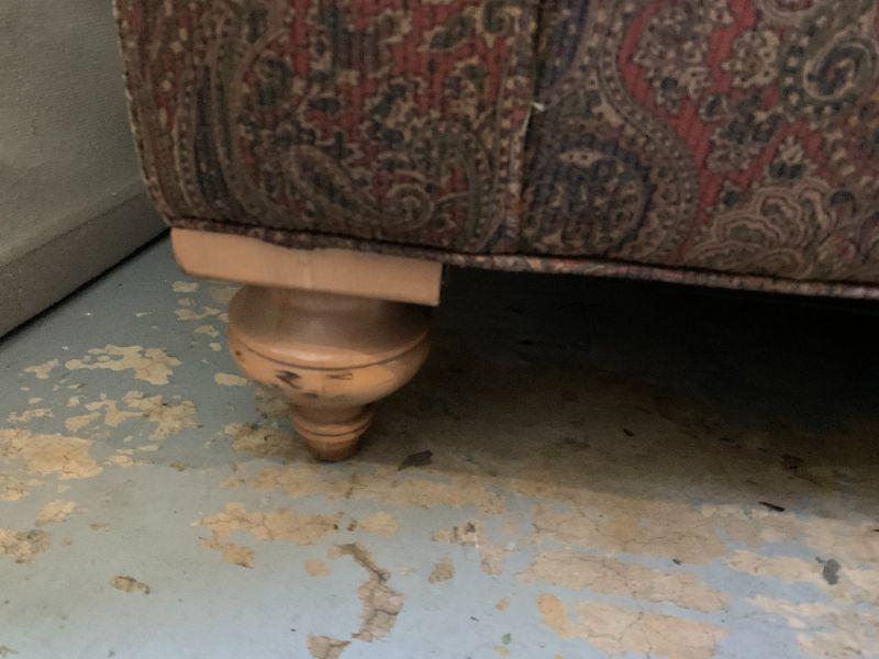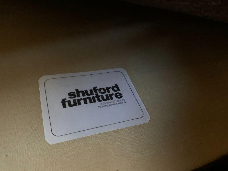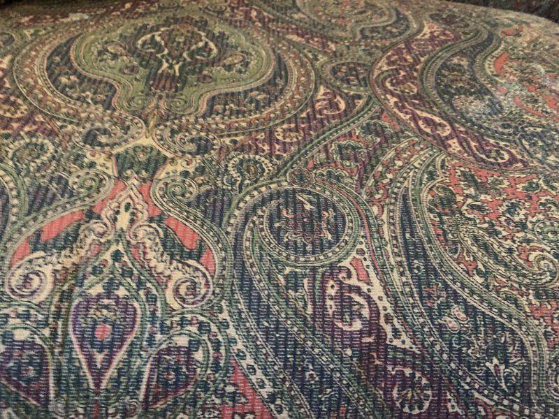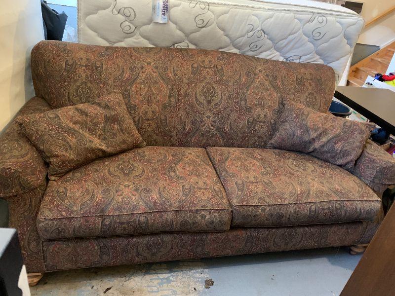 Red and brown base color paisley design sofa with arm covers and pillows. Made by Shuford Furniture. In overall goof condition.