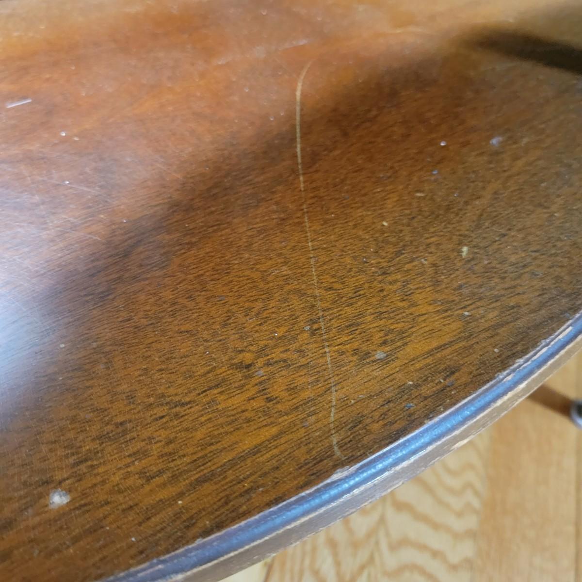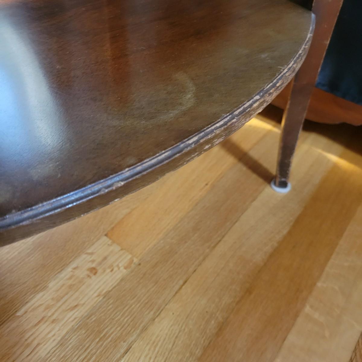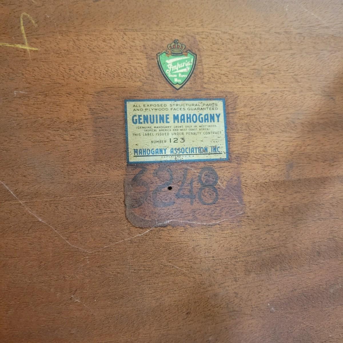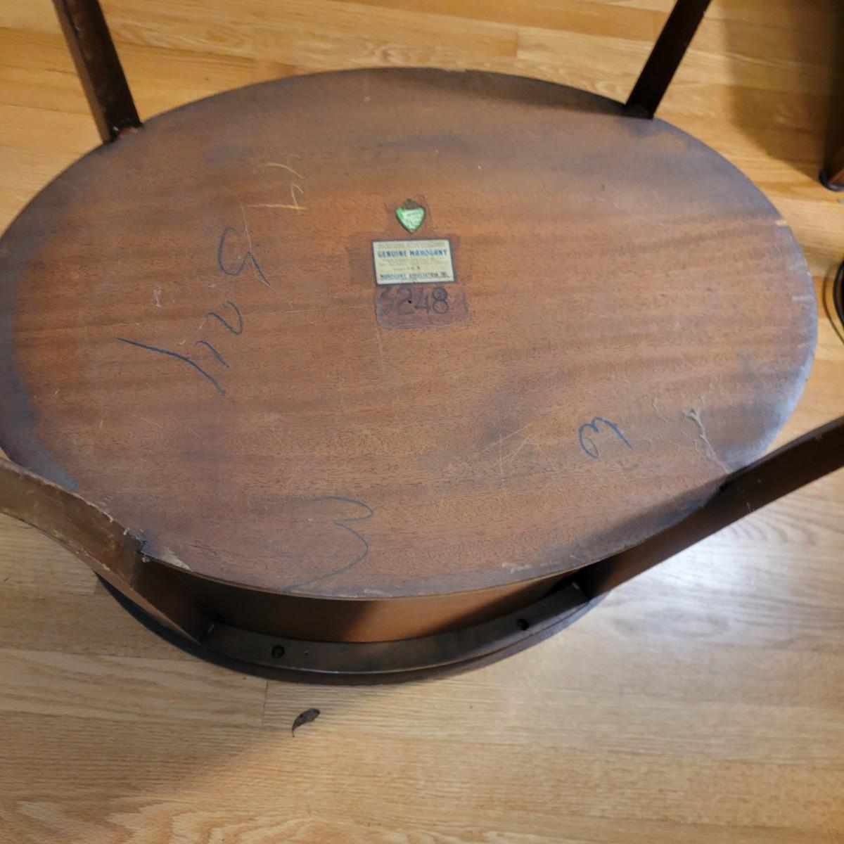 A pair of mahogany side tables manufactured by Imperial in good condition with some notable scratches. One of the pair has significantly more scratches on its surface than the other. Tables measure approximately 25" x 18" x 24". Local pickup only