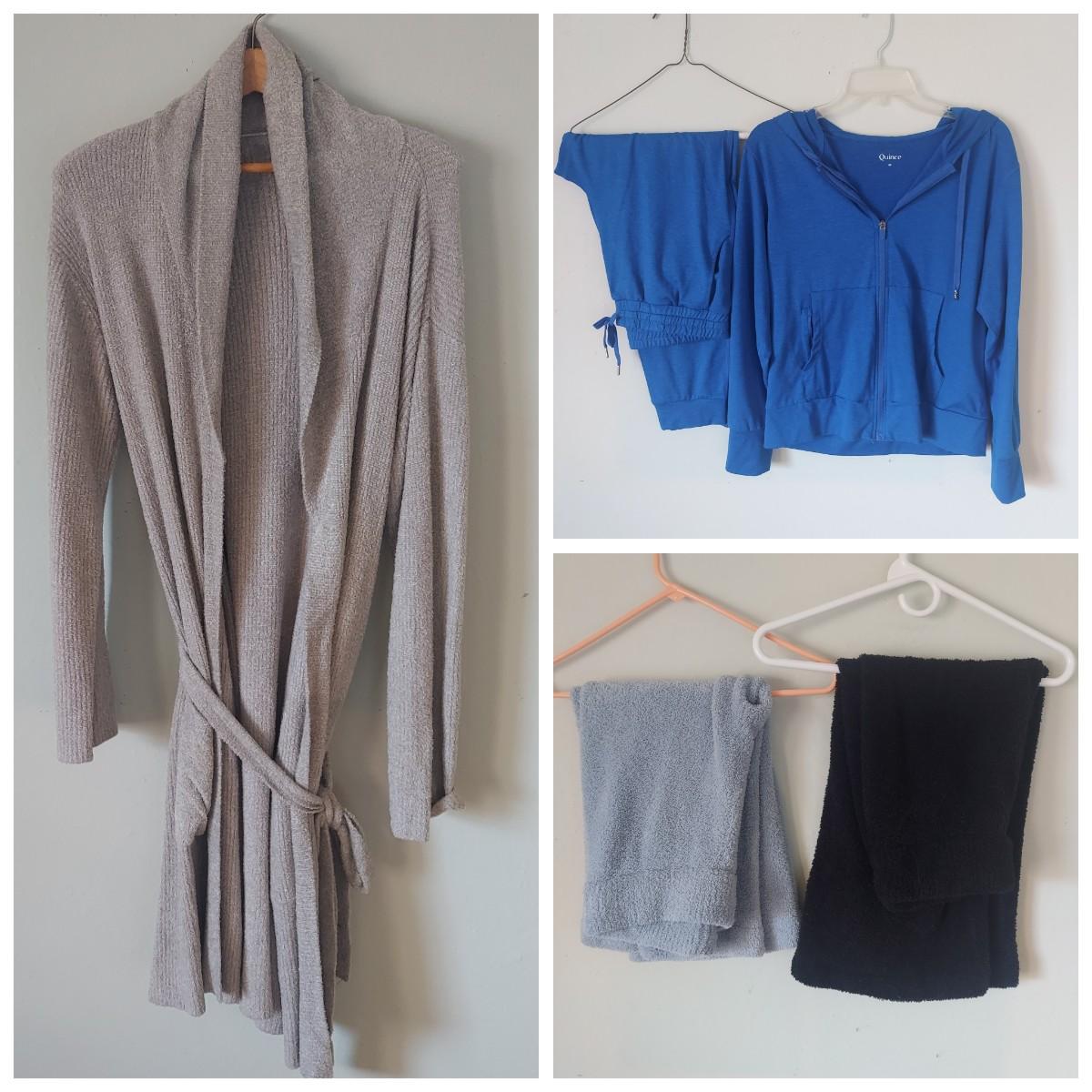 Several robes, pajamas and loungewear pieces. Includes an adult sleep sack and an over-sized snuggle pullover. Sizes vary. Please see photos for details. Shipping available