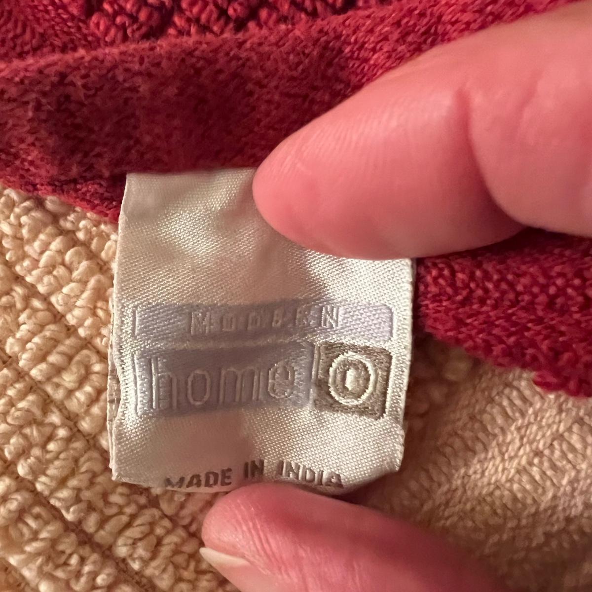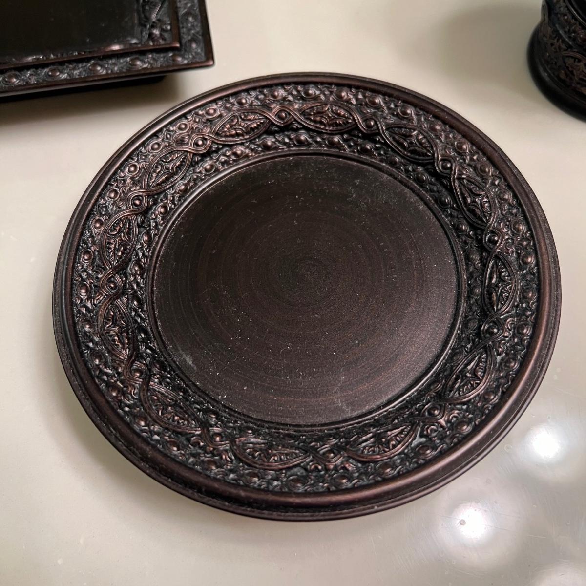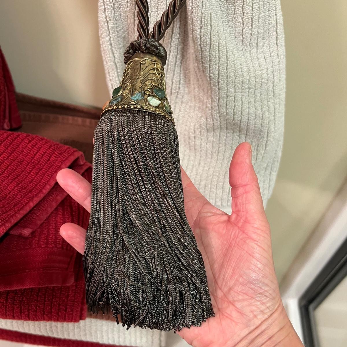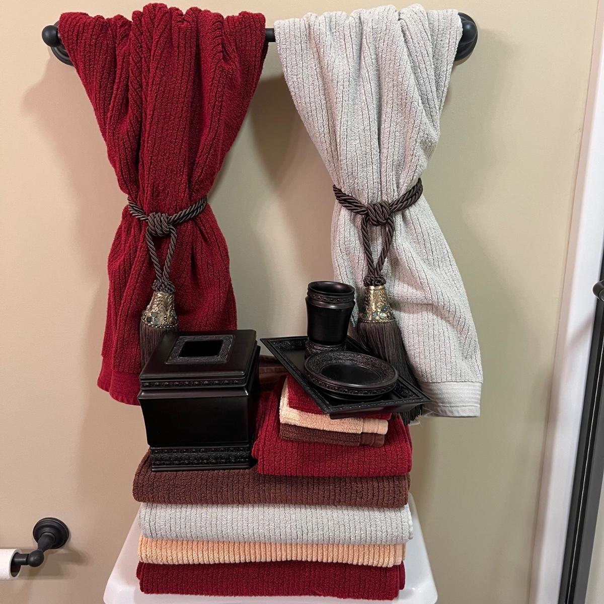 Four piece bathroom set labelled “˜Palazzo’, with a burnished bronze colored finish on what appears to be a hard resin like material. Also included are six large bath towels and a couple of hand and face towels. A pair of tassel tie backs also included. Towel rail is not included.