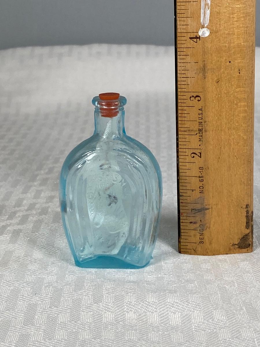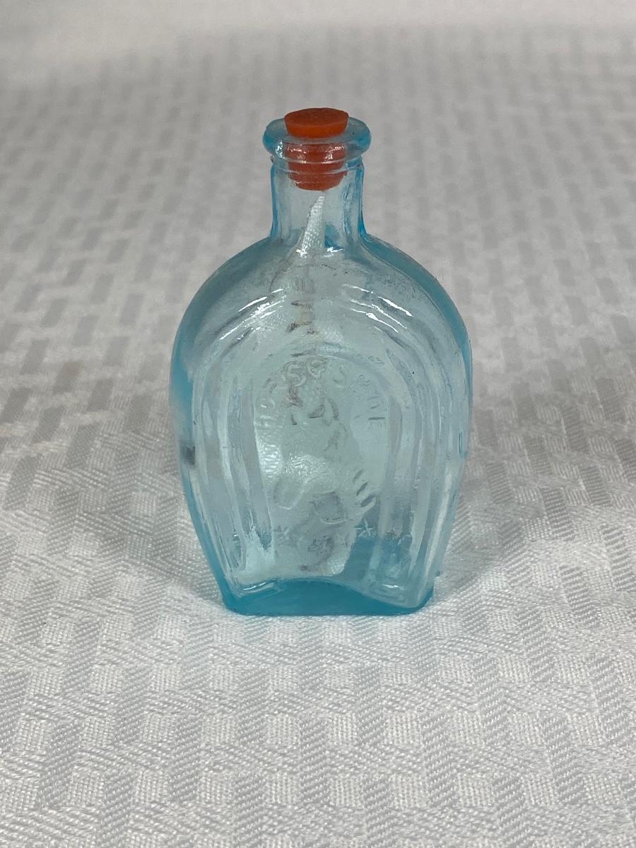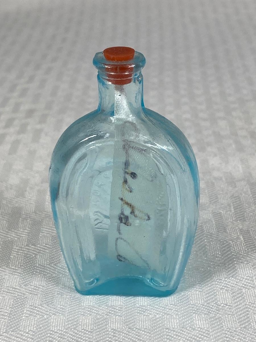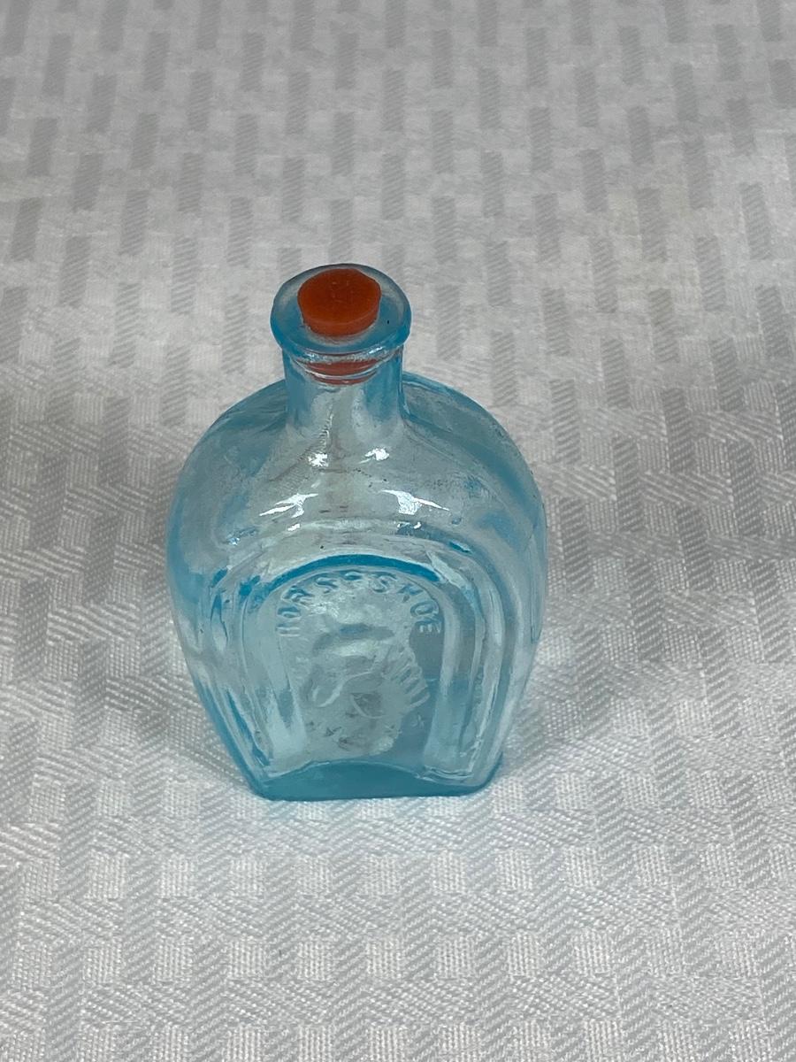 Pale blue miniature glass bottle with rubber stopper. Embossed horse head and shoe with Horseshoe written across the top of image. Inside is a ribbon with writing on it, can't make out the words completely because of fade through the years. In good condition. About 3" tall.