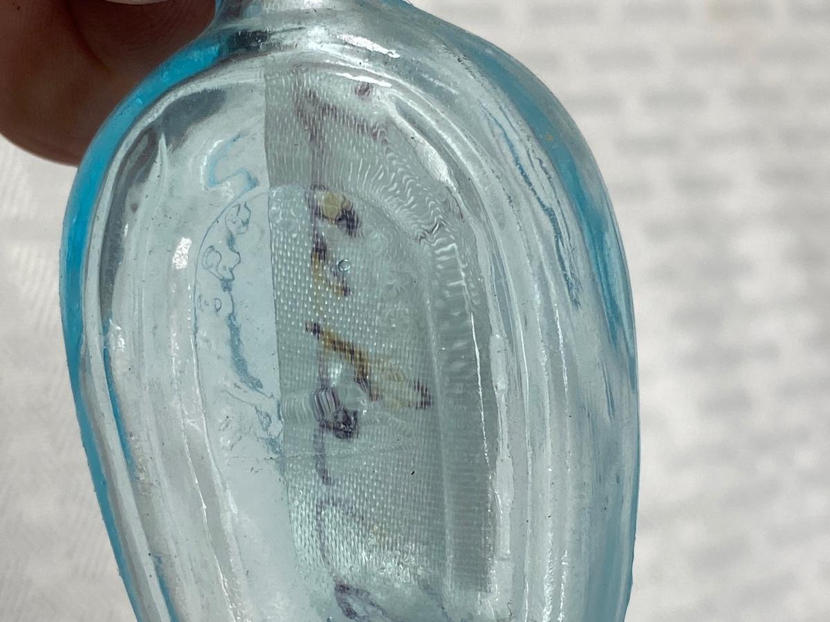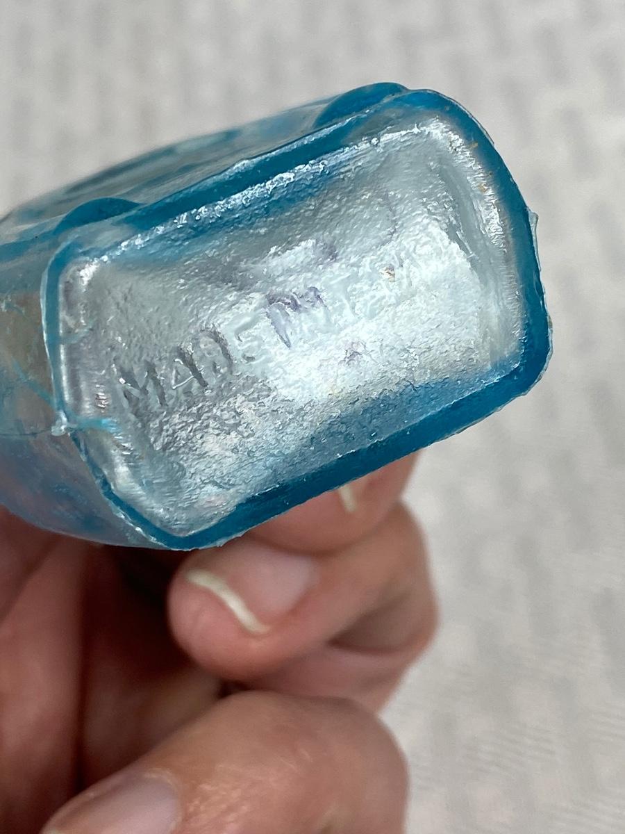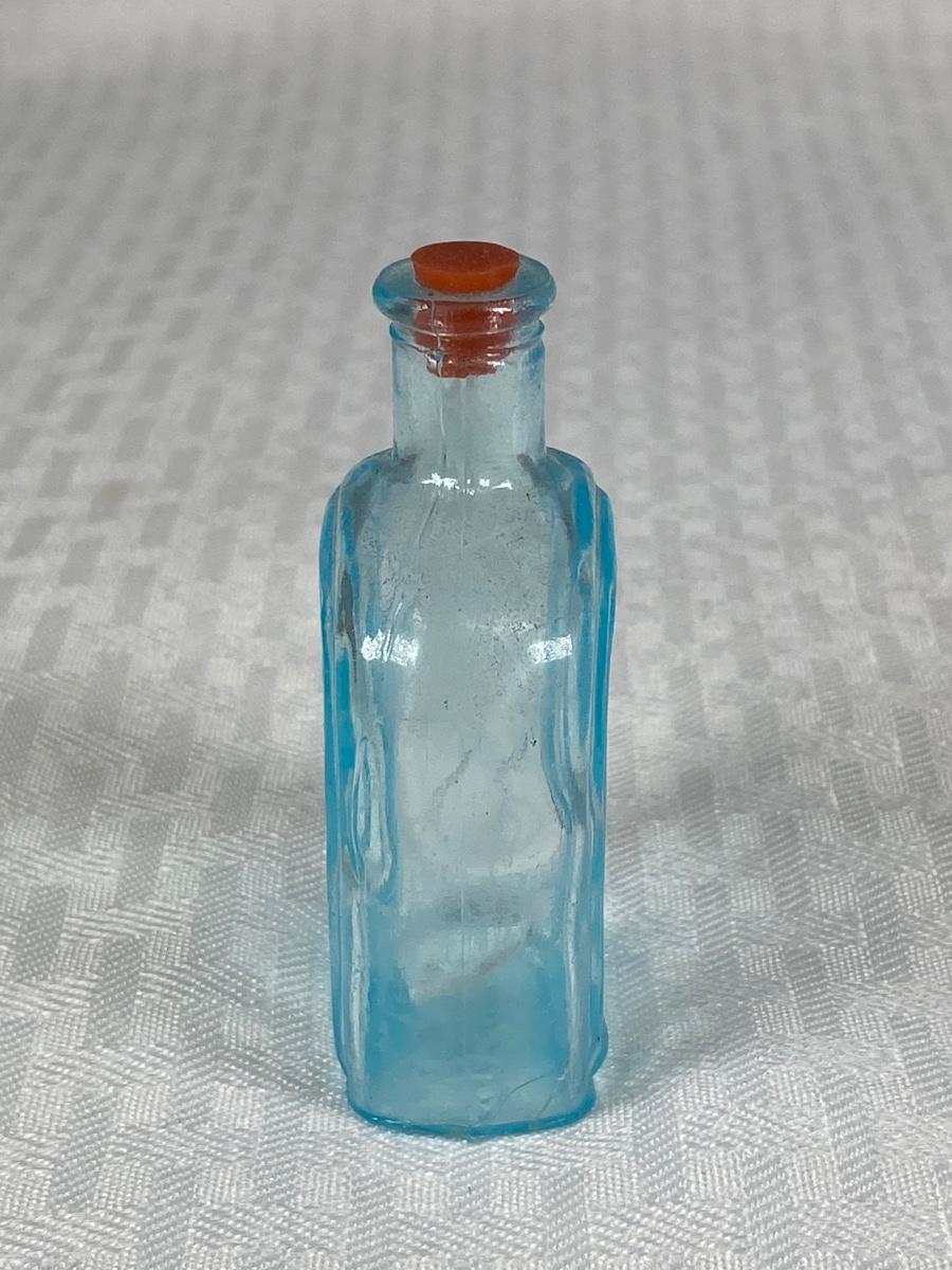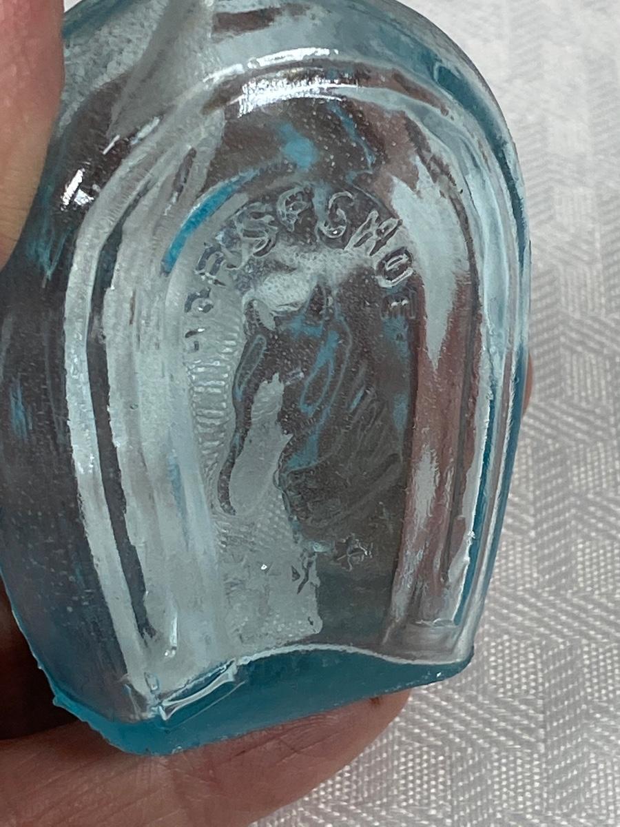 Pale blue miniature glass bottle with rubber stopper. Embossed horse head and shoe with Horseshoe written across the top of image. Inside is a ribbon with writing on it, can't make out the words completely because of fade through the years. In good condition. About 3" tall.