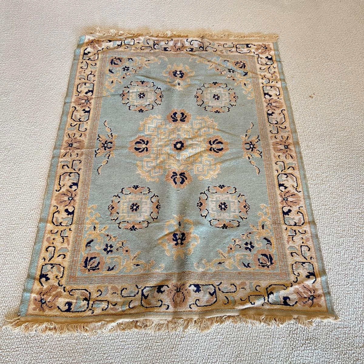 A very pretty small area rug has a pale blue background with dark cream and dark blue accents. Short wool fringe is in good condition. Measures 43” x 60”.