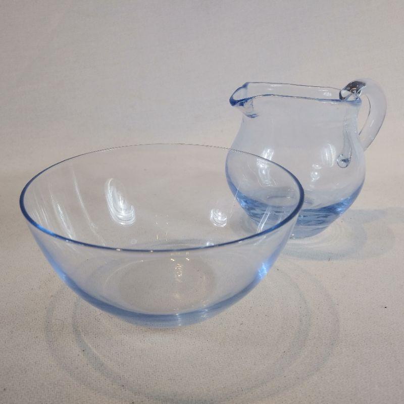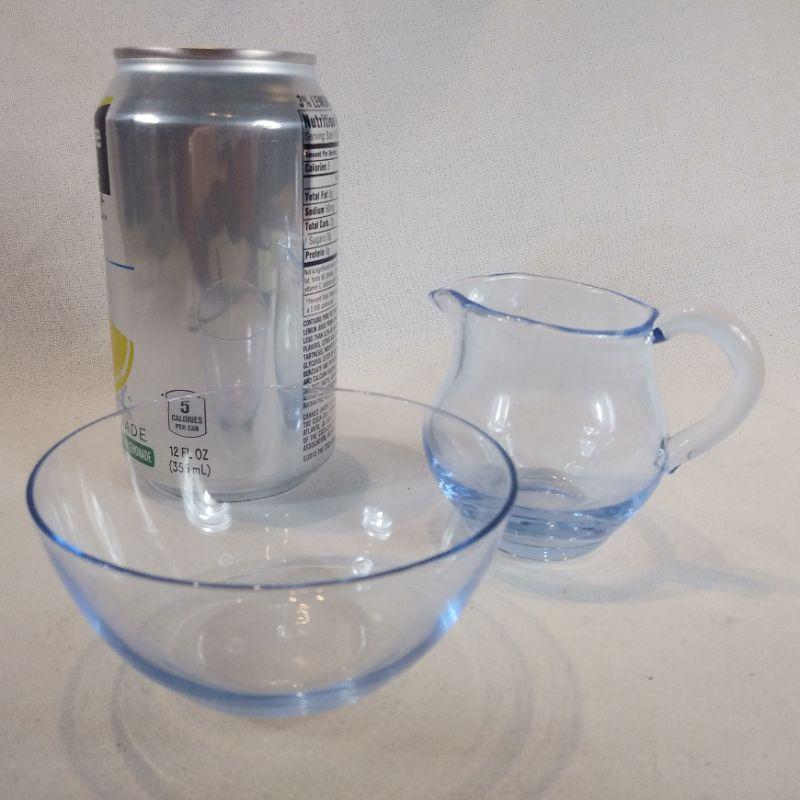 This is a small, very sweet., soft blue glass sugar and creamer set. The sugar measures 3 1/2-inch in diameter with the creamer at 2 1/2-inches tall. No chip or cracks in very good condition. Can be used for sauces or syrups, too.