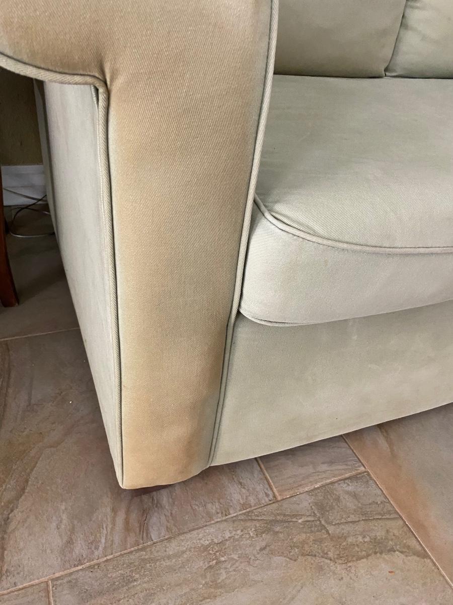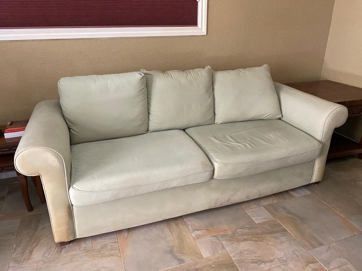 Pale Colored Sofa Couch. No holes but does need to be cleaned. Full size about 7' to 8'. Looks like a very pale mint color.