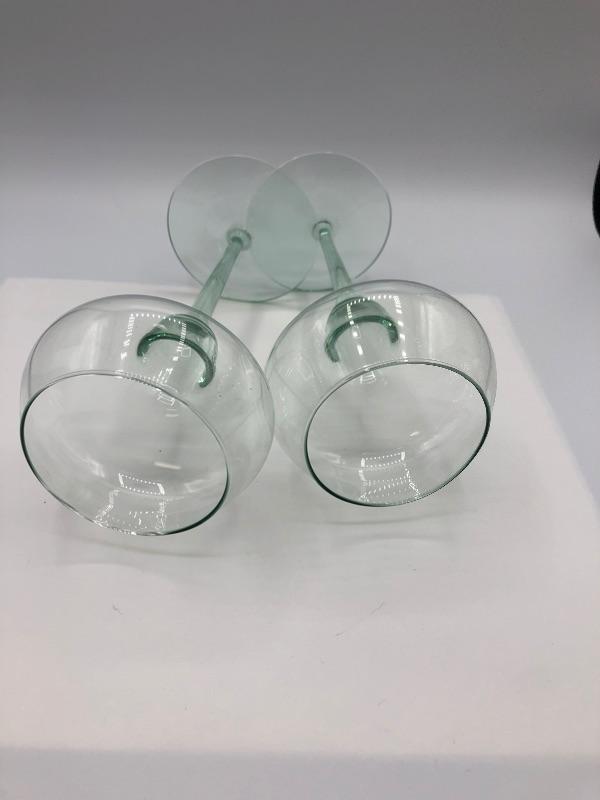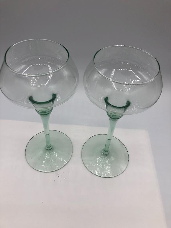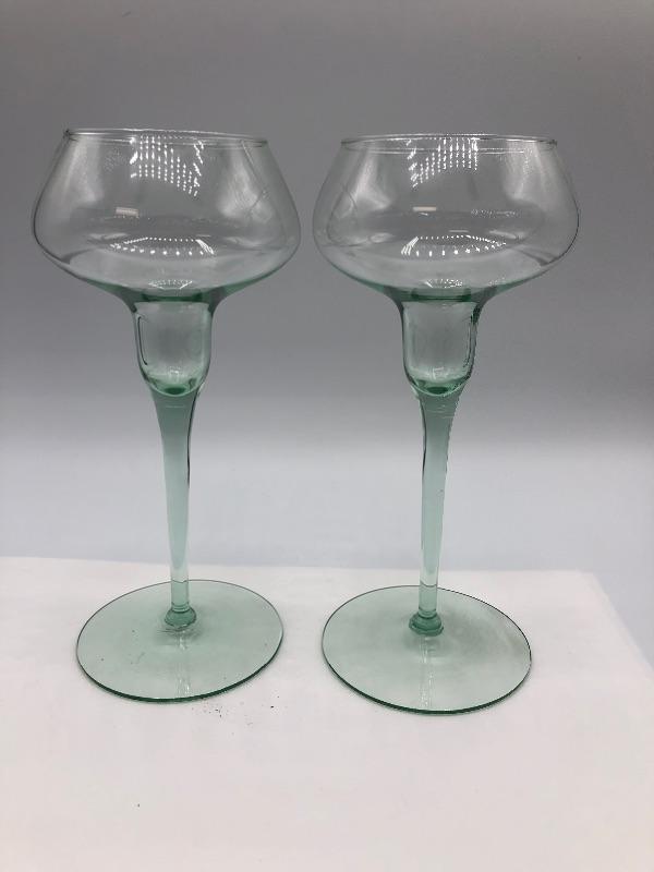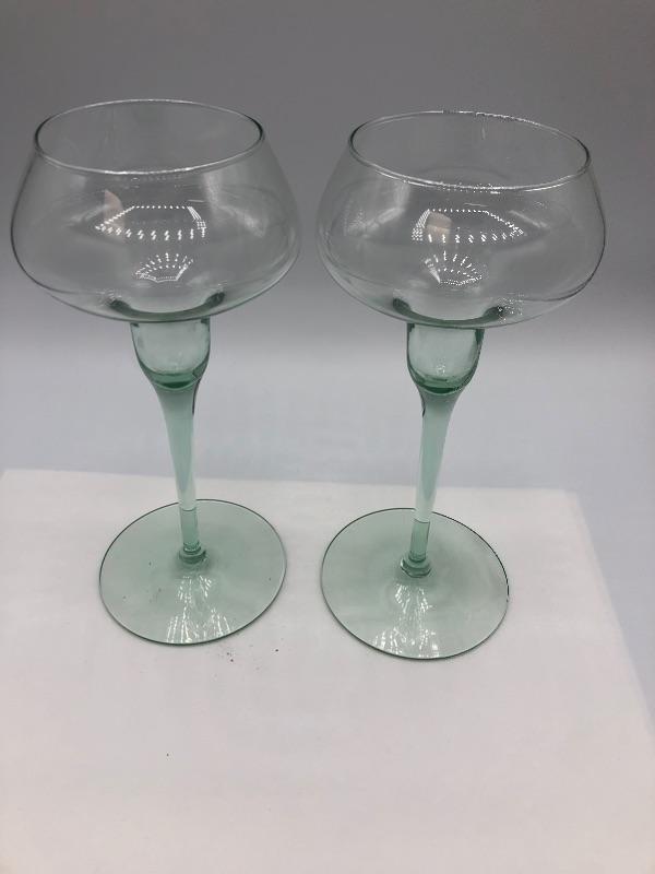 Pair of pale green glass candle holders. Goblet style. Can hold tapers or votives. Good Condition.