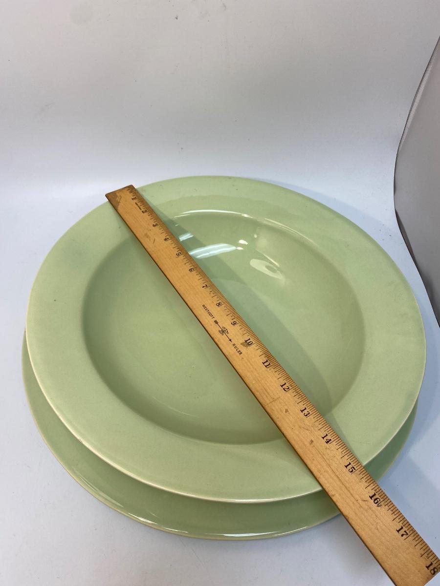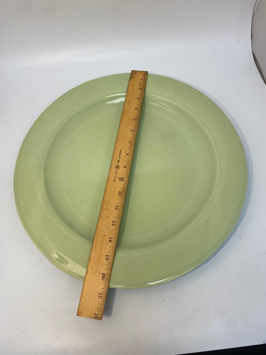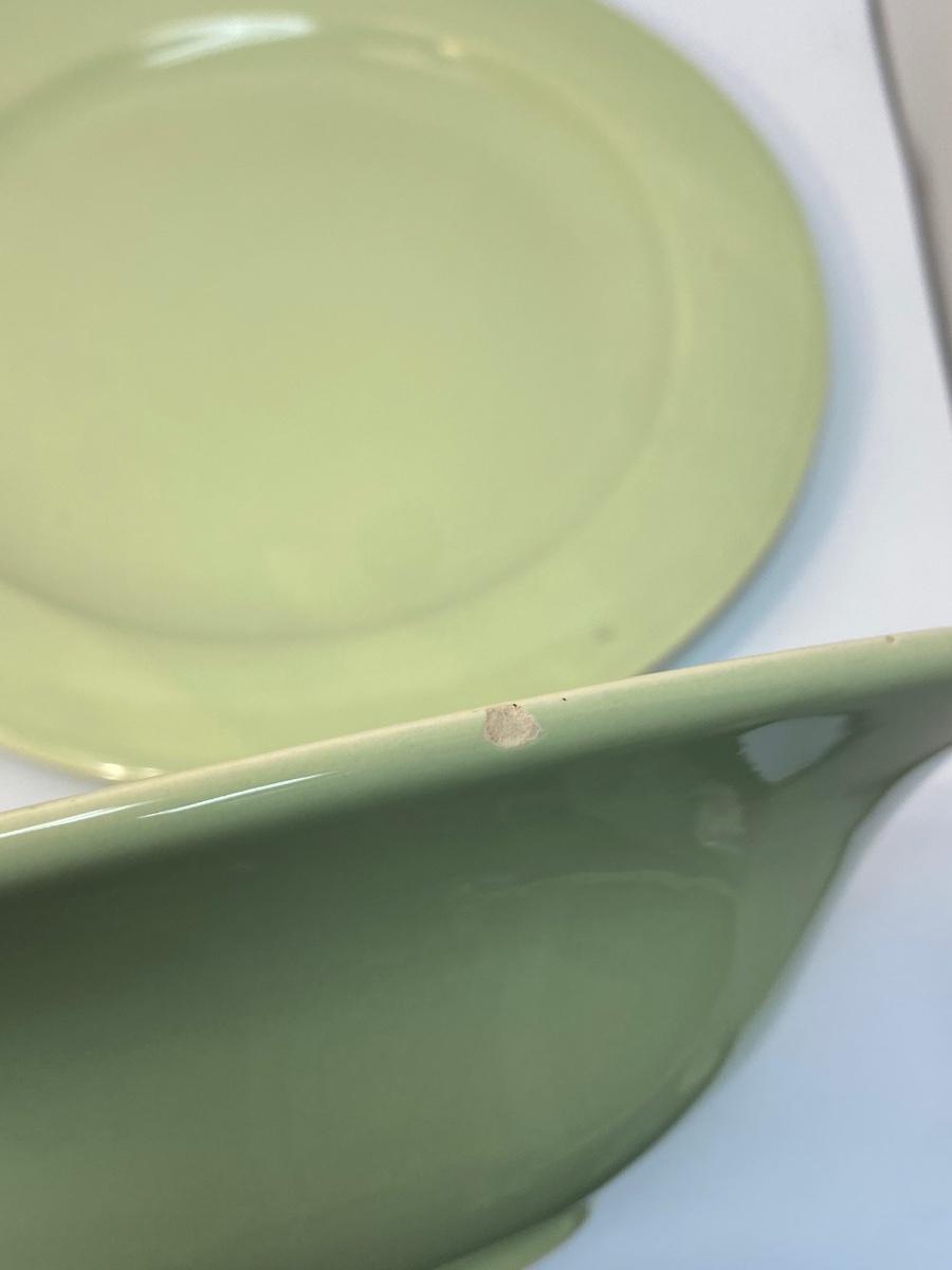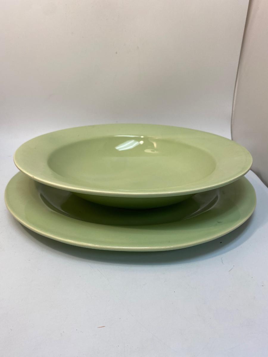 Pale Green Large Pasta Serving Bowl with Platter Americaware Portugal. Bowl and platter have a chip along the edge. About 15" diameter size.