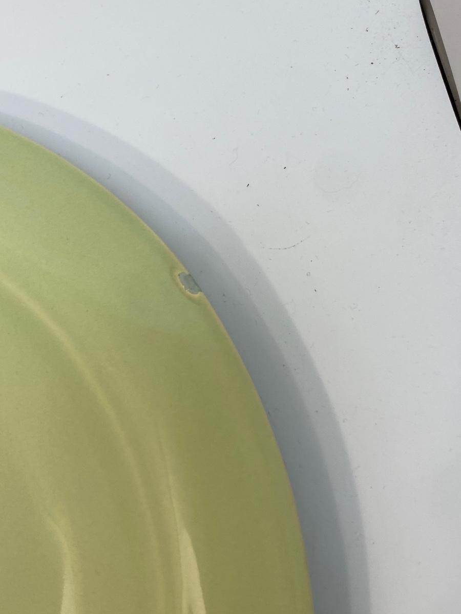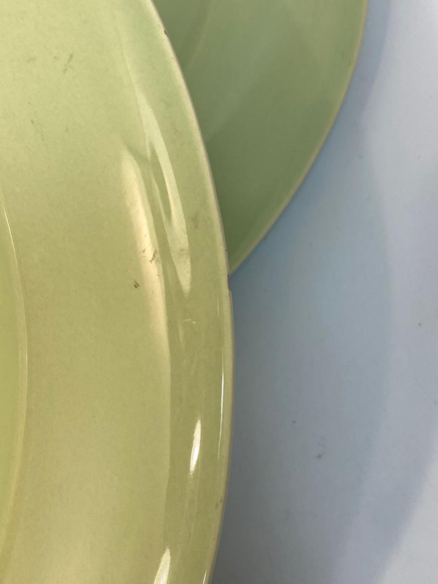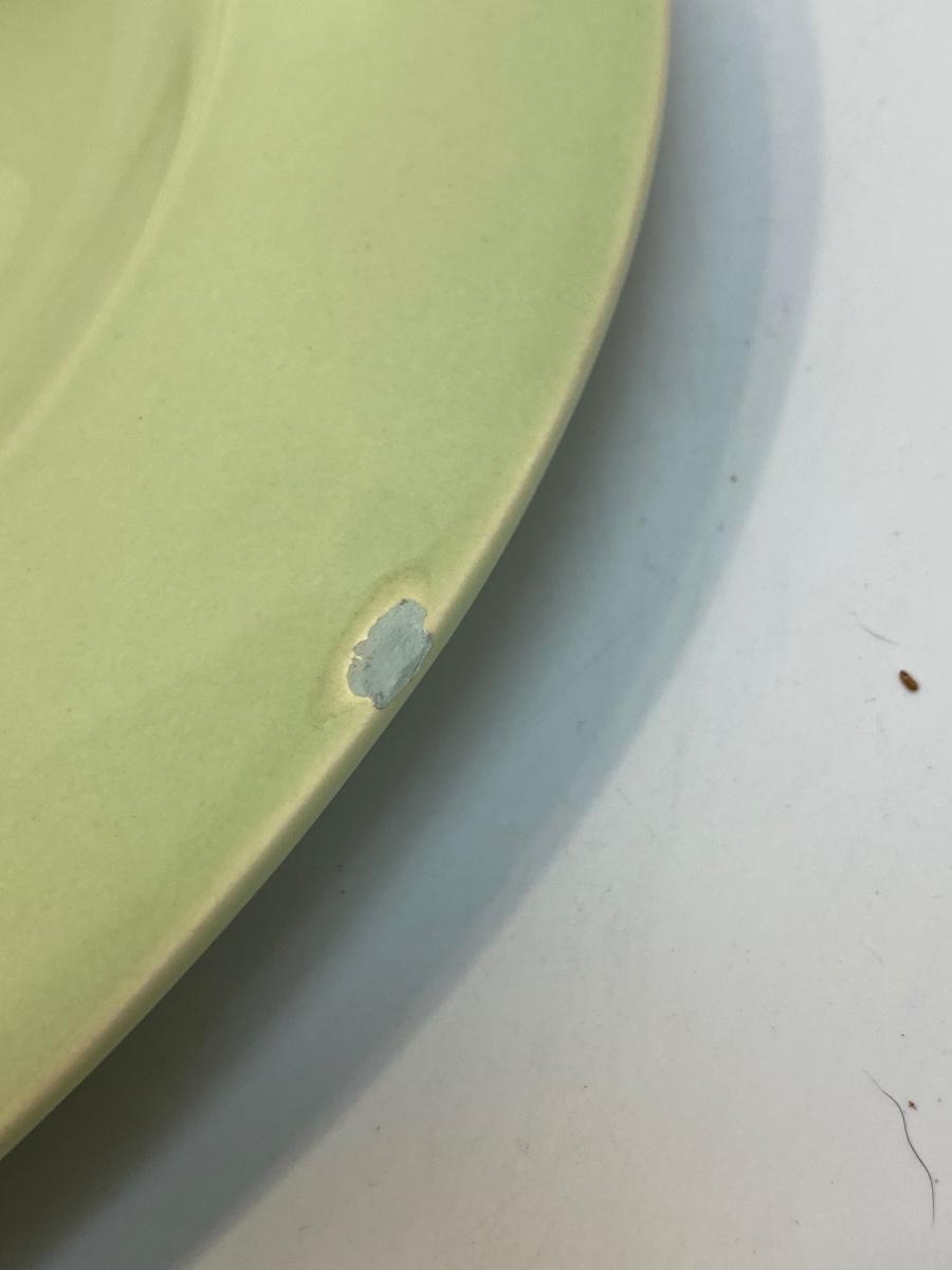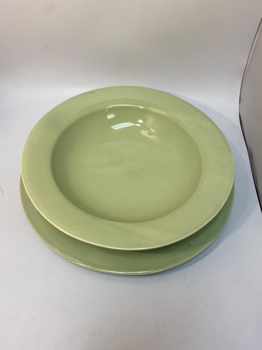 Pale Green Large Pasta Serving Bowl with Platter Americaware Portugal. Bowl and platter have a chip along the edge. About 15" diameter size.