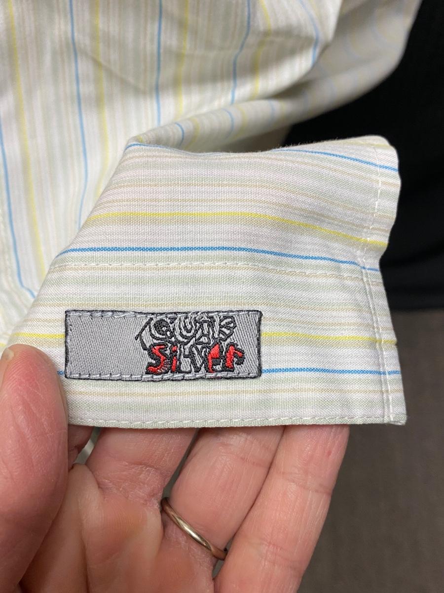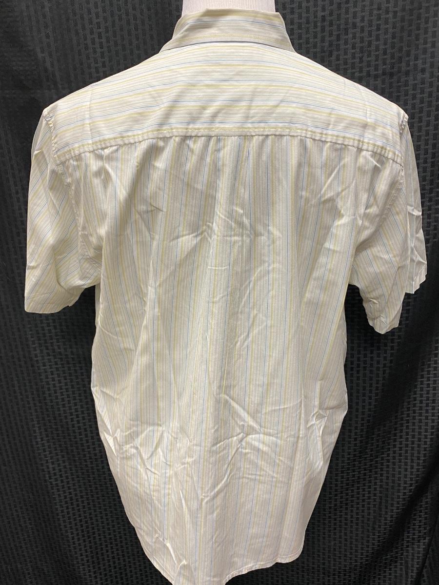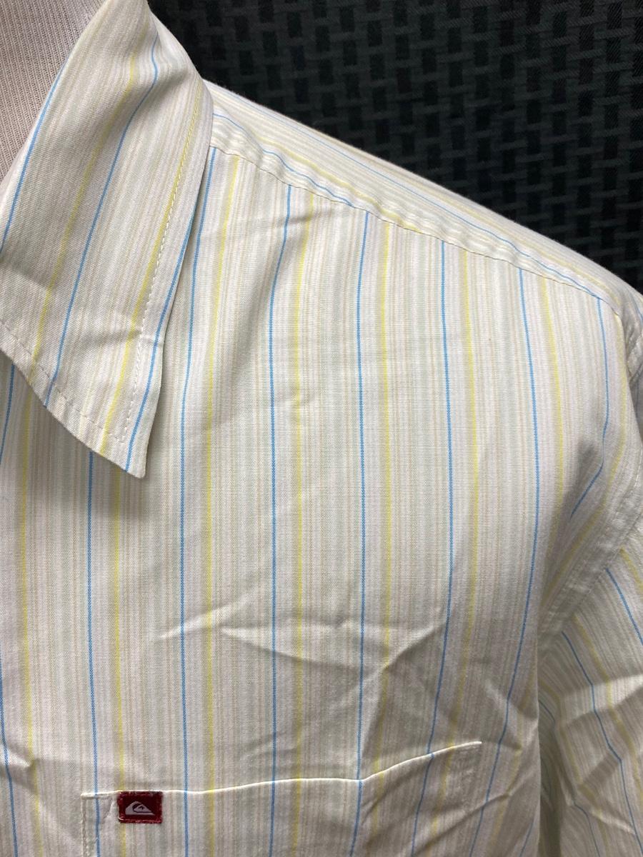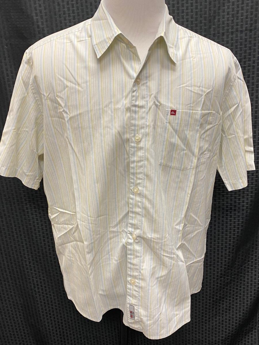 Pale yellow and blue pin stripe button front shirt from Quiksilver. Size large, good condition.