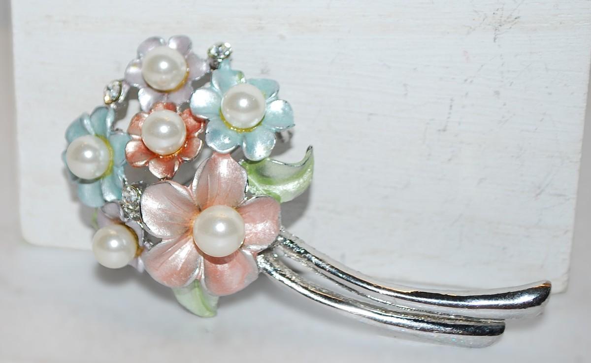 Pale PINK & BLUE Flowers with Faux PEARLS BROOCH (2¾" x 1½") on a Silver Tone Setting