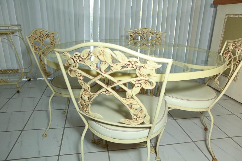 Pale yellow citrus blossom dining set. Wrought iron and glass table with four chairs. Chairs do not have arms with this set. Round table with pedestal like base. Good vintage condition.