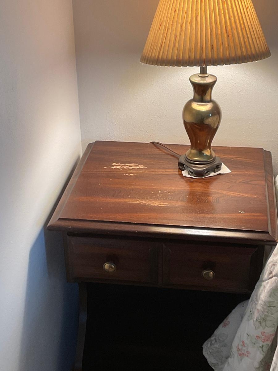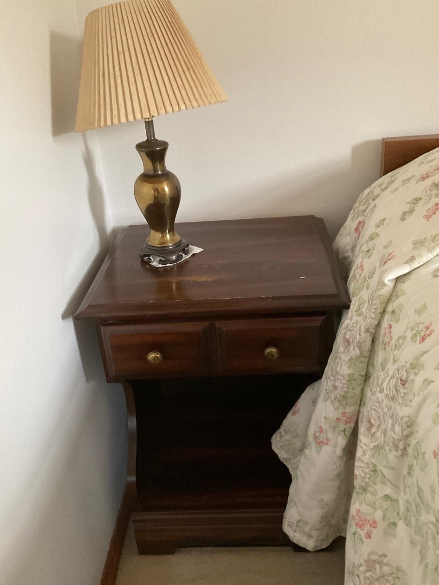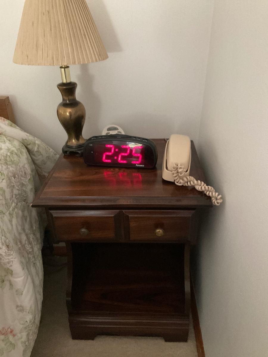 Includes 2 nightstands, lamps and alarm clock