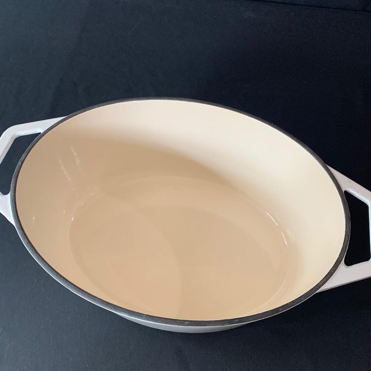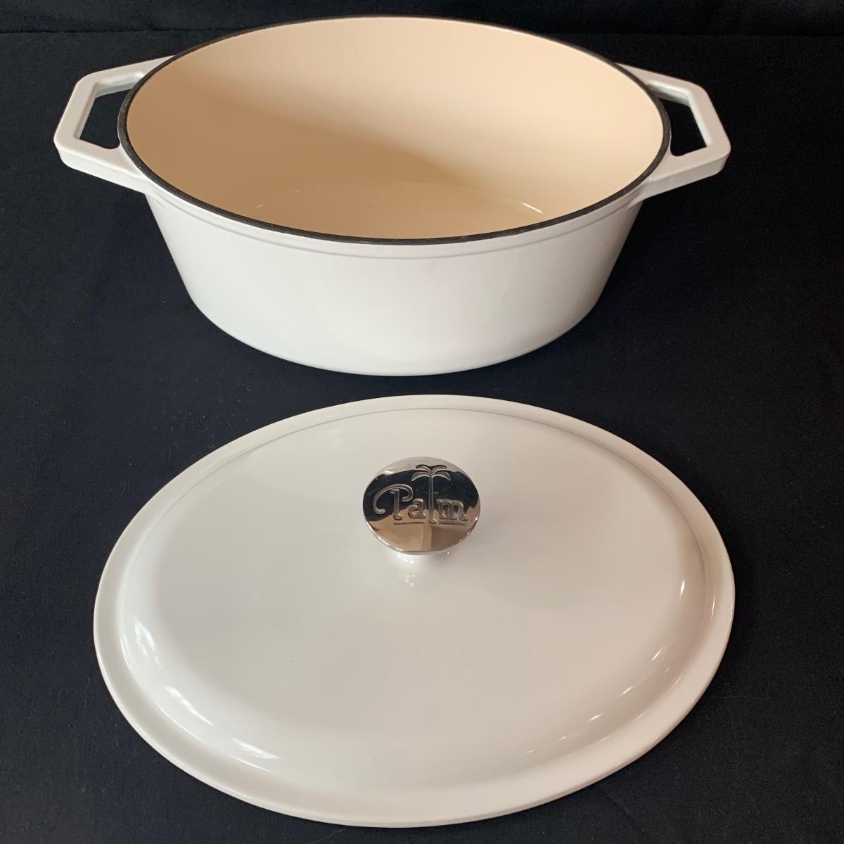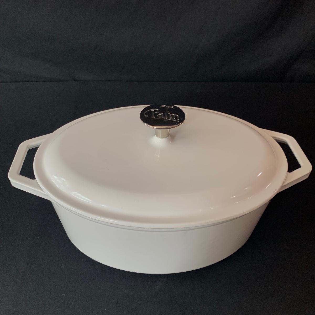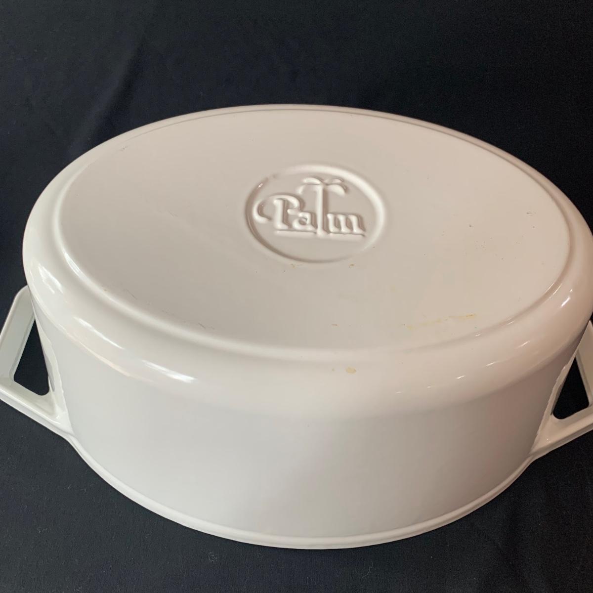 White colored Palm brand roasting dish. Dish feels like heavy duty enameled cast iron. Without the lid the dish measures 11” x 8.5”. There is a small chip shown in an image.