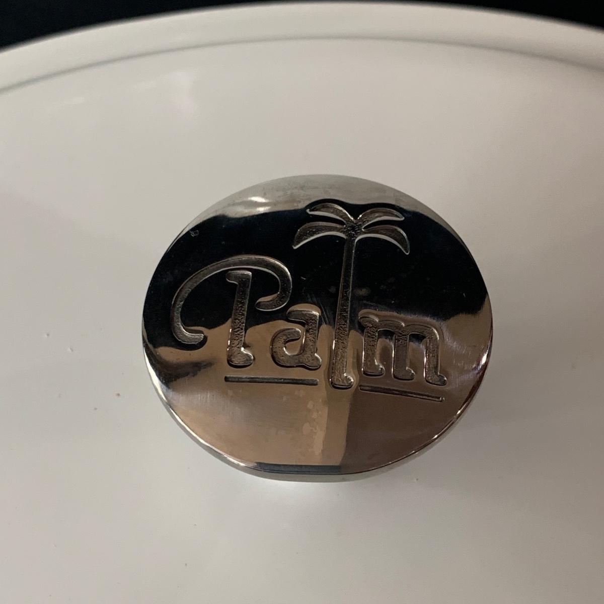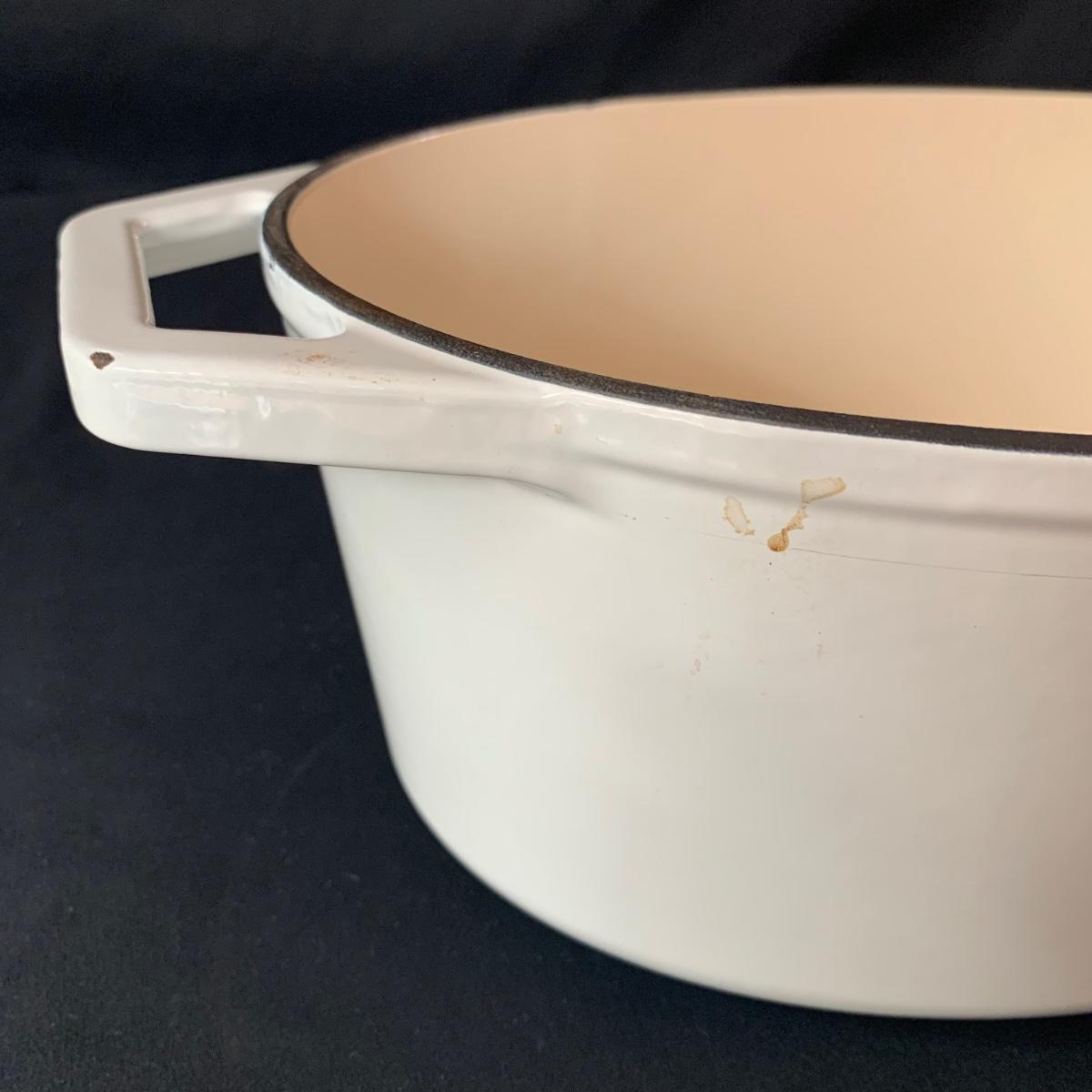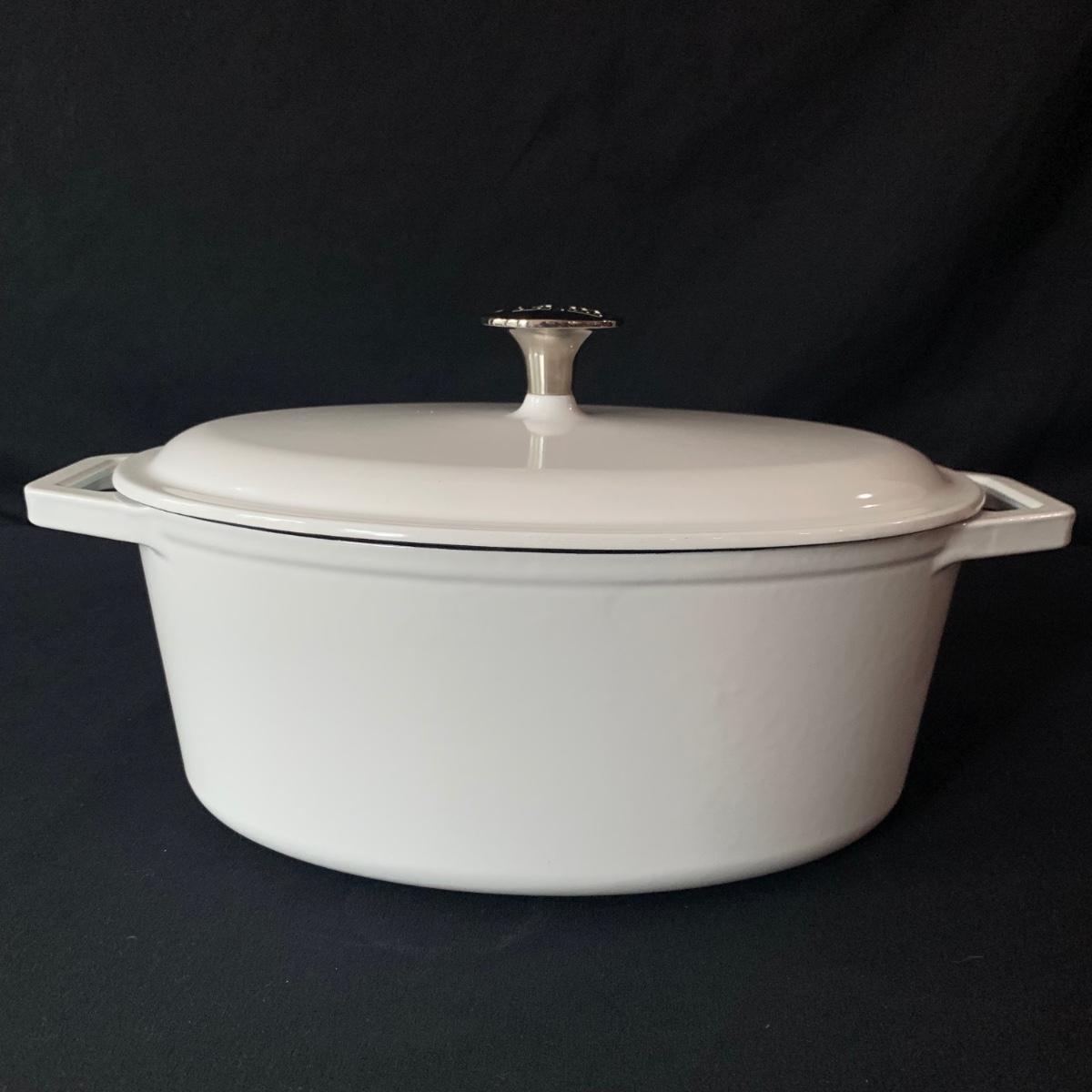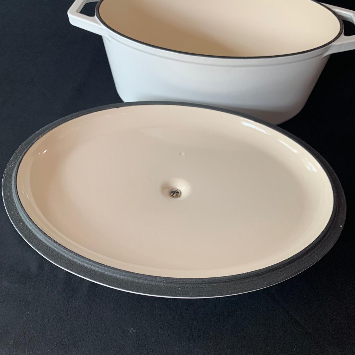 White colored Palm brand roasting dish. Dish feels like heavy duty enameled cast iron. Without the lid the dish measures 11” x 8.5”. There is a small chip shown in an image.