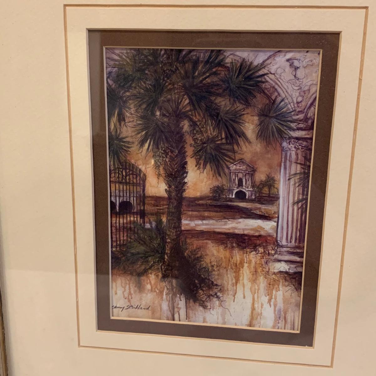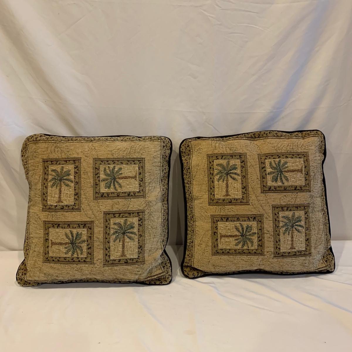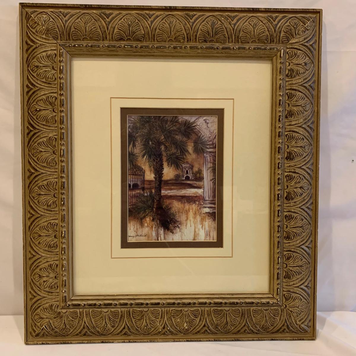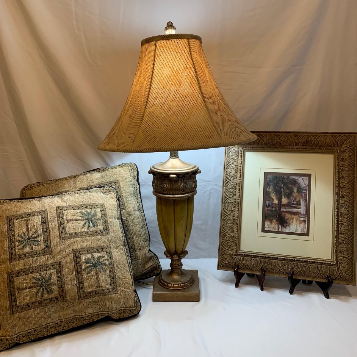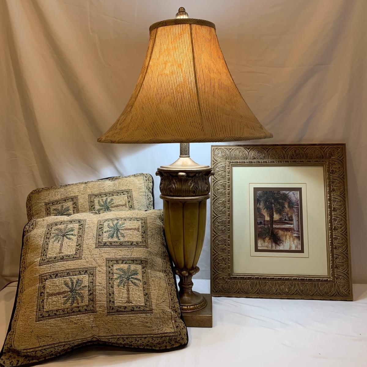 In this collection of items there are two palm tree throw pillows, a framed print of palm tree art, and a lovely ornate gilded lamp. The pillows are approximately 16”sq. The carved wooden frame is 16” x 18” and the print is framed with double mat boards and is behind glass. The lamp is 31” tall and feels like it is made of resin. It powered on when plugged in.