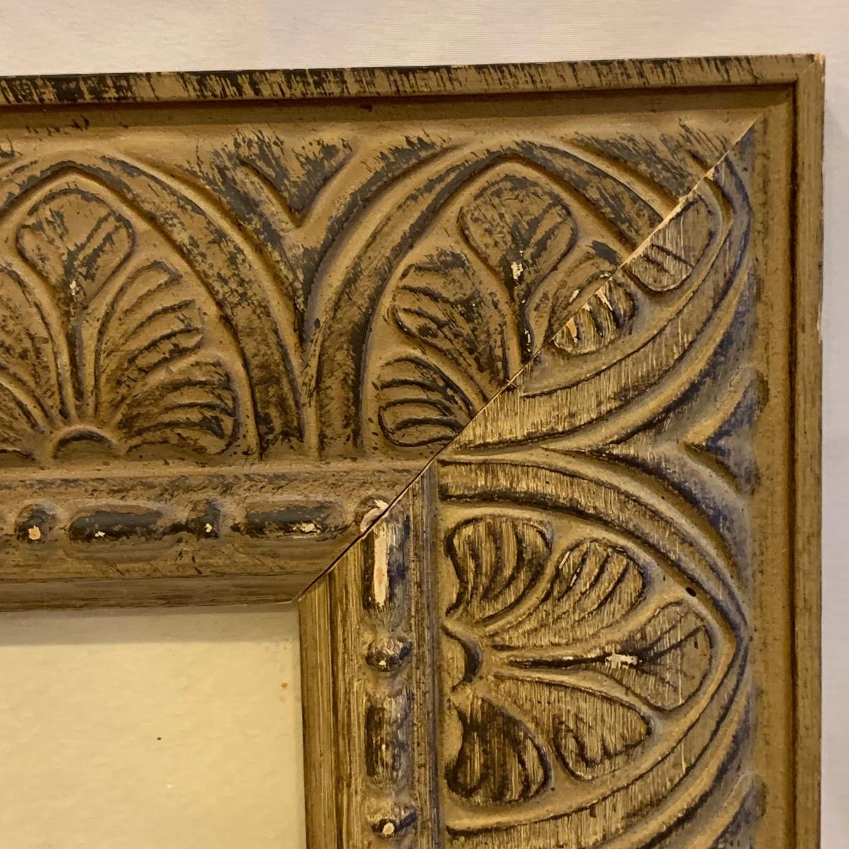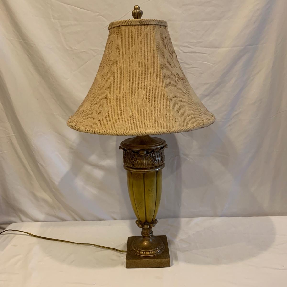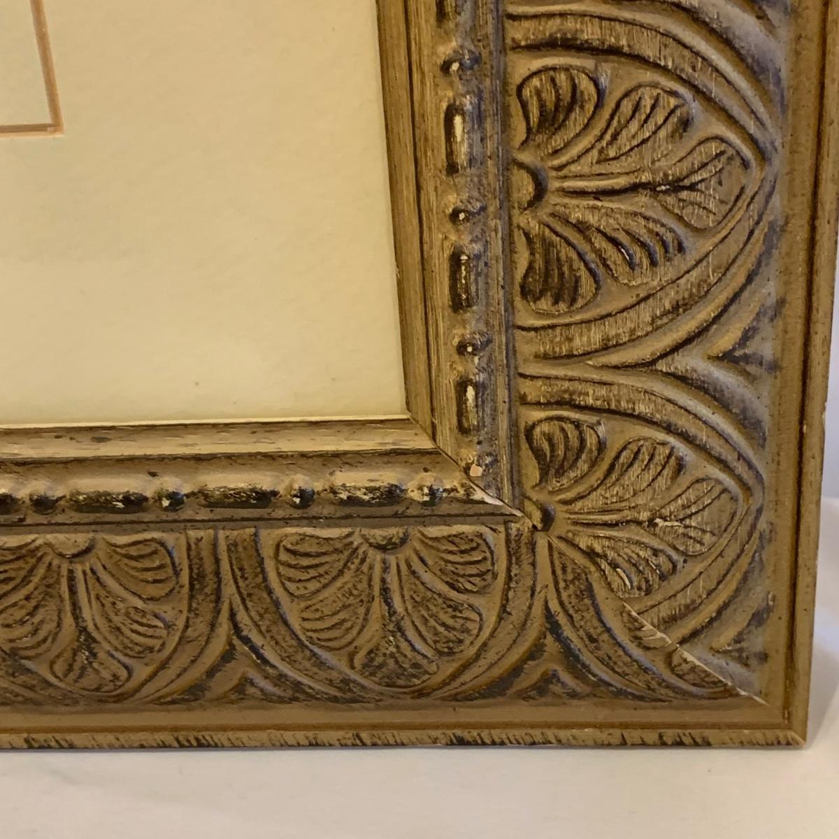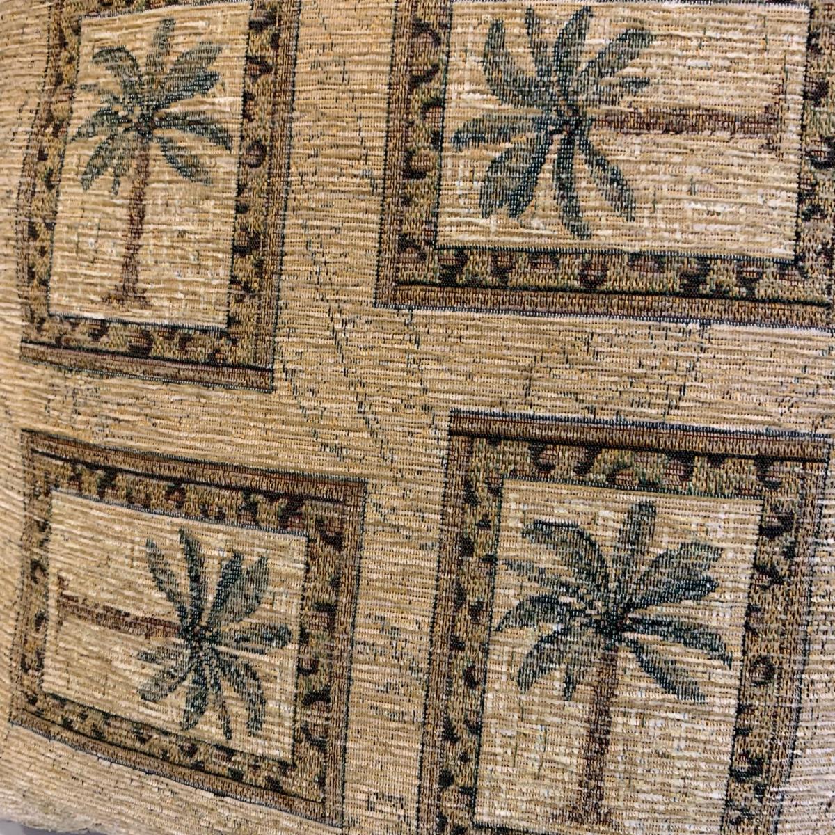 In this collection of items there are two palm tree throw pillows, a framed print of palm tree art, and a lovely ornate gilded lamp. The pillows are approximately 16”sq. The carved wooden frame is 16” x 18” and the print is framed with double mat boards and is behind glass. The lamp is 31” tall and feels like it is made of resin. It powered on when plugged in.