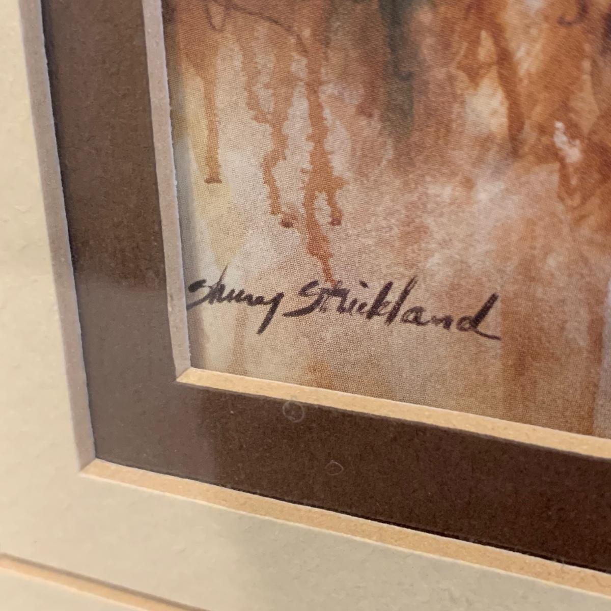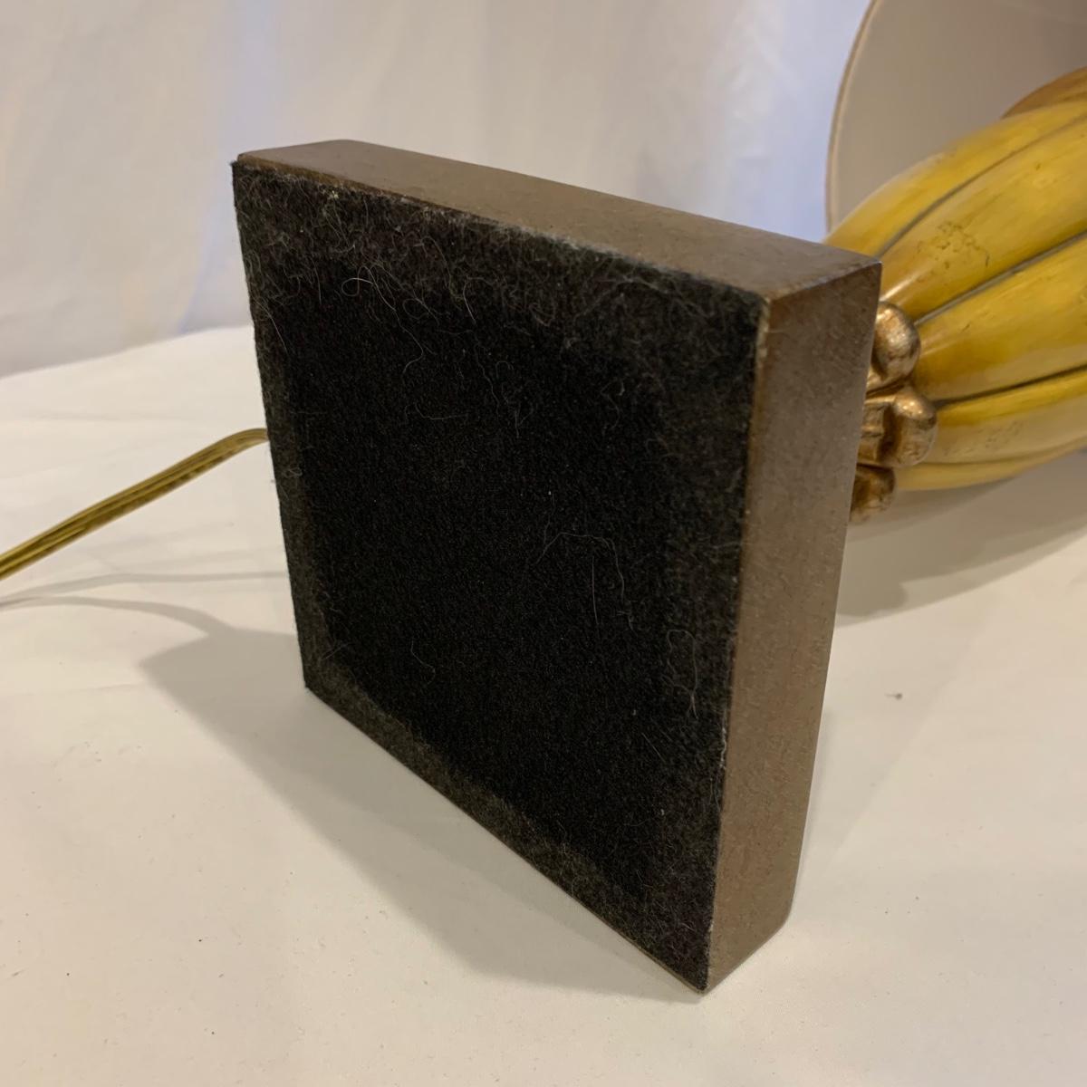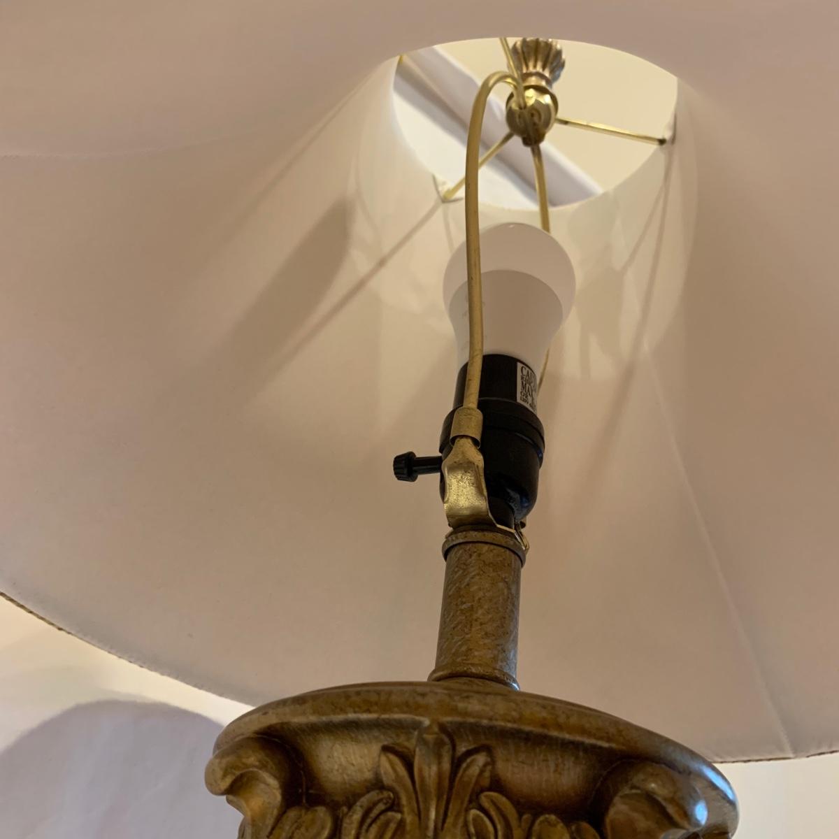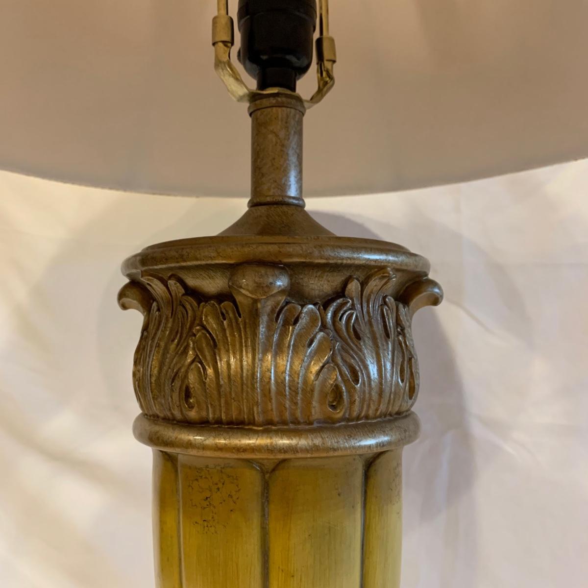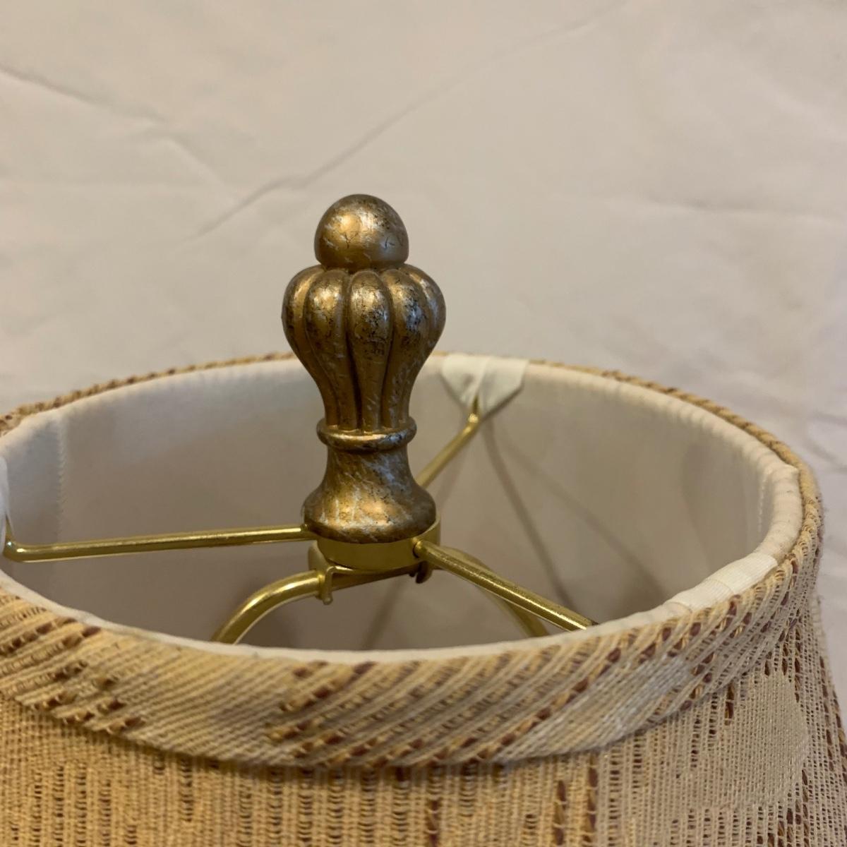 In this collection of items there are two palm tree throw pillows, a framed print of palm tree art, and a lovely ornate gilded lamp. The pillows are approximately 16”sq. The carved wooden frame is 16” x 18” and the print is framed with double mat boards and is behind glass. The lamp is 31” tall and feels like it is made of resin. It powered on when plugged in.