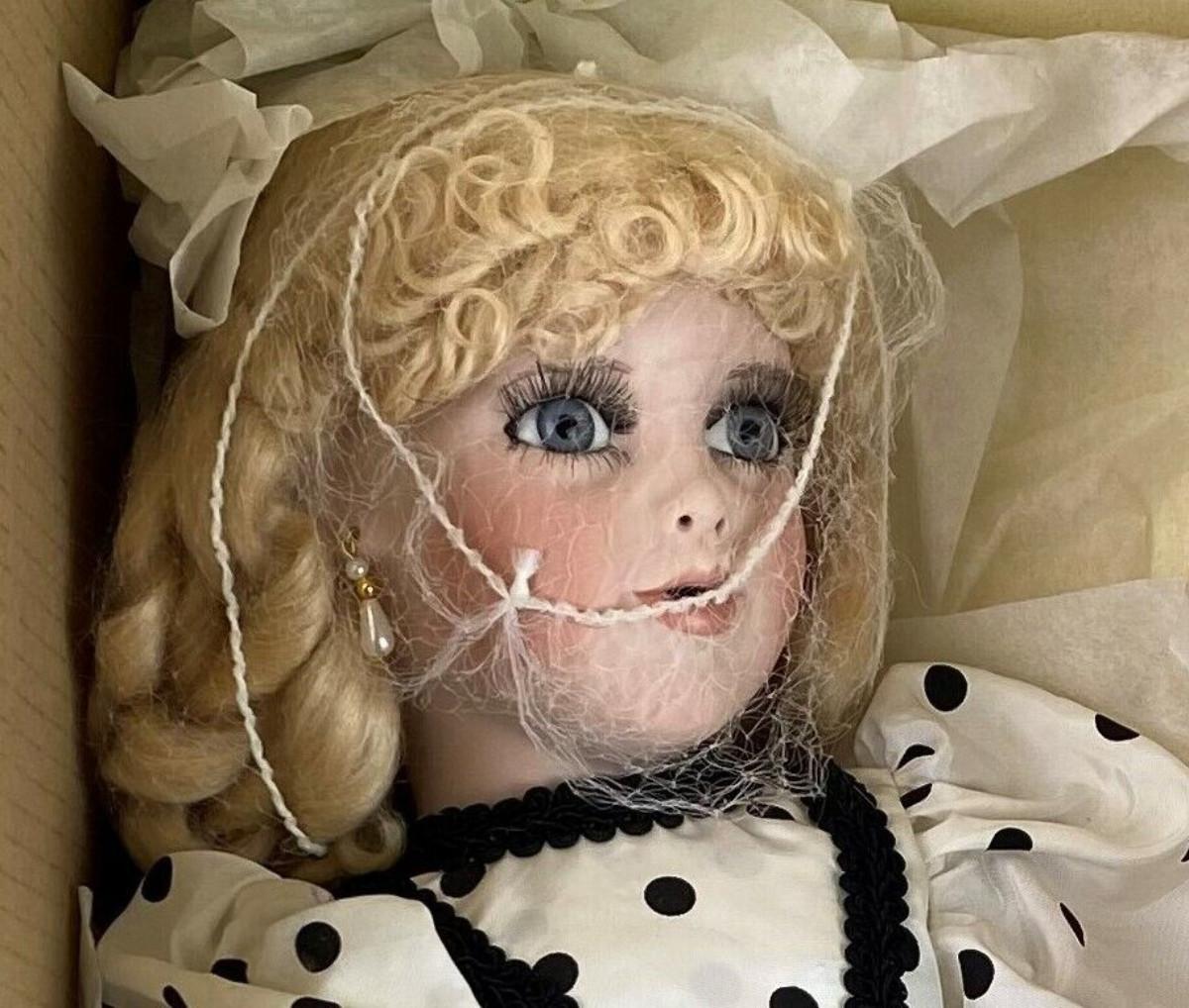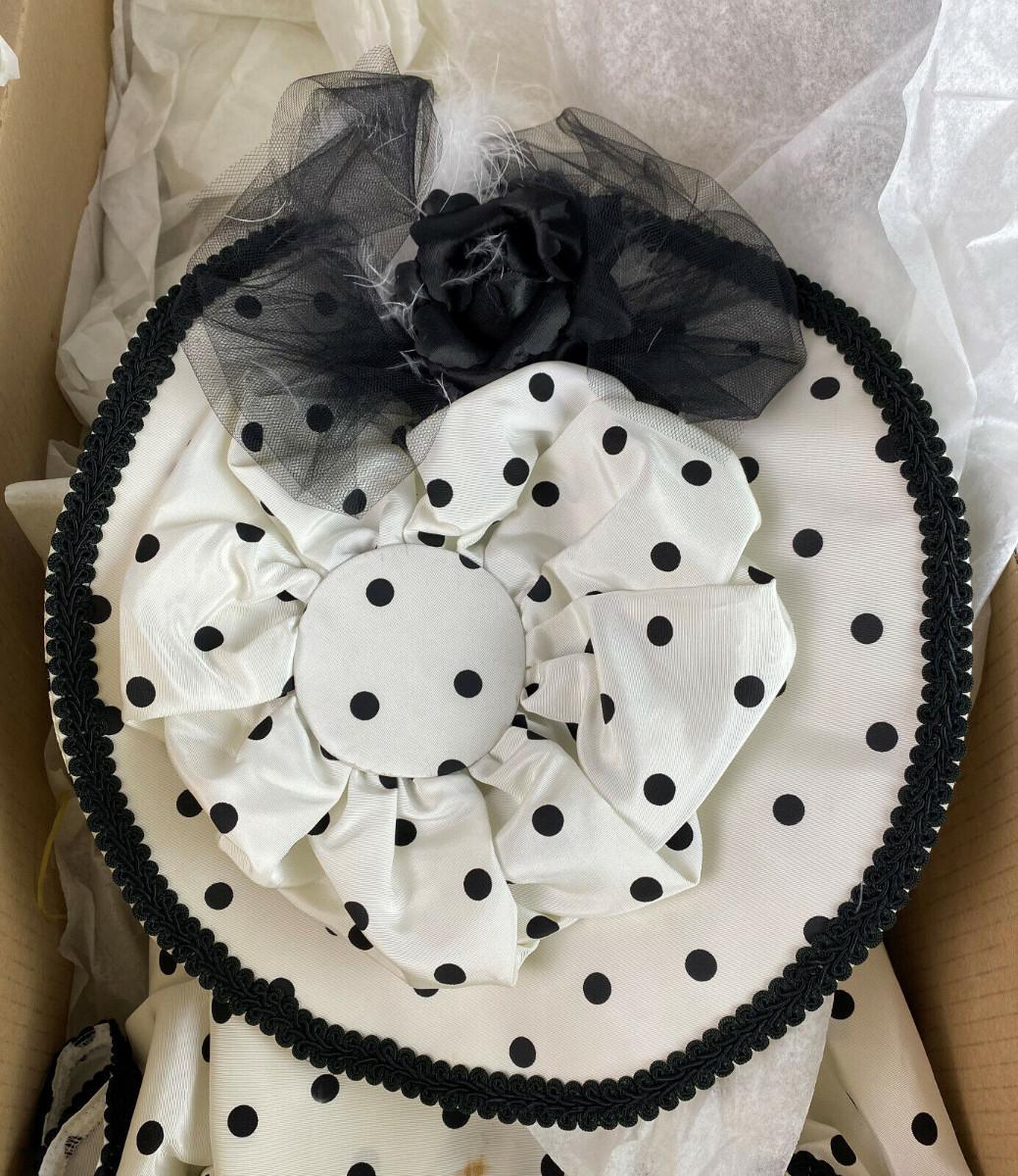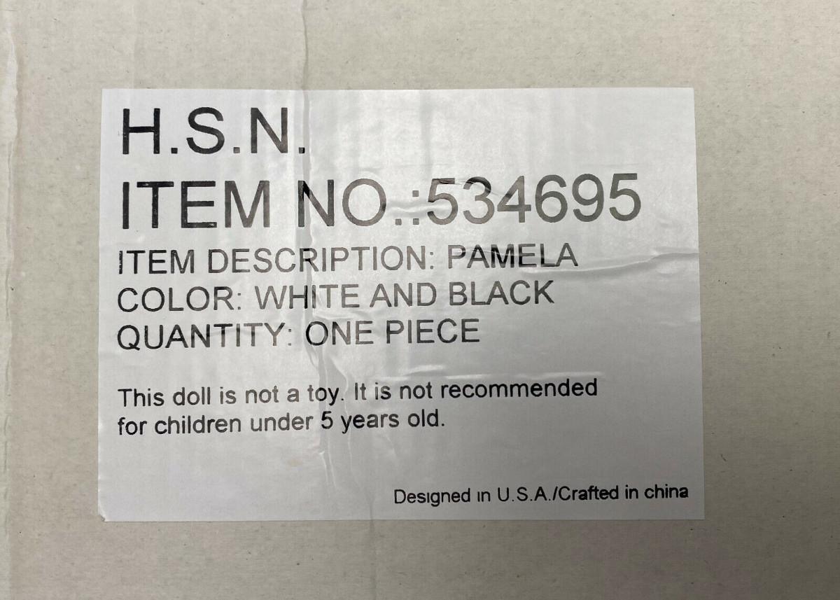 In its original box here is an American Artists 24 inch porcelain doll..."PAMELA" by Janis Berard for Kais, International...Victorian black and white outfit with parasol and hat...From a collector's estate..I did find one stain on dress..(pictured)“🦆