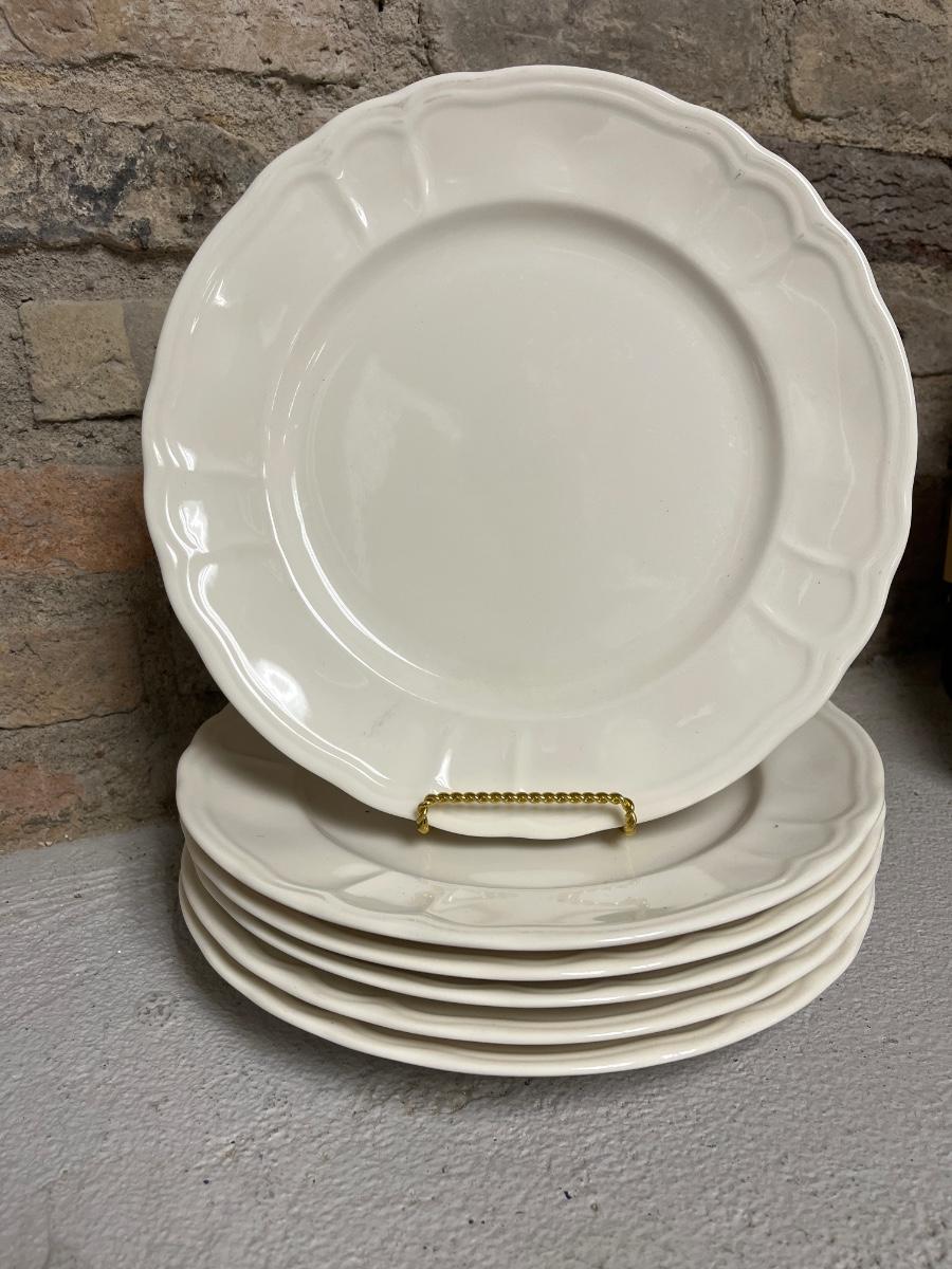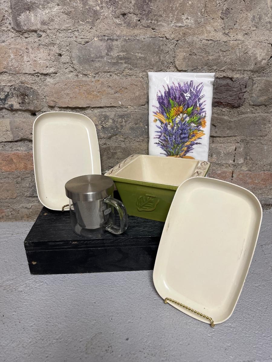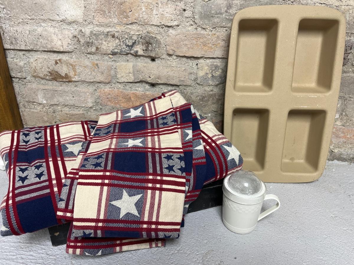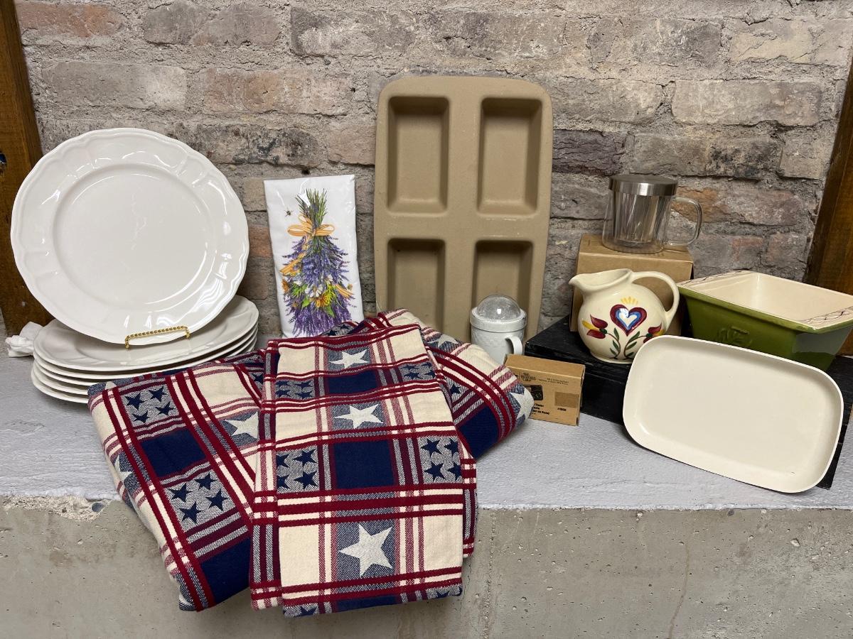 Lot of kitcheny type stuffs - Pampered Chef tablecloth, mini loaf pan, powdered sugar shaker, timer, Tastefully Simple hostess dish, stack of white plates, loose tea steeper cup and some tea towels in the package