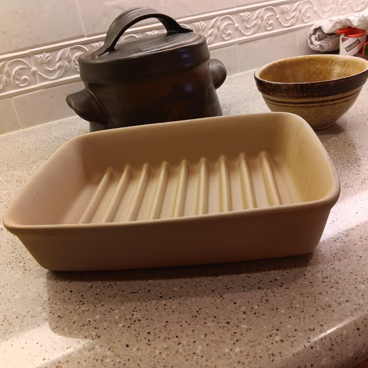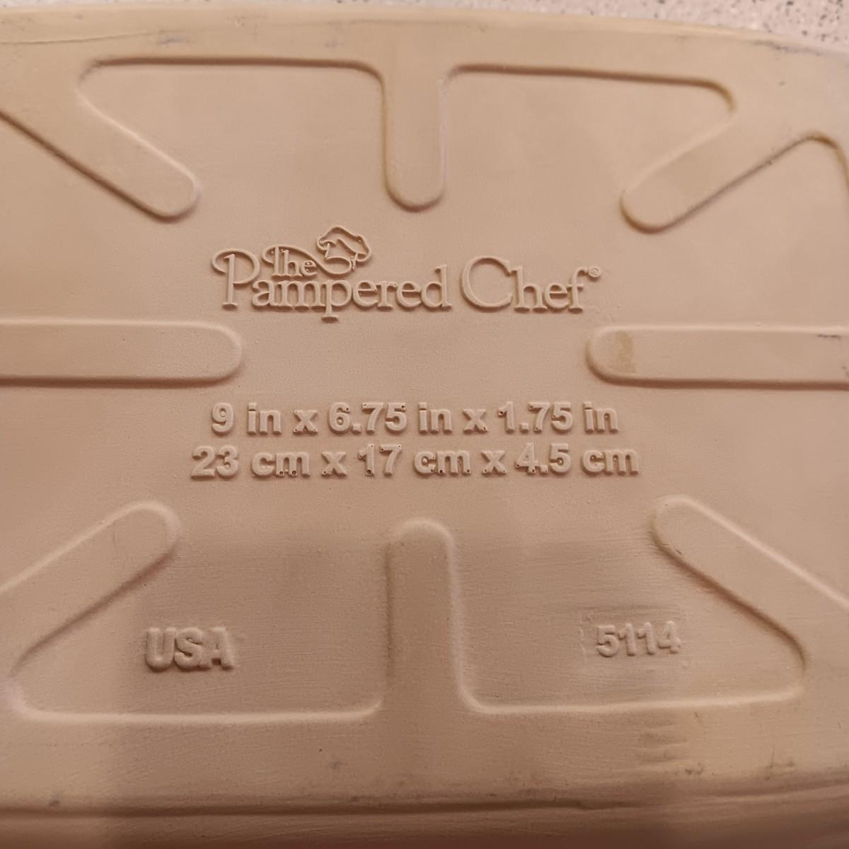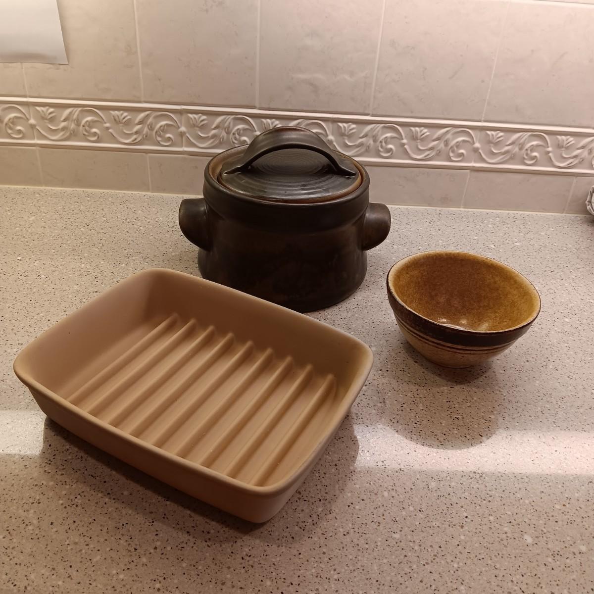 PAMPERED CHEF BAKING DISH, POTTERY CRAFT BOWL AND A BEAN POT