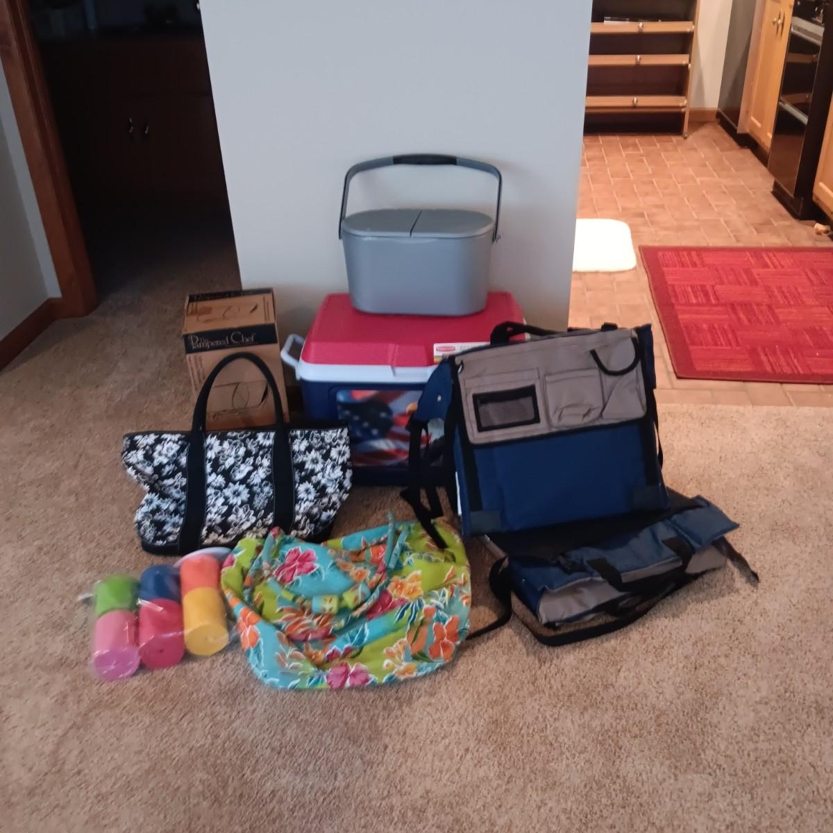 PAMPERED CHEF CHILLZANNE, FOOD COOLER, TOTE BAGS, 2 BLEACHER SEATS