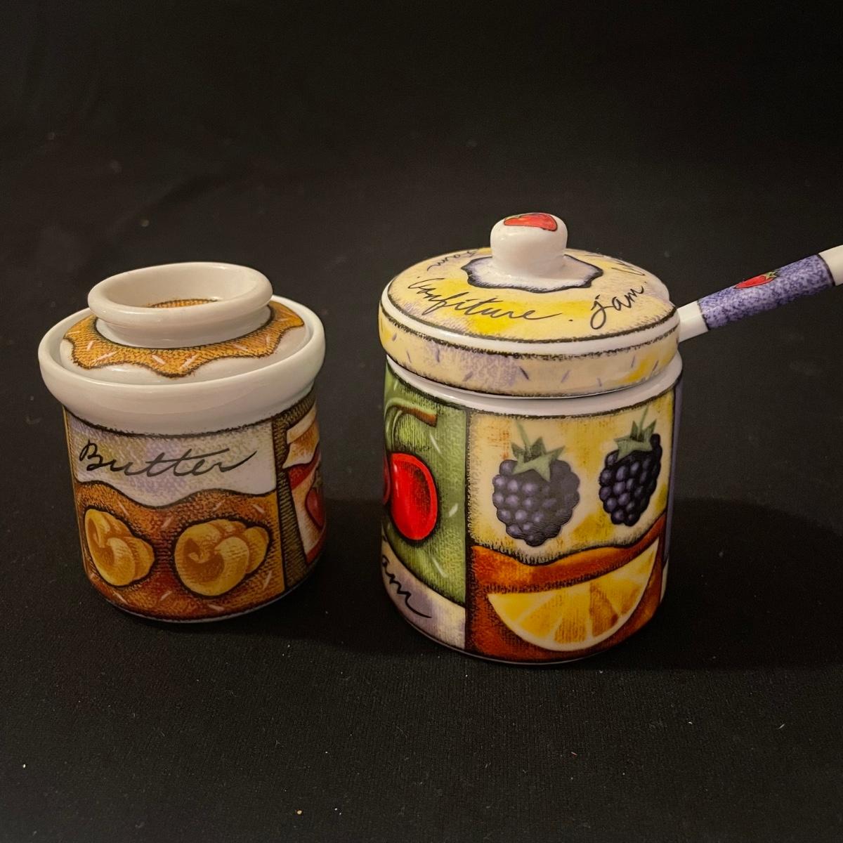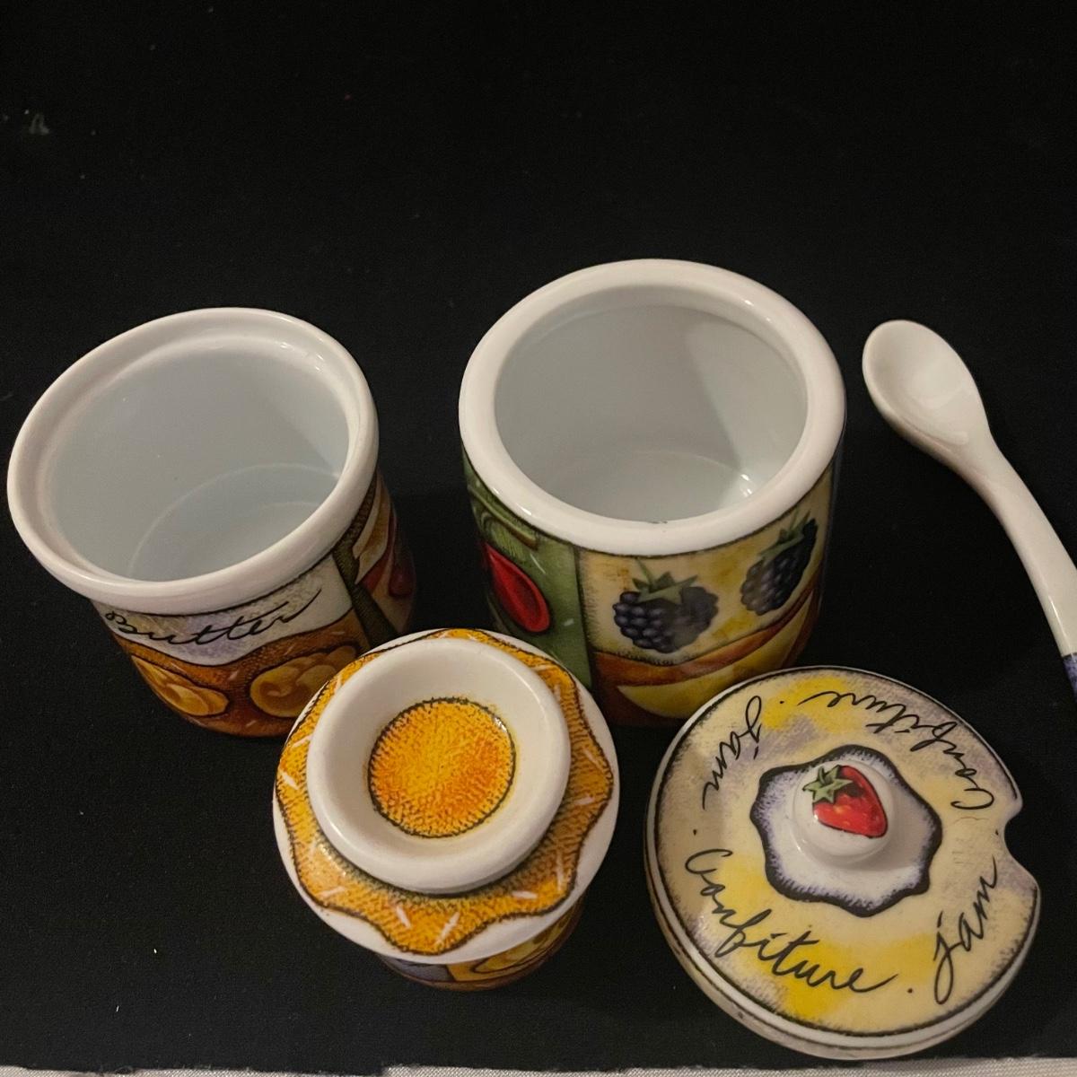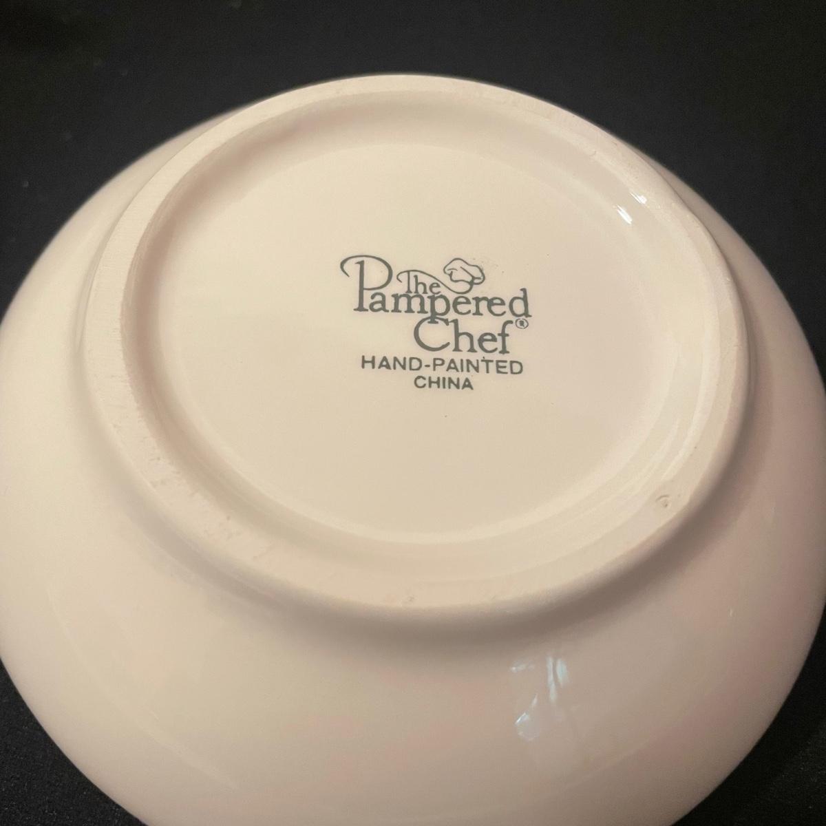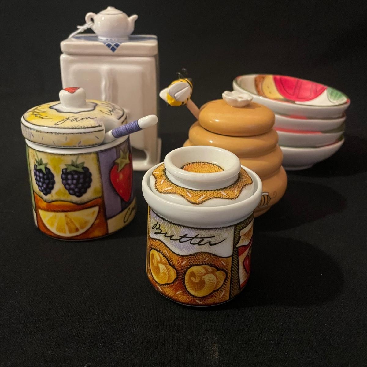 Four small ceramic condiment lidded jars includes a butter keeper, honey pot, tea bag holder and more. The 4 matching Pampered Chef small ceramic dishes each measure 4” d. All items in excellent condition.