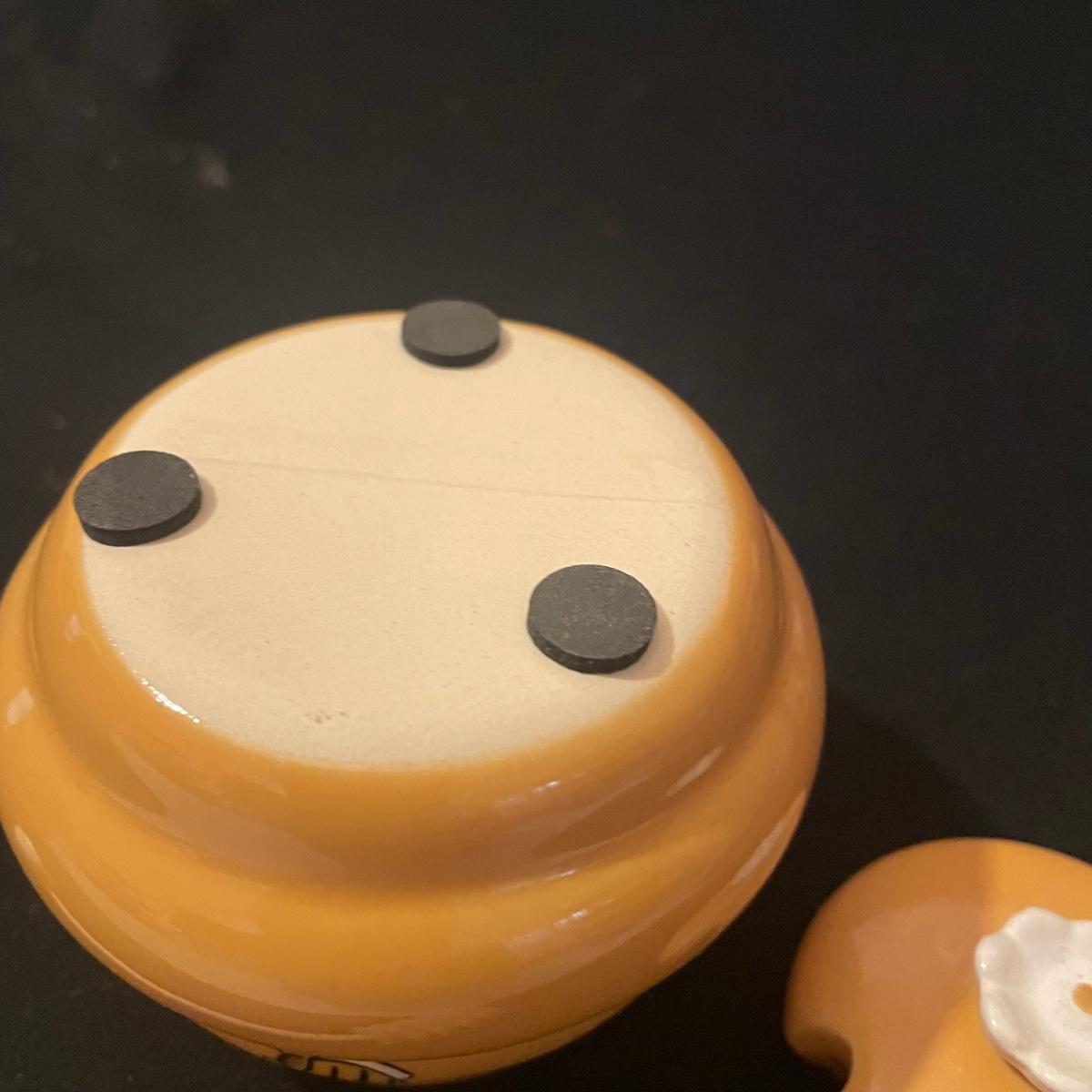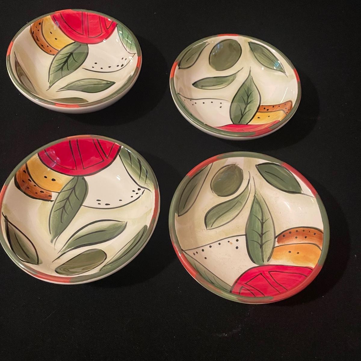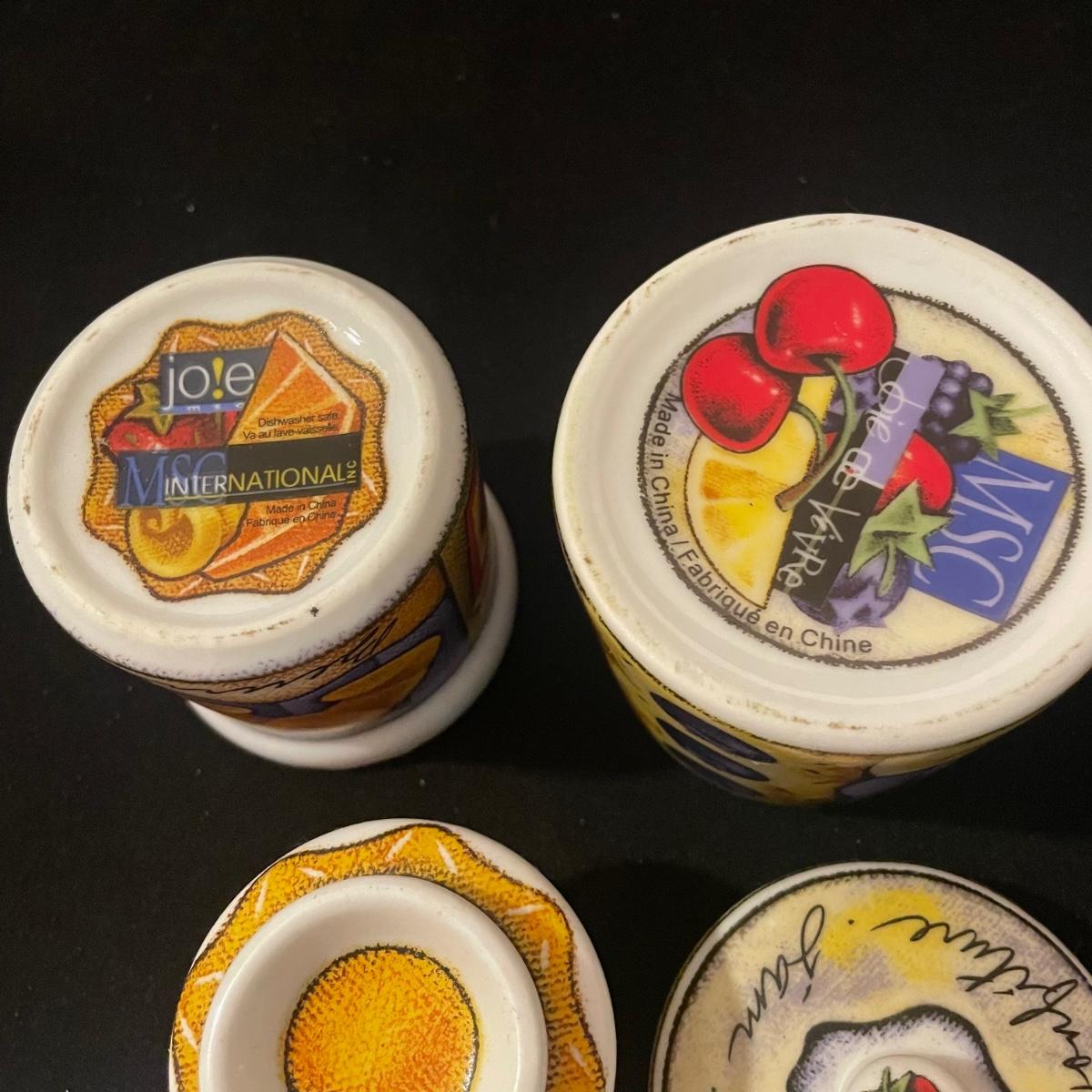 Four small ceramic condiment lidded jars includes a butter keeper, honey pot, tea bag holder and more. The 4 matching Pampered Chef small ceramic dishes each measure 4” d. All items in excellent condition.