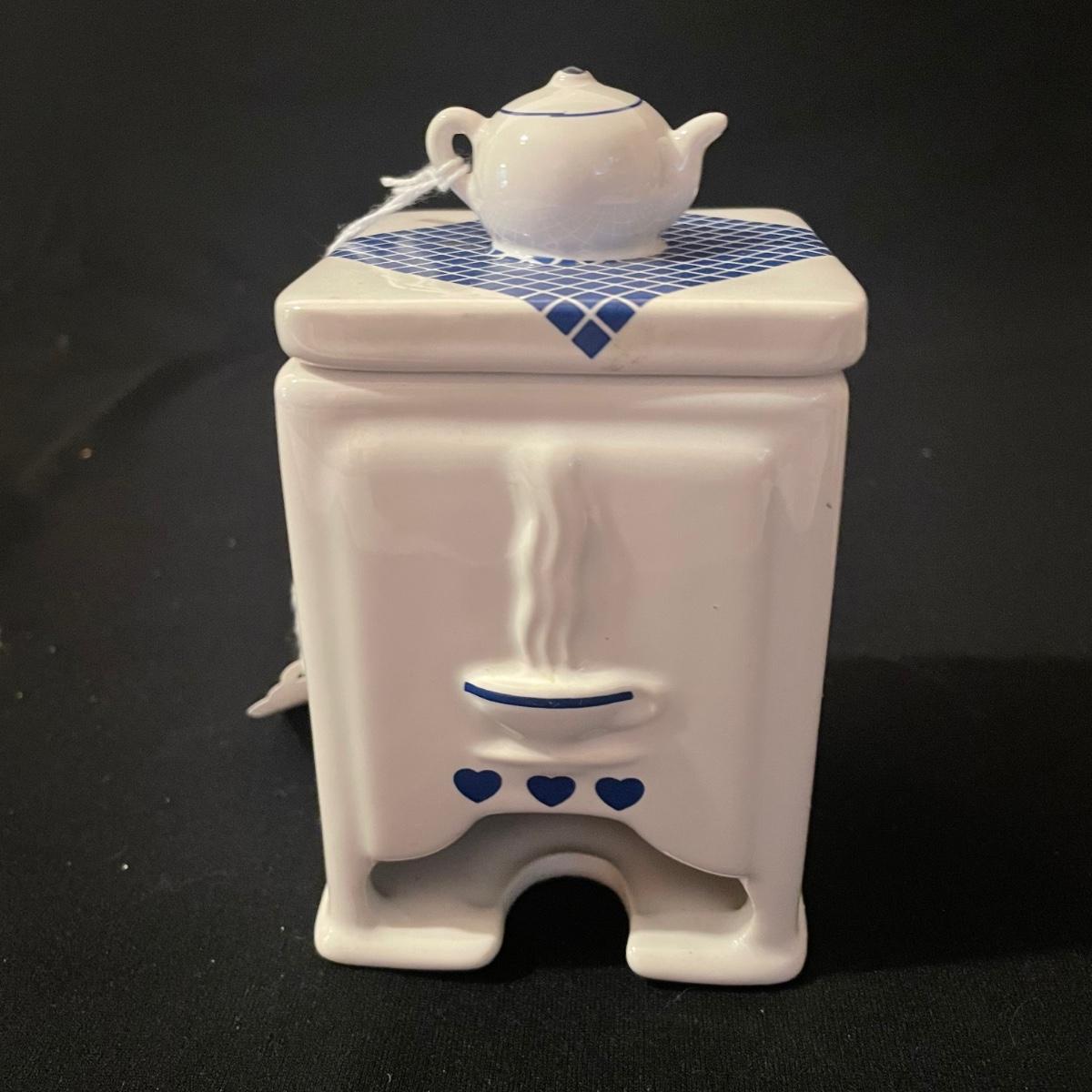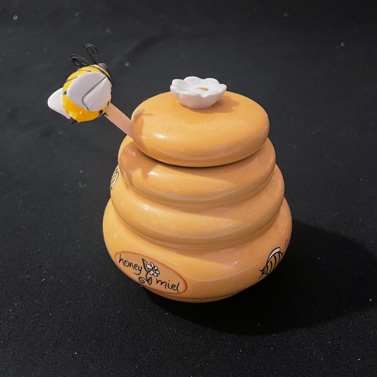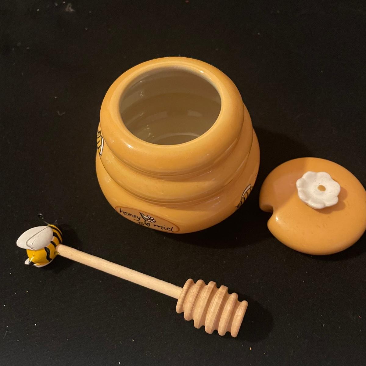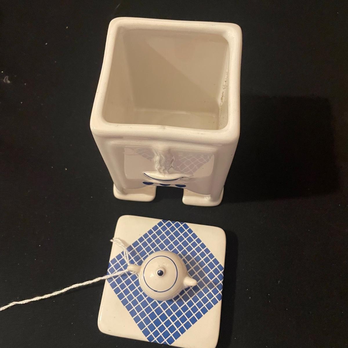 Four small ceramic condiment lidded jars includes a butter keeper, honey pot, tea bag holder and more. The 4 matching Pampered Chef small ceramic dishes each measure 4” d. All items in excellent condition.