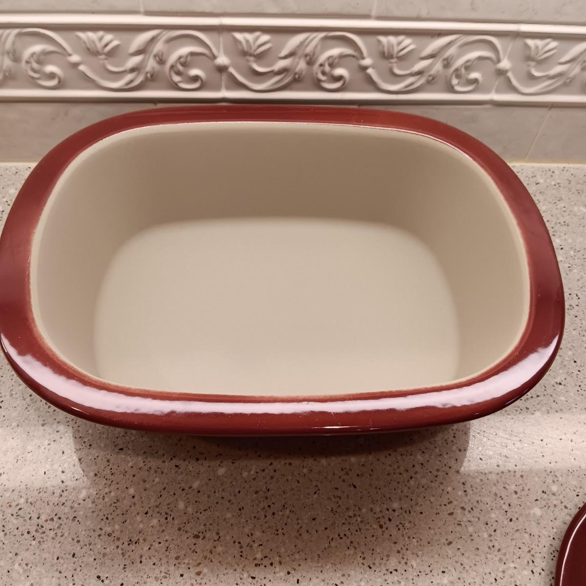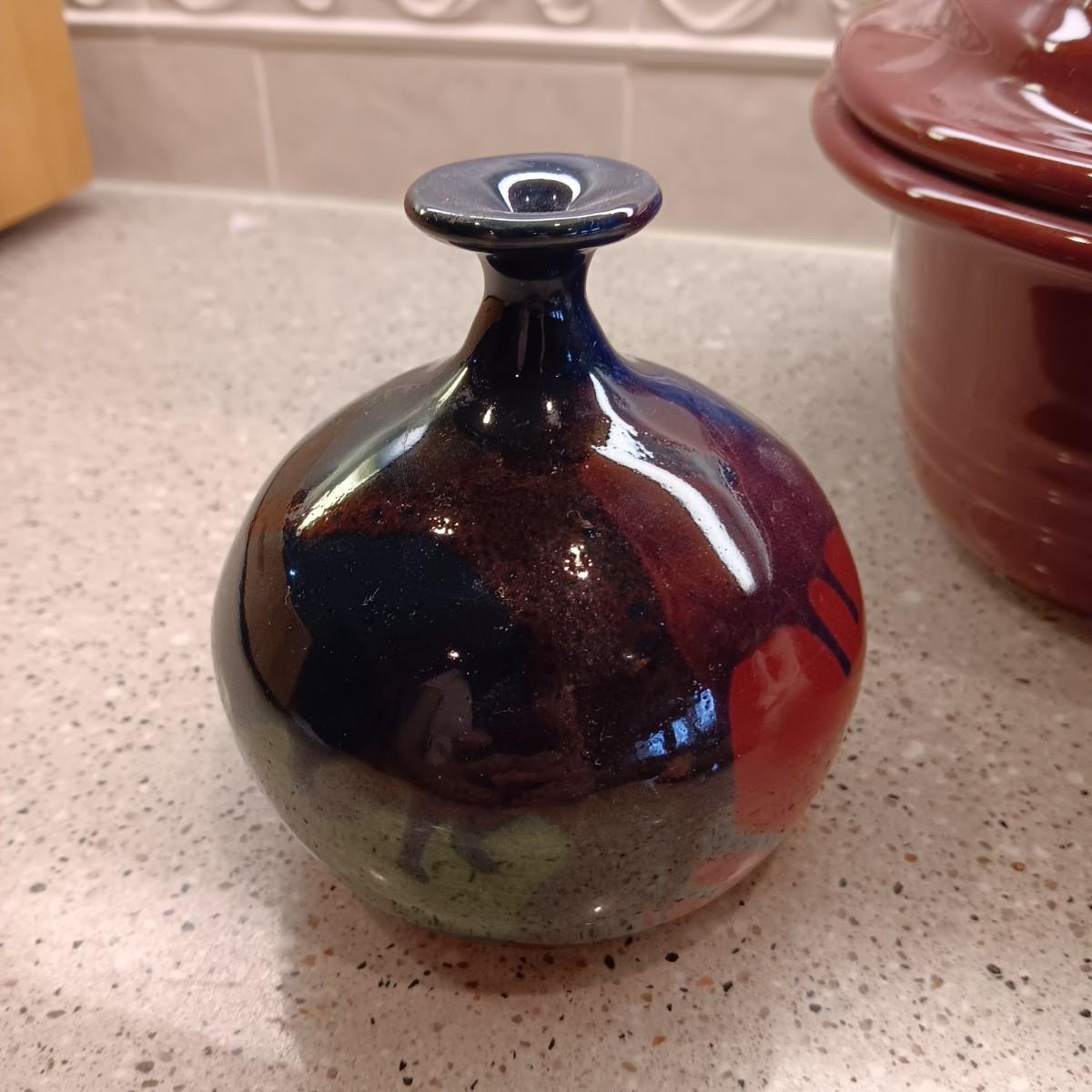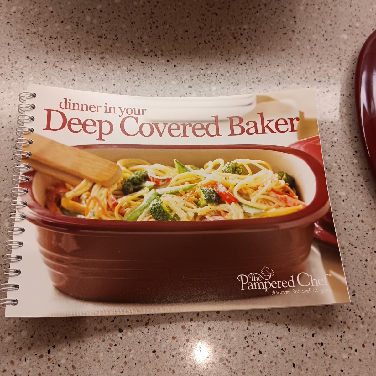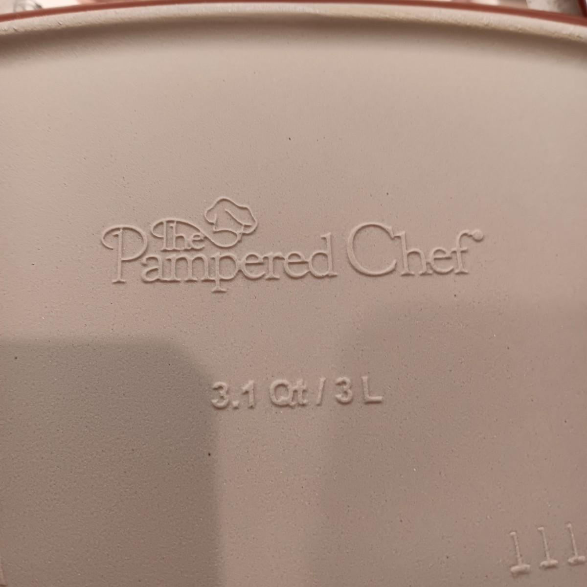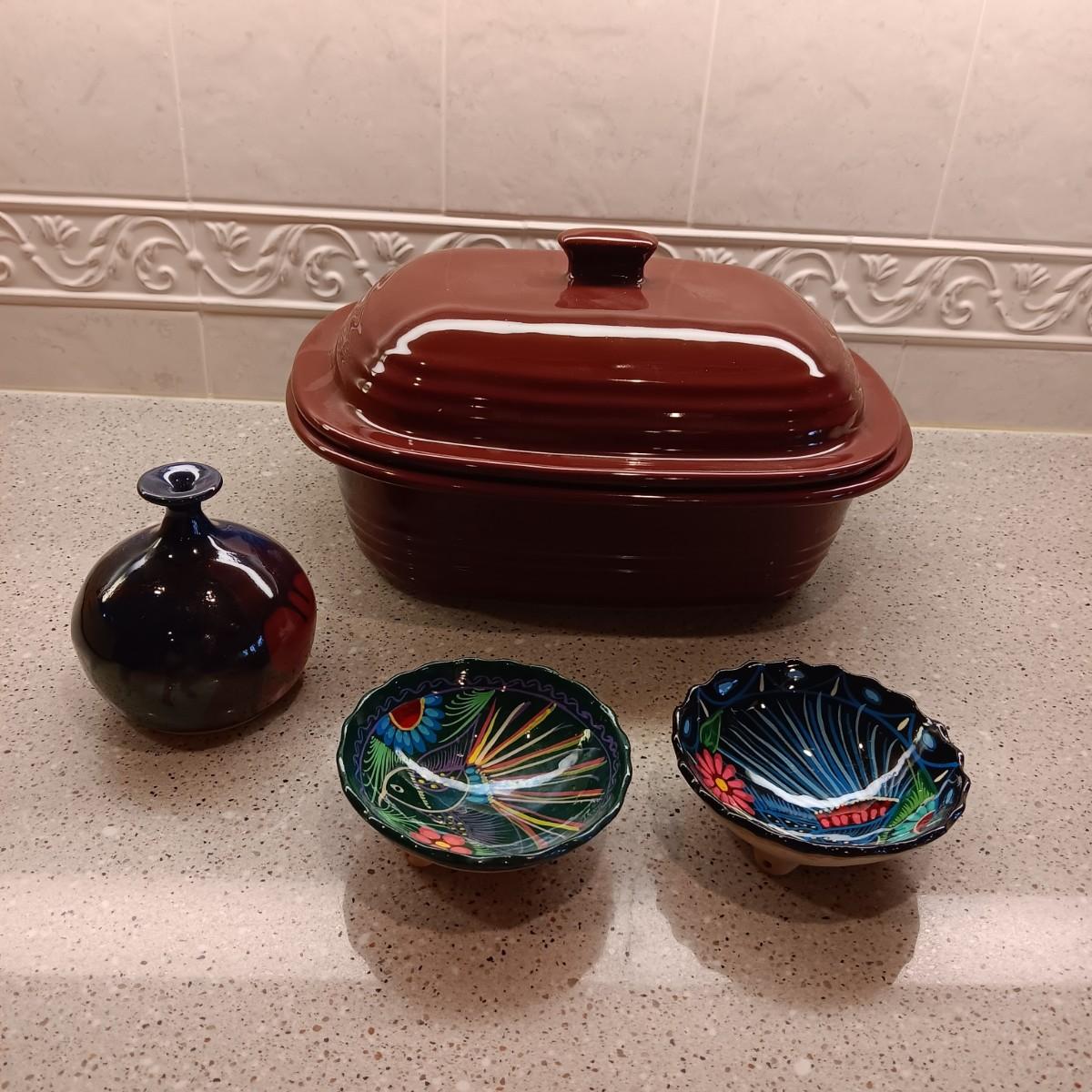 PAMPERED CHEF DEEP COVERED BAKER, CLAY BUD VASE AND 2 CLAY BOWLS