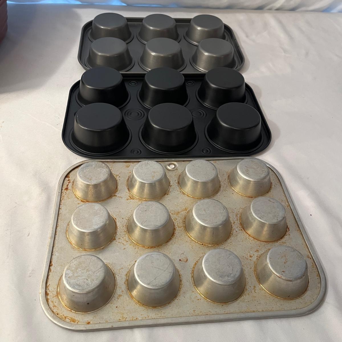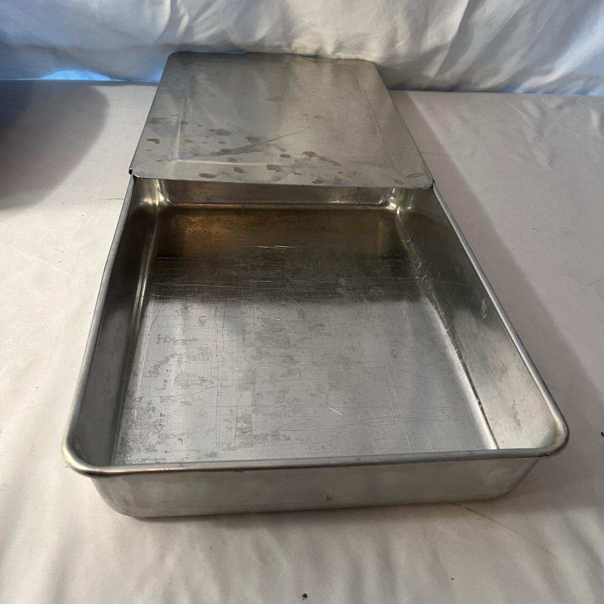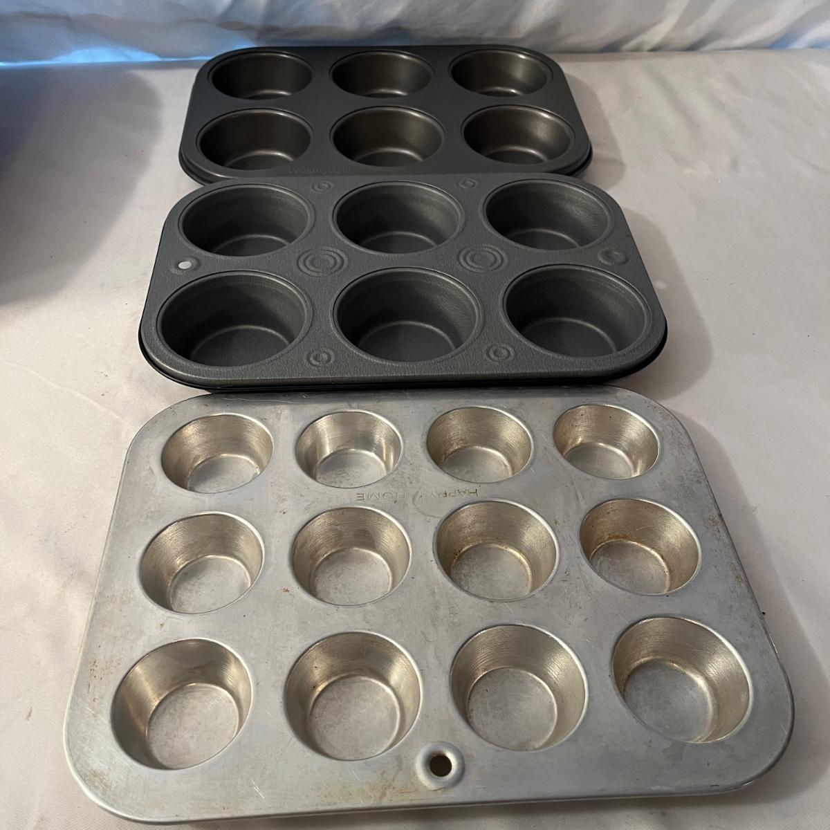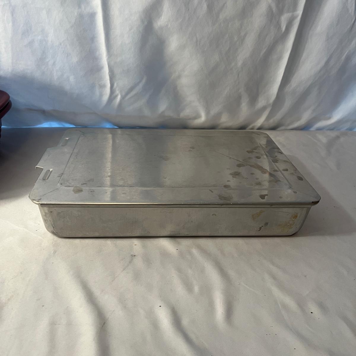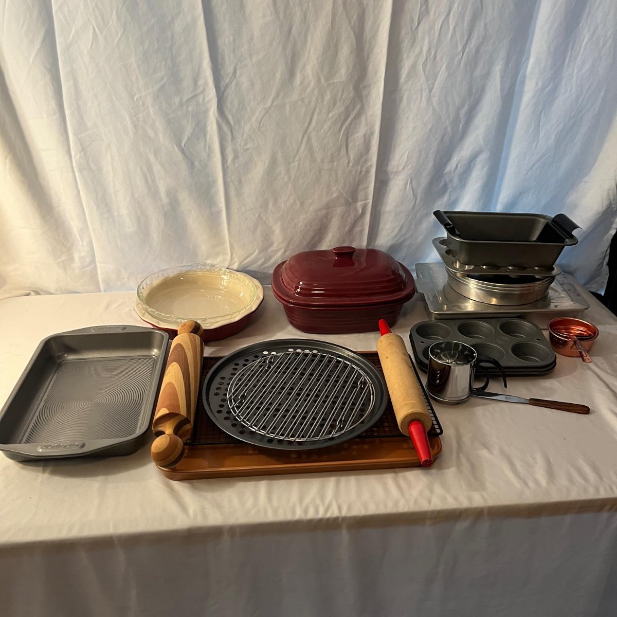 Lot includes a Pampered Chef Dutch Oven, two wooden rolling pins, Pyrex pie dish, three muffin tins, baking pans, sifters, bread pan, large baking pan and more. Large pan measures 12.5” x .17.5” x .5”H.
