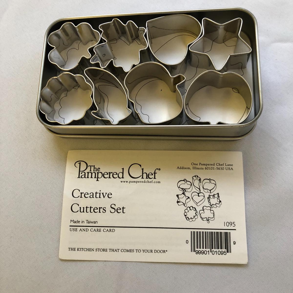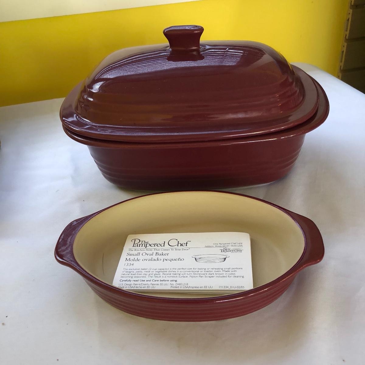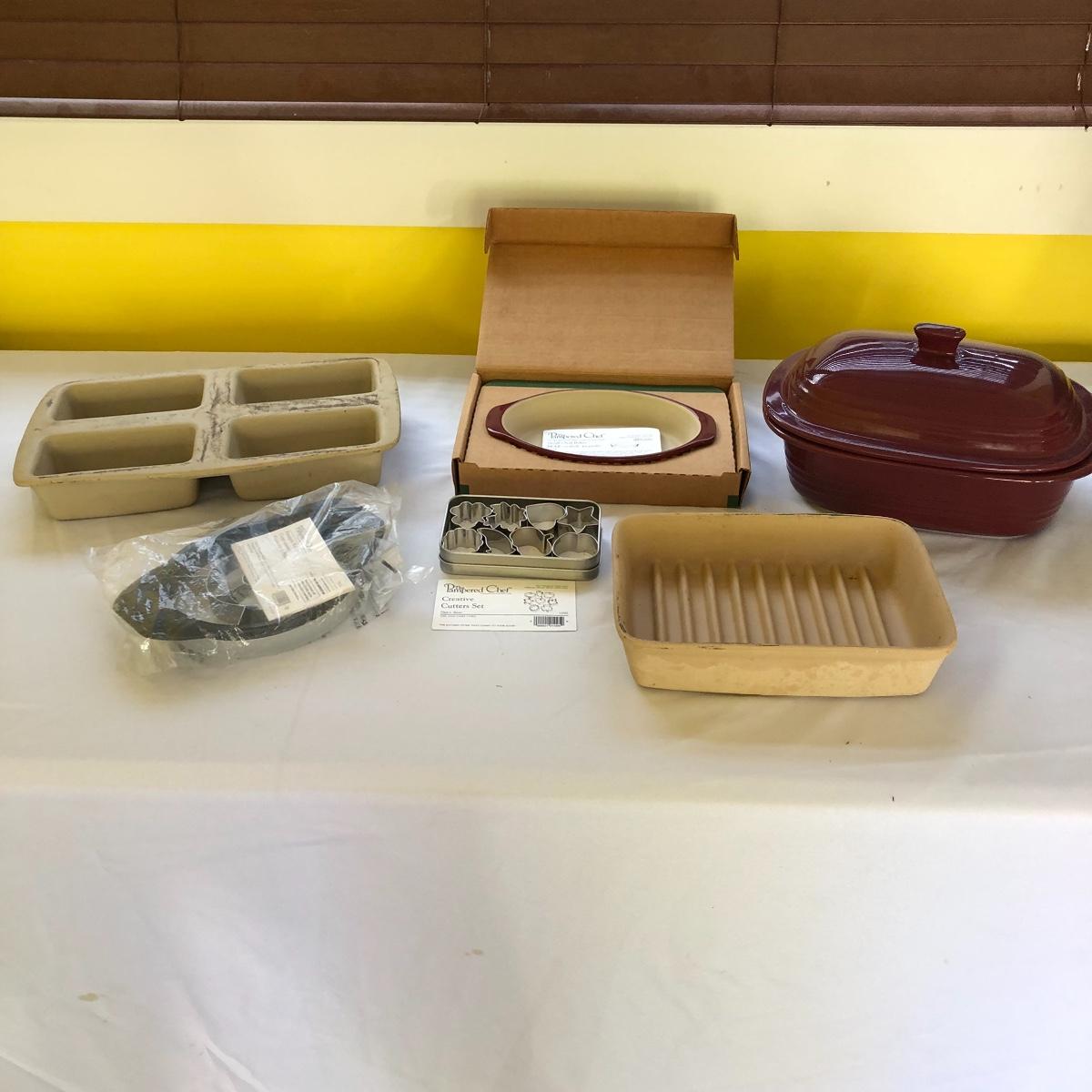 This lot includes six pampered chef items: a small oval baker, covered casserole dish, creative cutters set, a pineapple wedger and two baking dishes. Local pick up only.