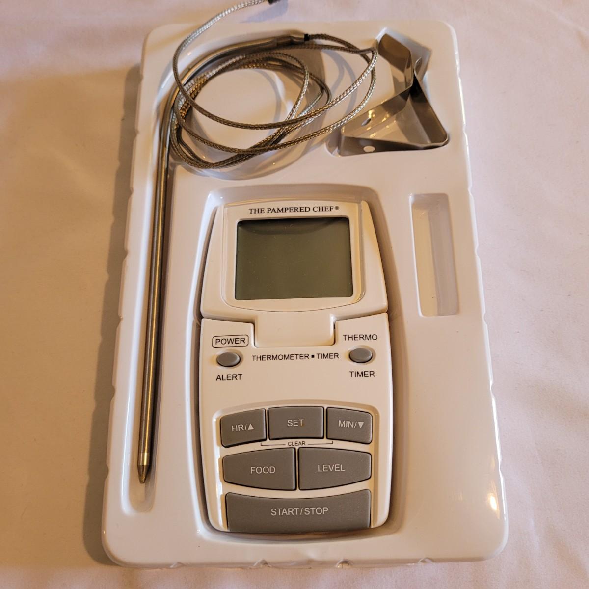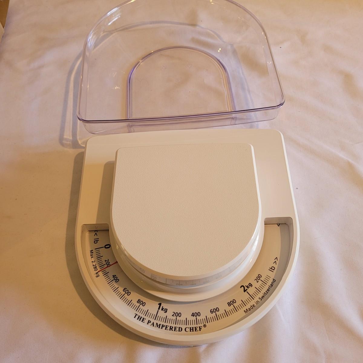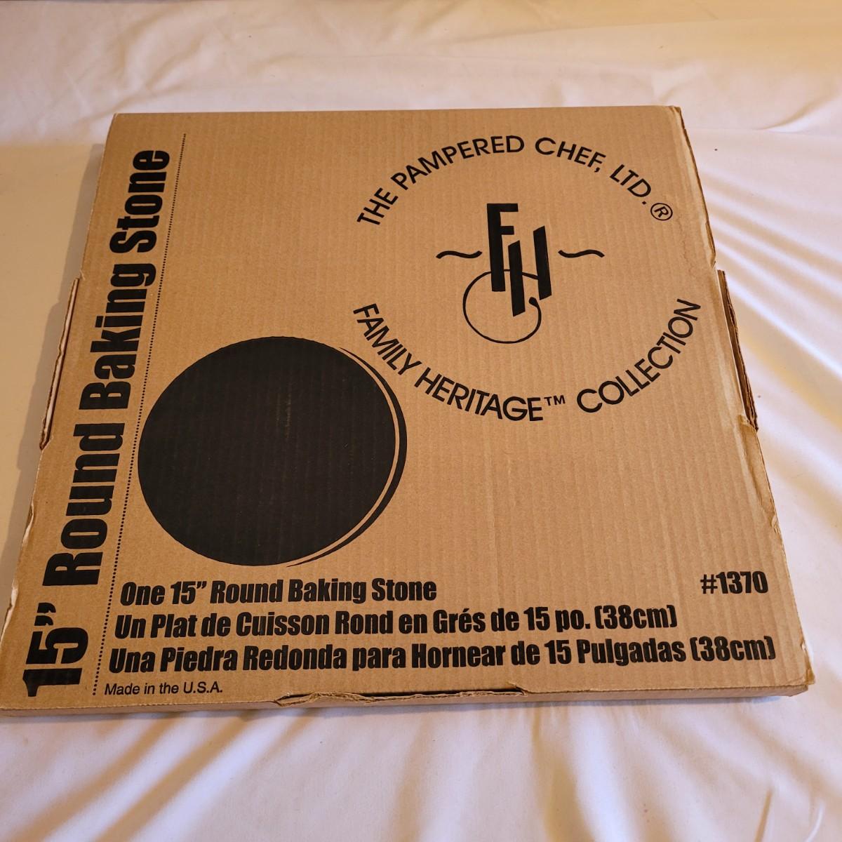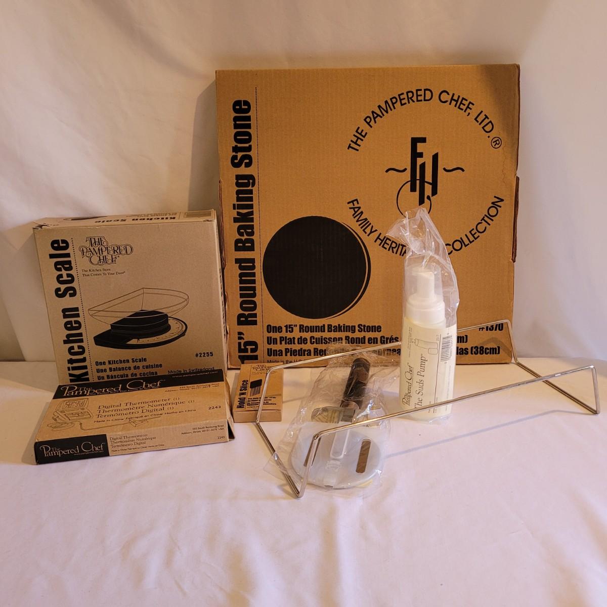 This lot includes various Pampered Chef kitchen accessories. Items include a 15" baking stone, kitchen scale, baking thermometer, hold 'n slice, suds pump, pizza cutter, and cooling rack. All items appear to be either lightly used or brand new and include original packaging.