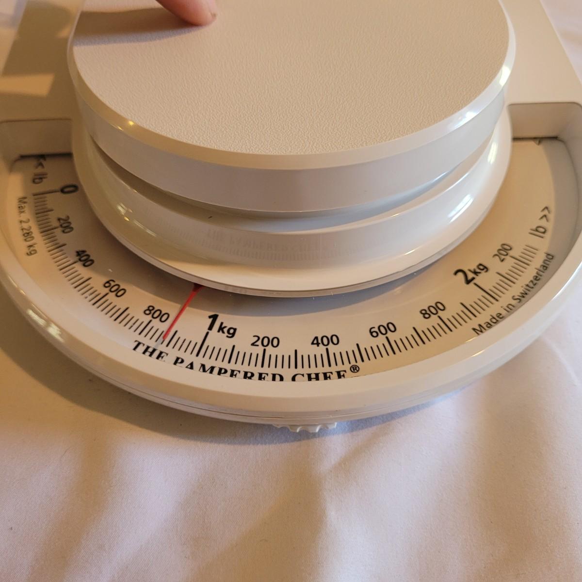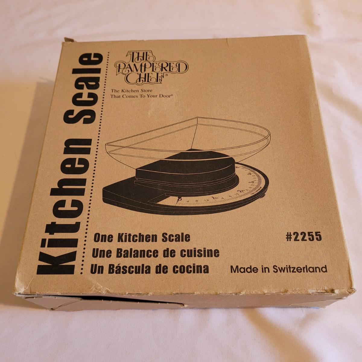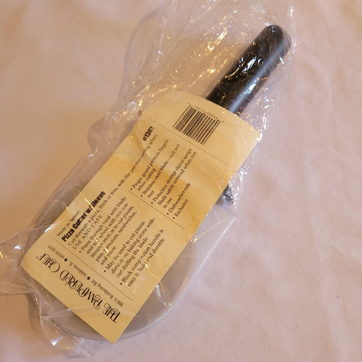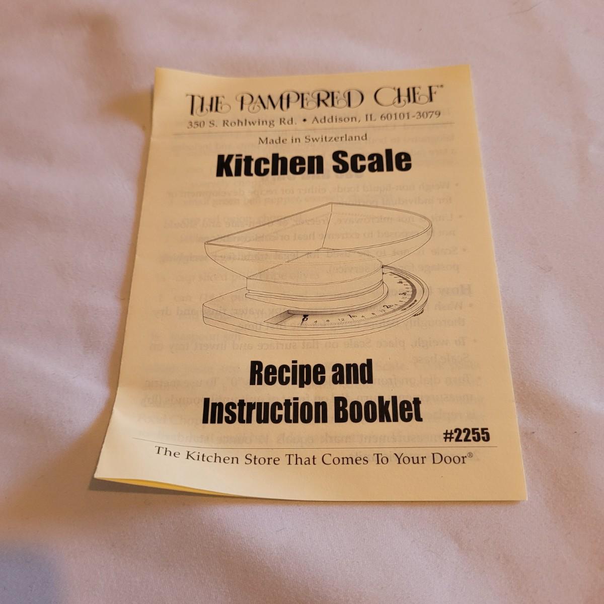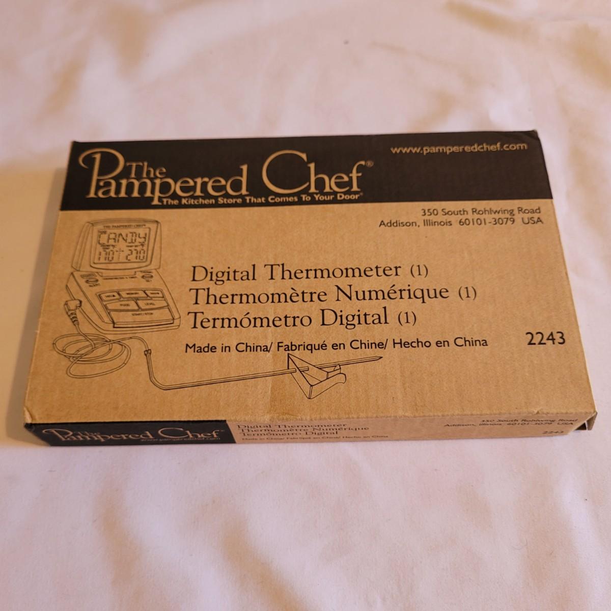 This lot includes various Pampered Chef kitchen accessories. Items include a 15" baking stone, kitchen scale, baking thermometer, hold 'n slice, suds pump, pizza cutter, and cooling rack. All items appear to be either lightly used or brand new and include original packaging.
