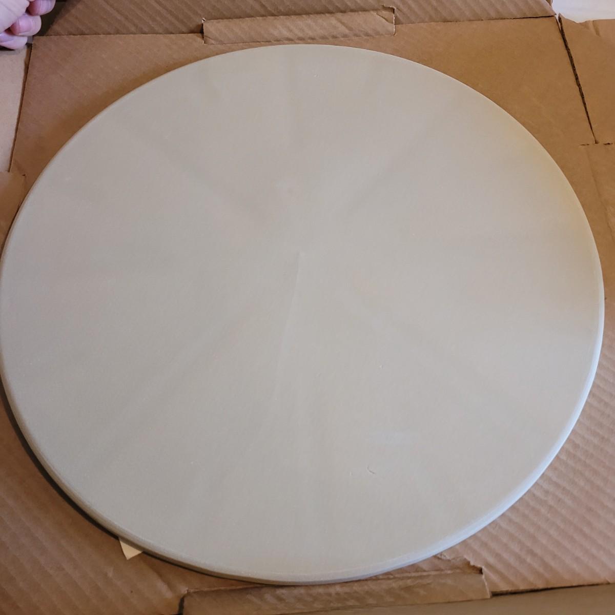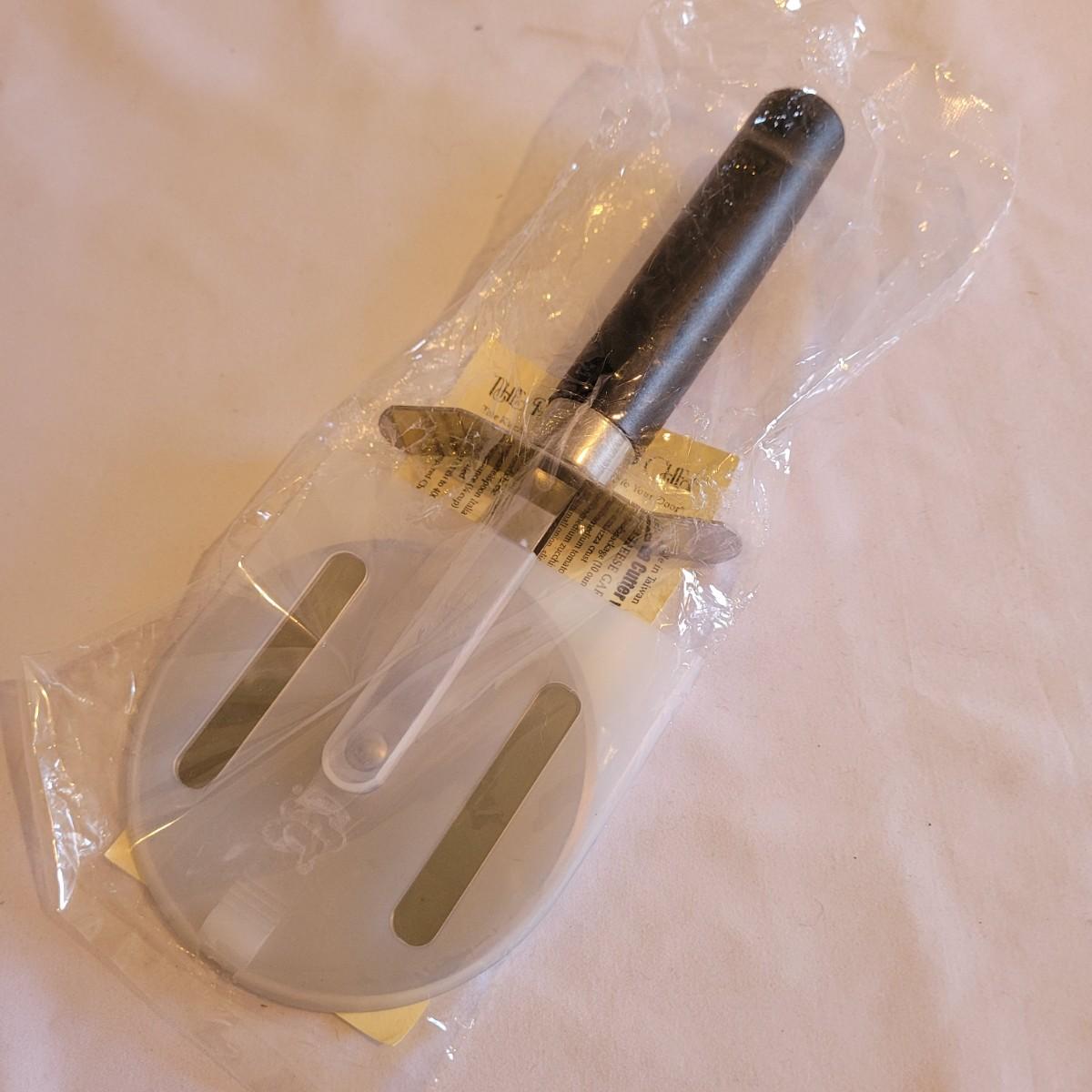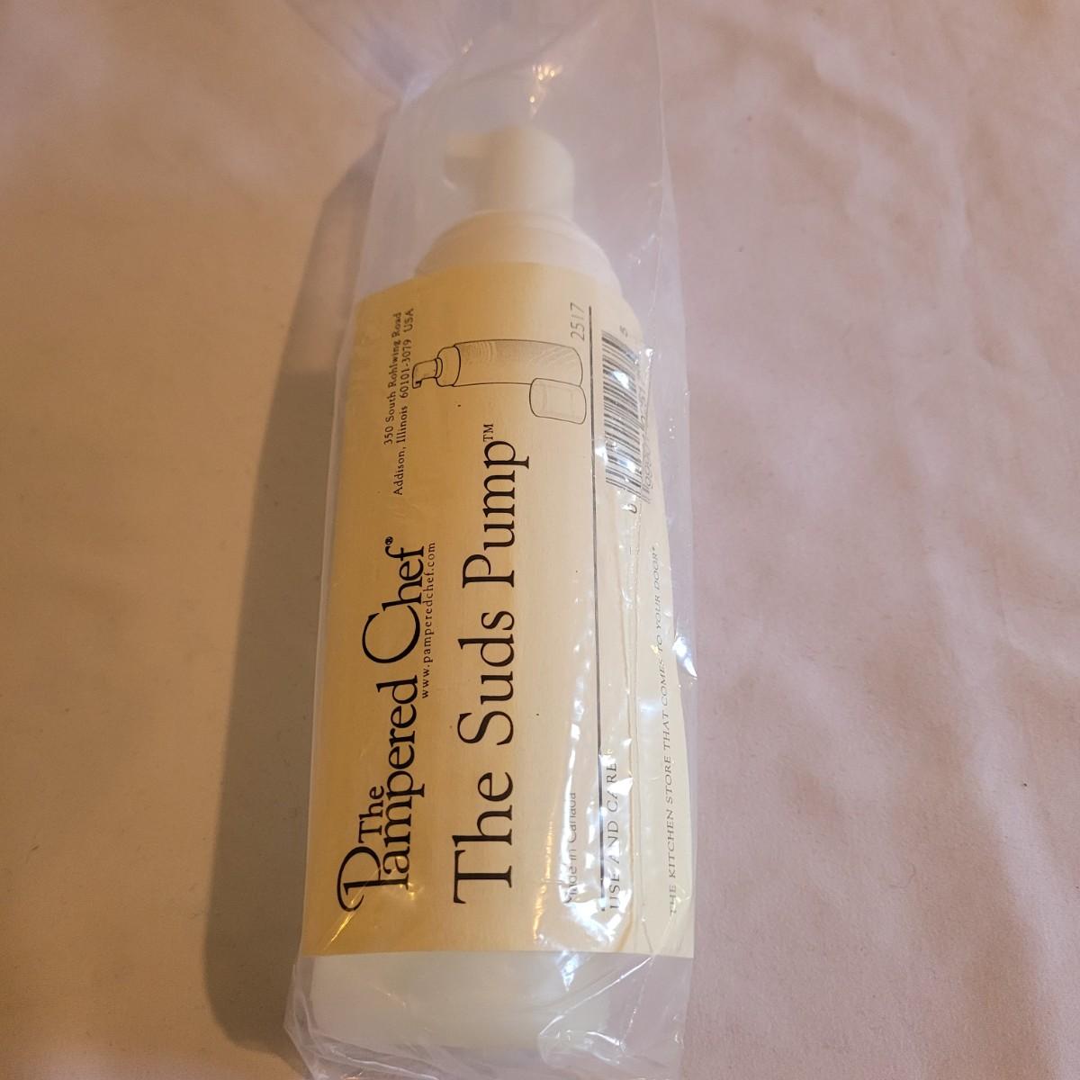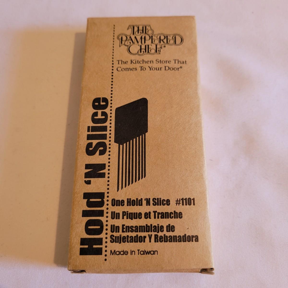 This lot includes various Pampered Chef kitchen accessories. Items include a 15" baking stone, kitchen scale, baking thermometer, hold 'n slice, suds pump, pizza cutter, and cooling rack. All items appear to be either lightly used or brand new and include original packaging.