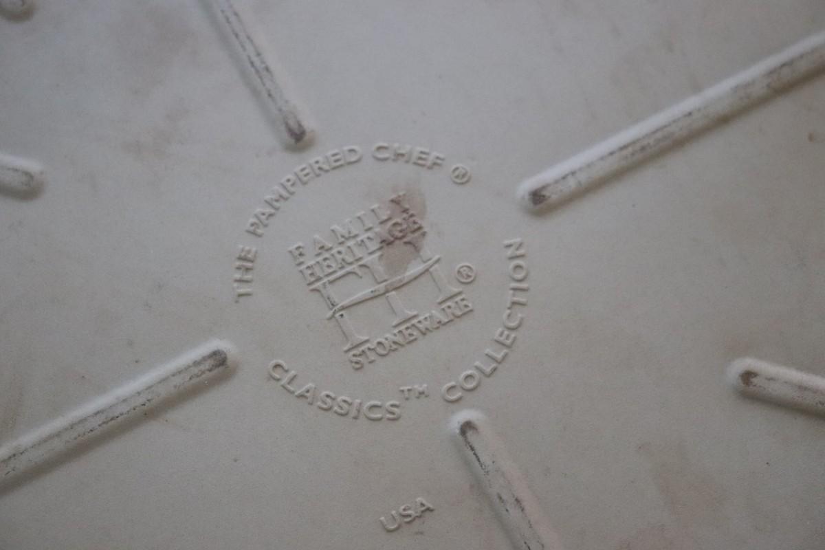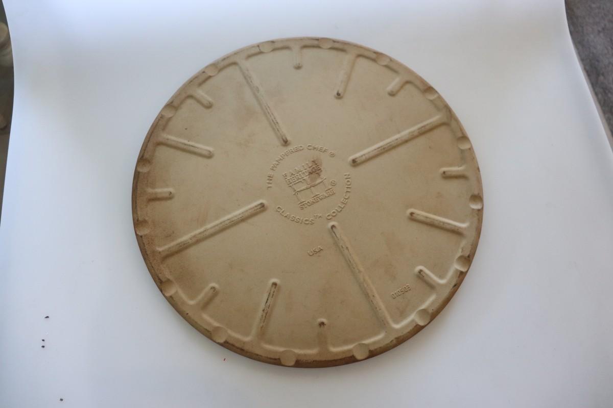 This lot features a Pampered Chef pizza stone, an essential tool for any pizza lover. Designed to create perfectly baked pizzas, this stone absorbs moisture and distributes heat evenly, resulting in a crisp crust and delicious toppings. The durable material can withstand high temperatures, making it suitable for use in the oven or on the grill. It's also versatile enough for baking bread, cookies, and other baked goods. Easy to clean and maintain, this Pampered Chef pizza stone is perfect for family pizza nights, gatherings, or simply enjoying homemade pizzas any day of the week!