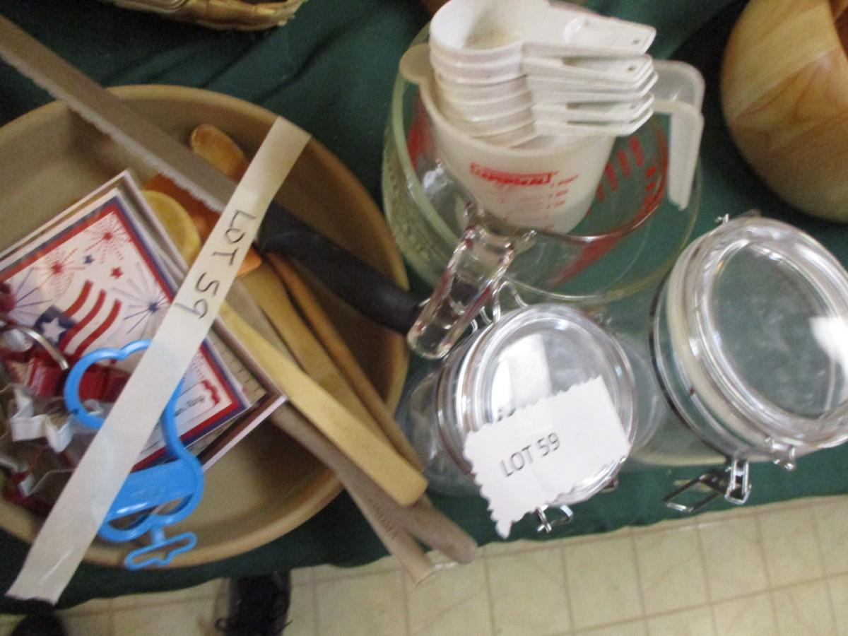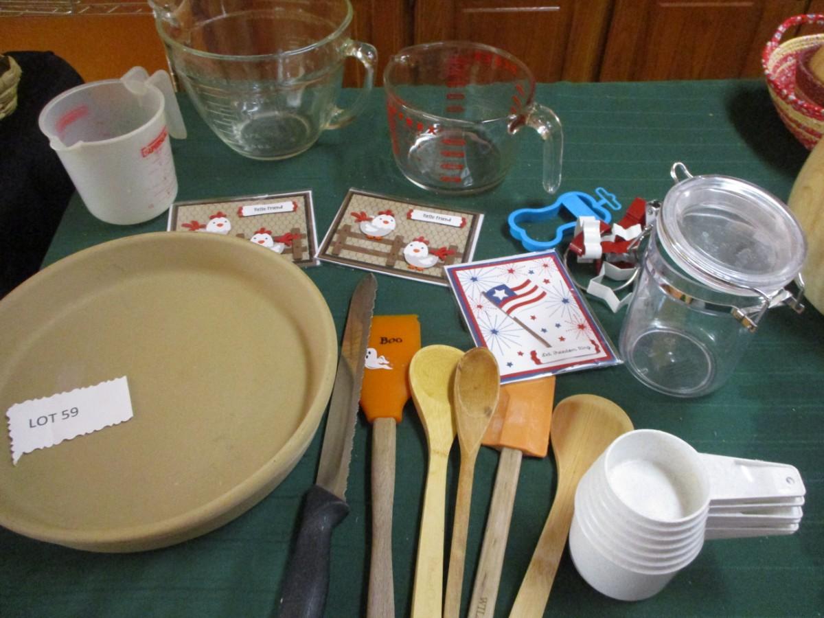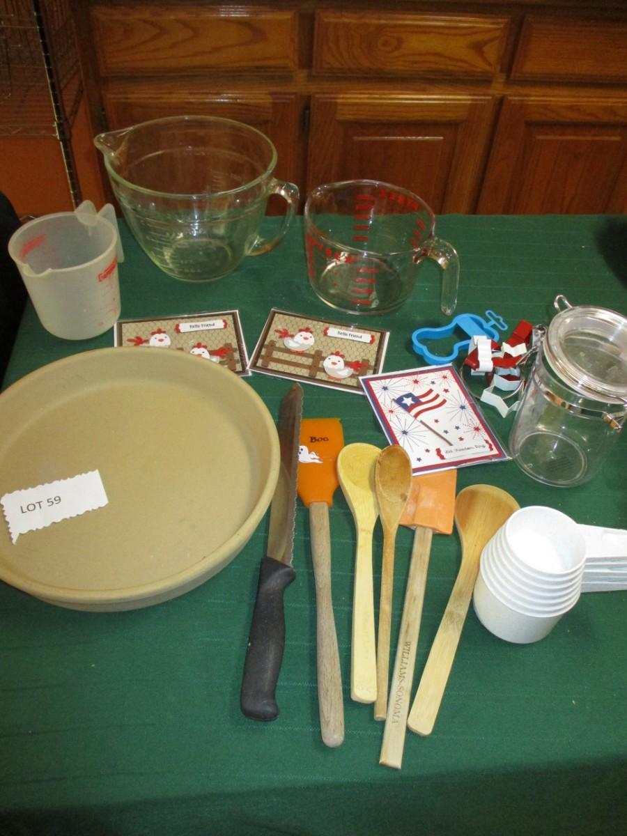 Measuring cups, Glass Pyrex 4 cup. Knife, Wooden plate,