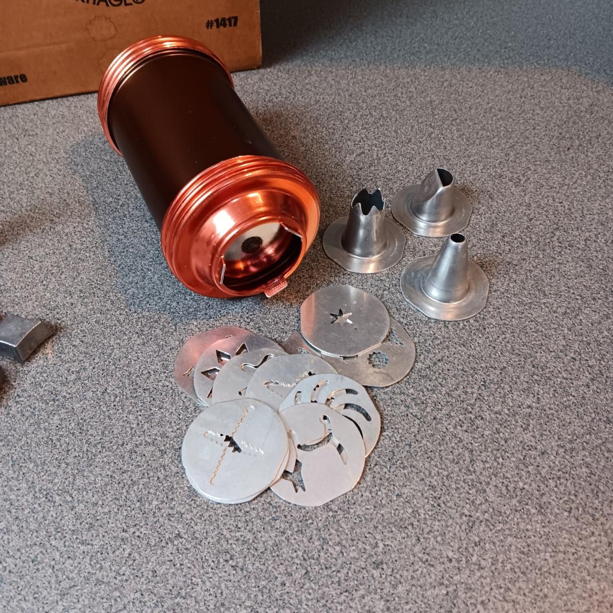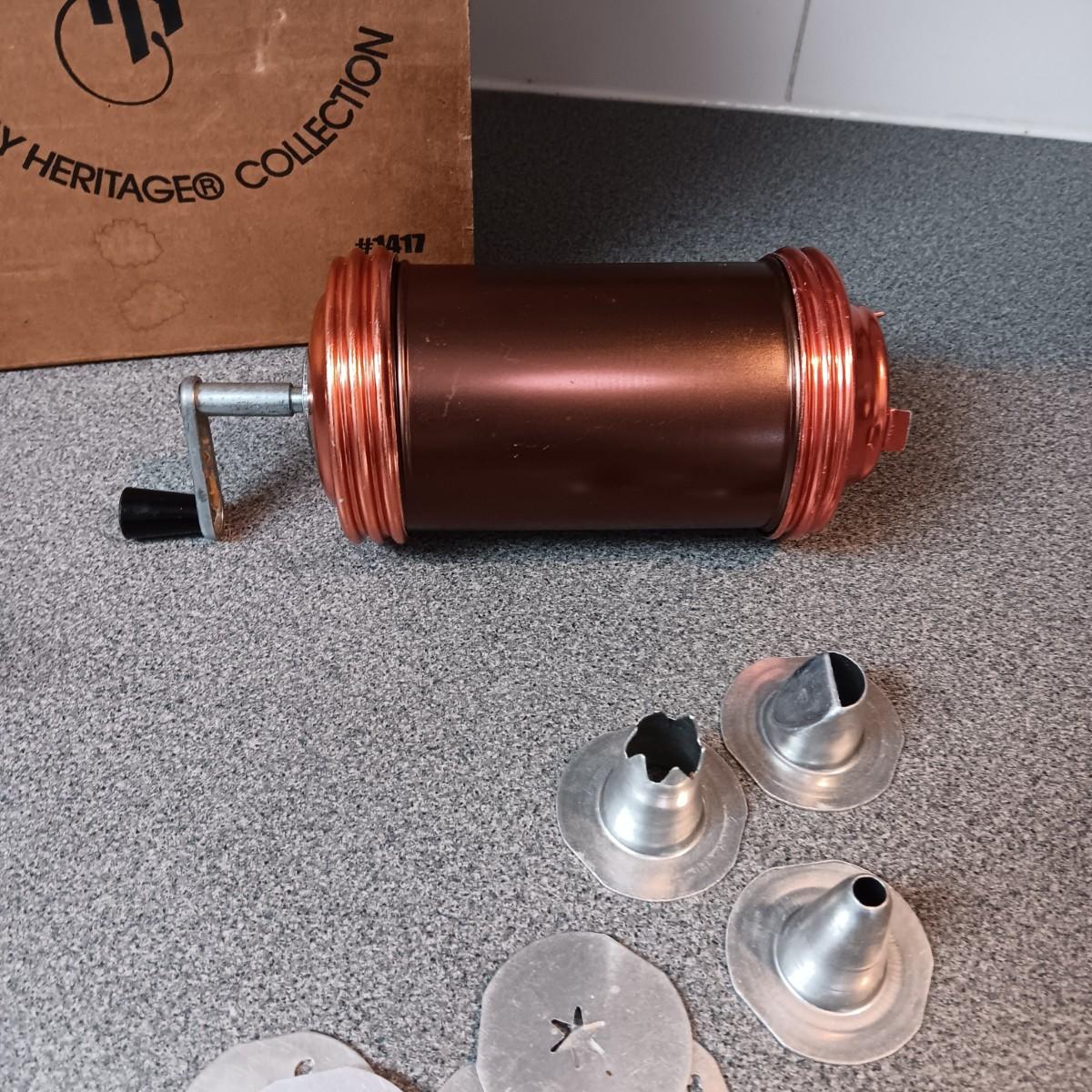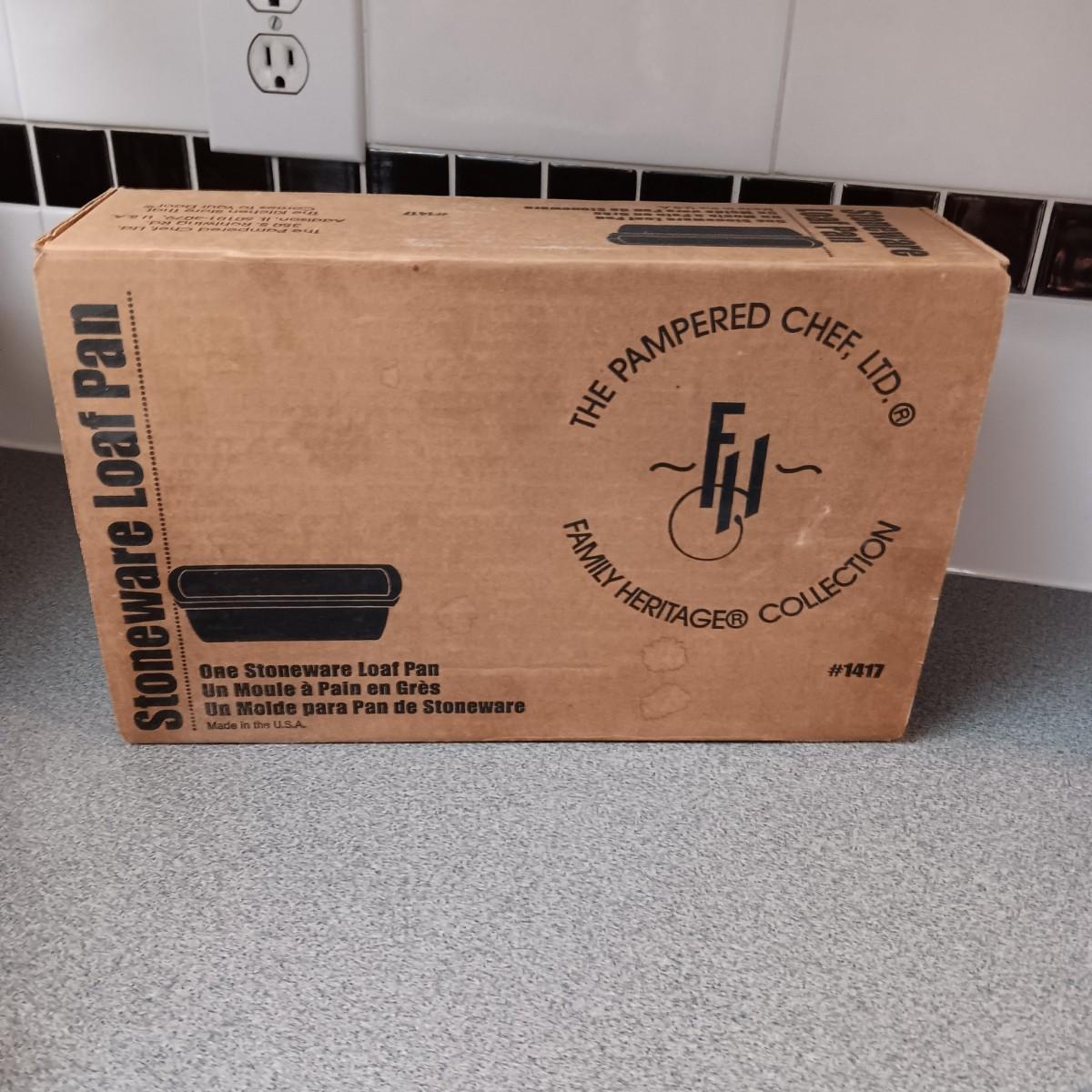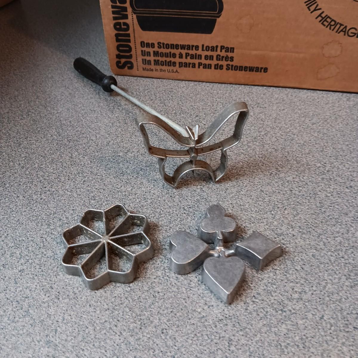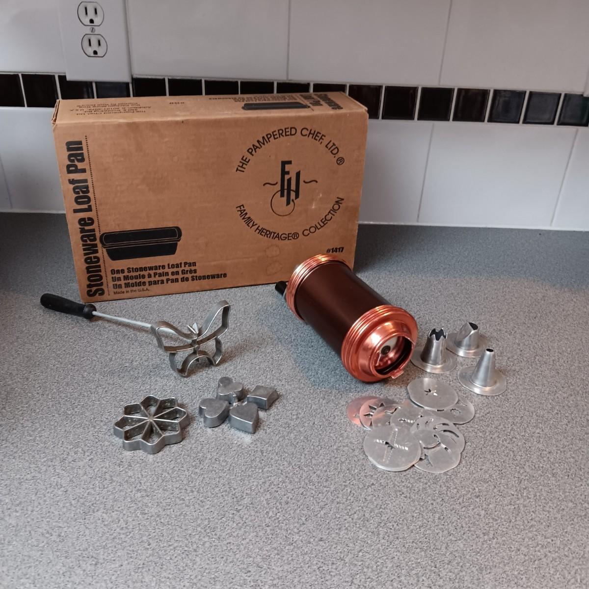PAMPERED CHEF STONEWARE LOAF PAN, COOKIE PRESS AND ROSETTE IRON