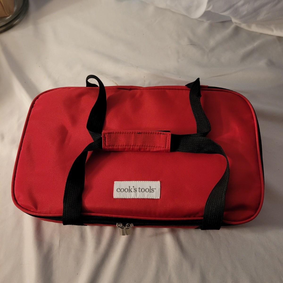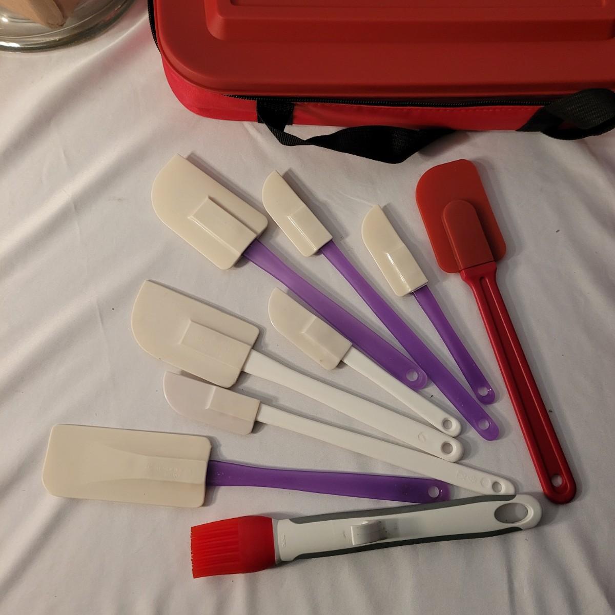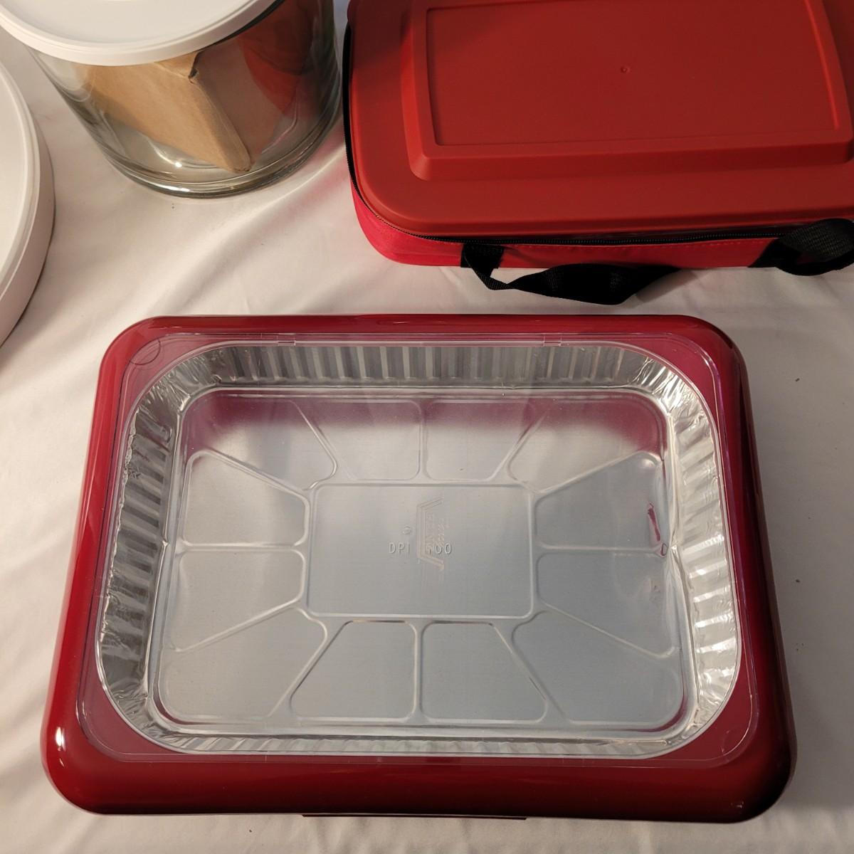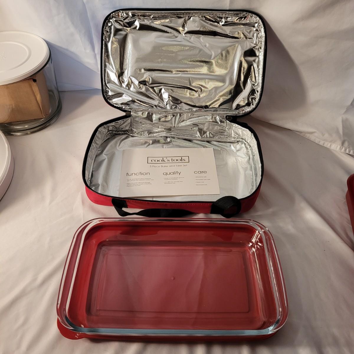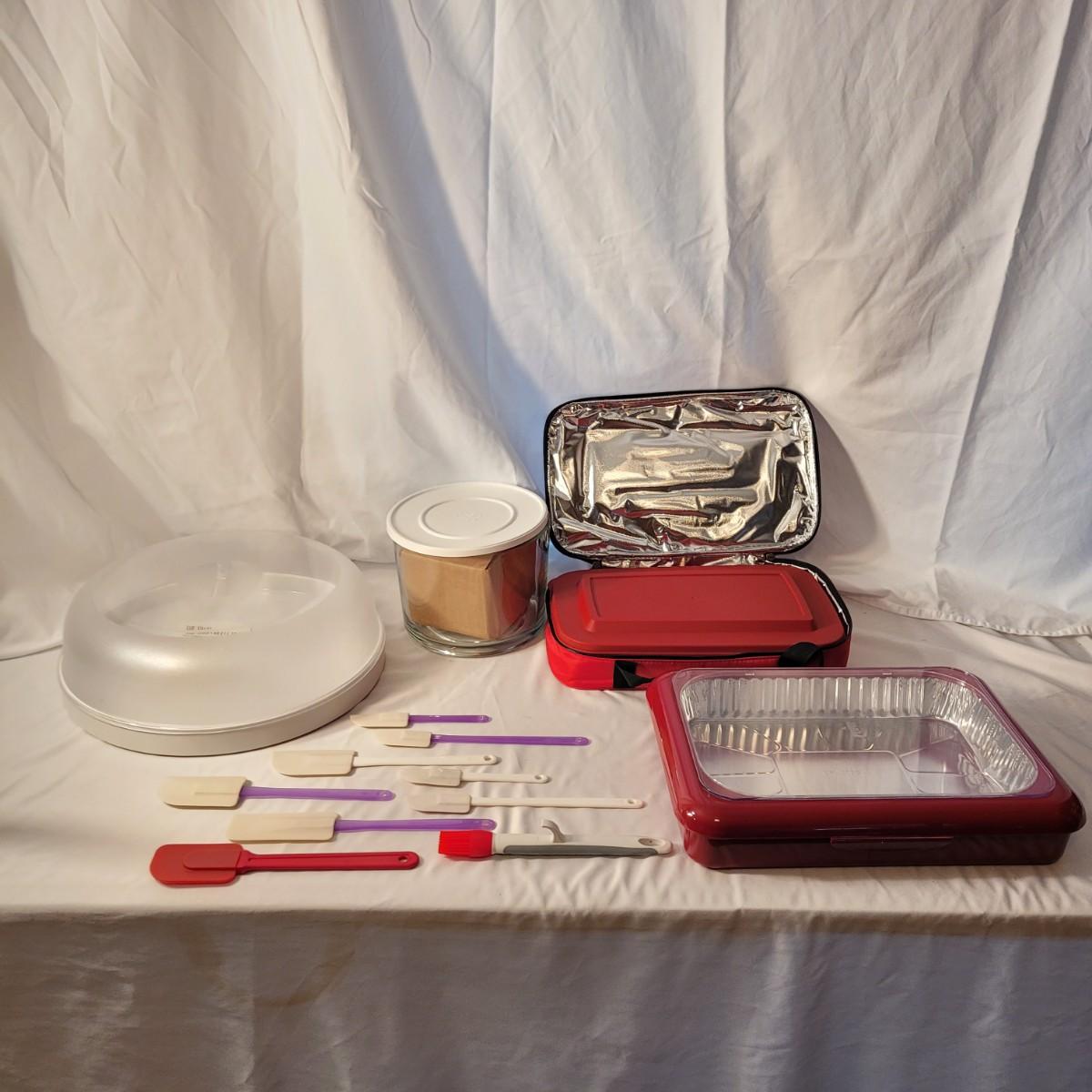 This lot is perfect for potlucks! Included are a carrying case for disposable tin pans, an insulated case with a covered baking dish, a domed platter, covered trifle bowl and a variety of spatulas. Domed platter measures approximately 15"DIA. Shipping available.