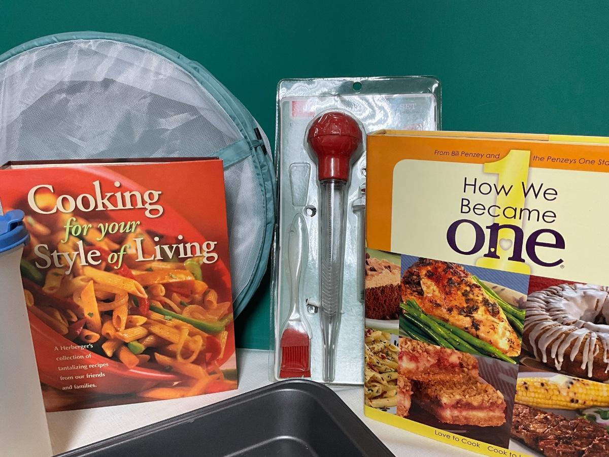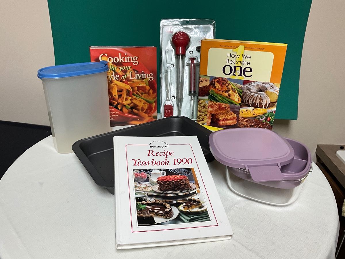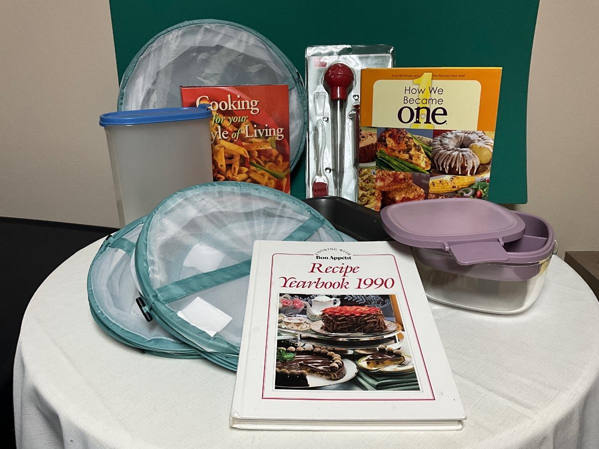 Baking Pan, Glass Lunch Container,Tupperware pitcher, turkey baster, cookbooks, mesh food covers