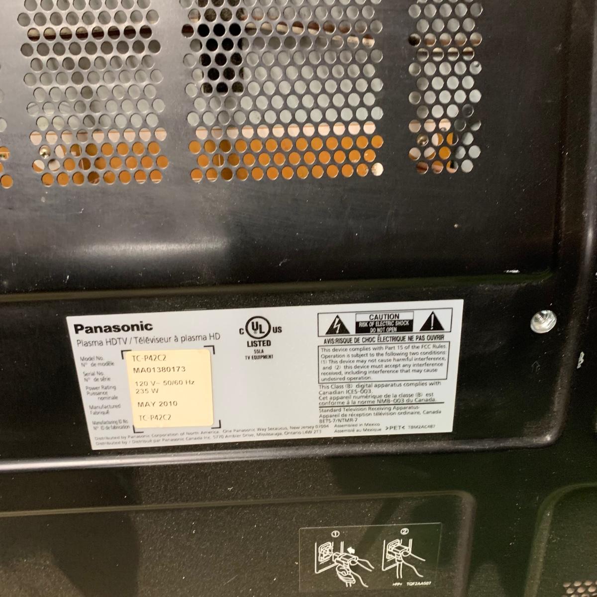 One 42” Panasonic Plasma HDTV, Model No. TV-P42C2. TV powered on when plugged in. No power cord is included. TV is a bit dusty, but otherwise appears to be in very good condition. Local pickup only. There is easy access to load this item into your vehicle. It will not have to be moved up or down any stairs. It is heavy, so please bring help to move it.