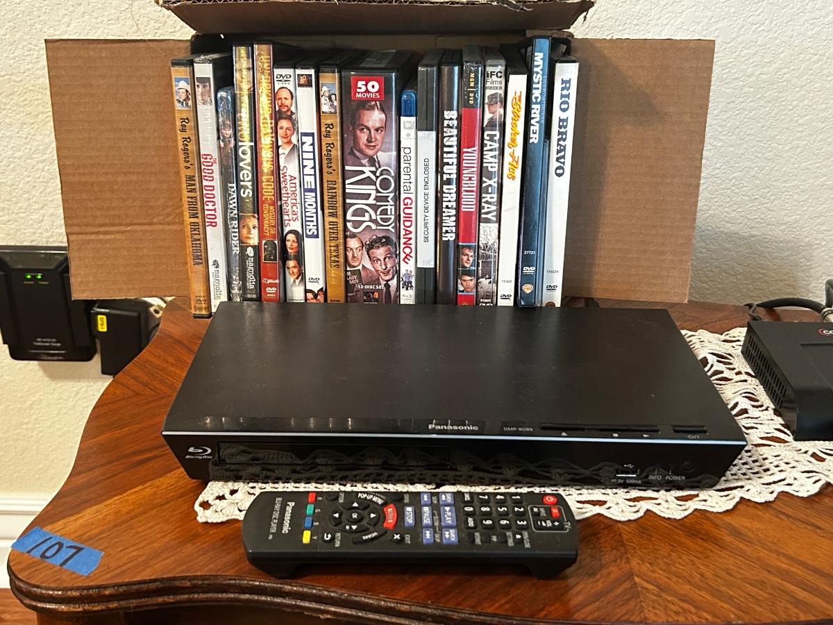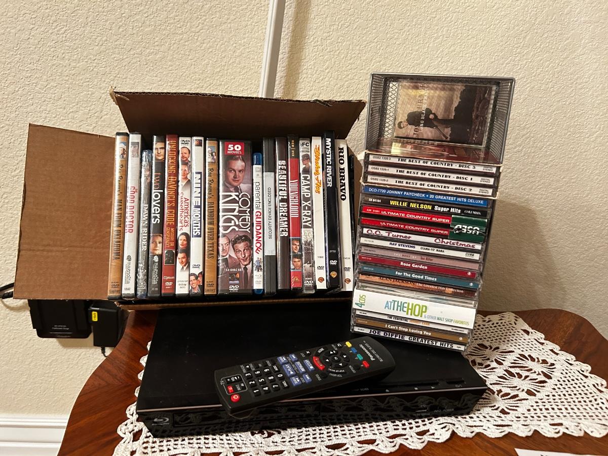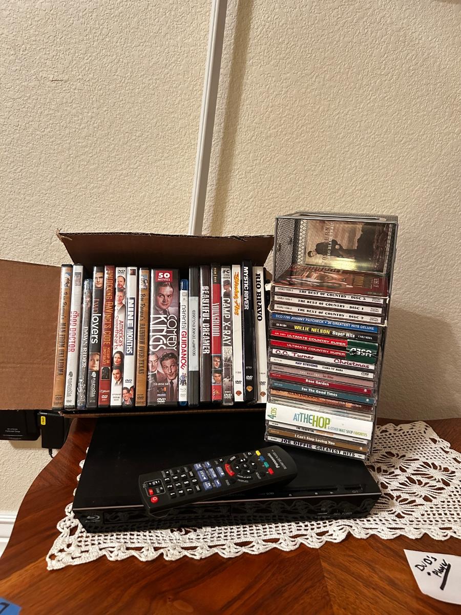 PANASONIC BLU-RAY DISC PLAYER W/REMOTE, DVD’S AND A VARIETY OF MUSIC ON CD’S