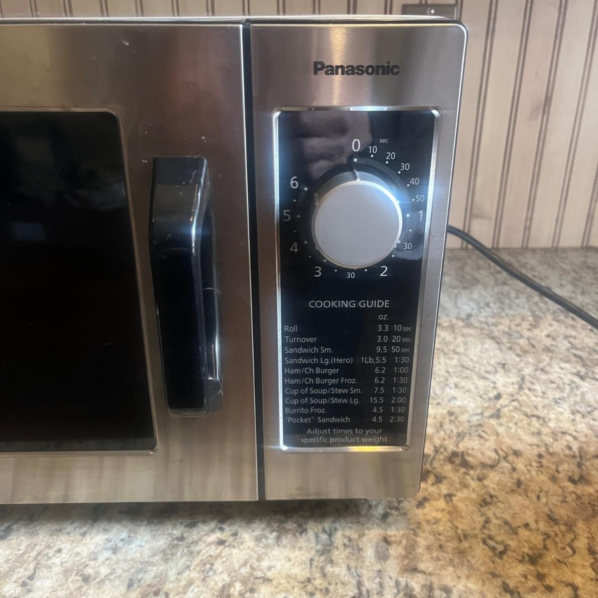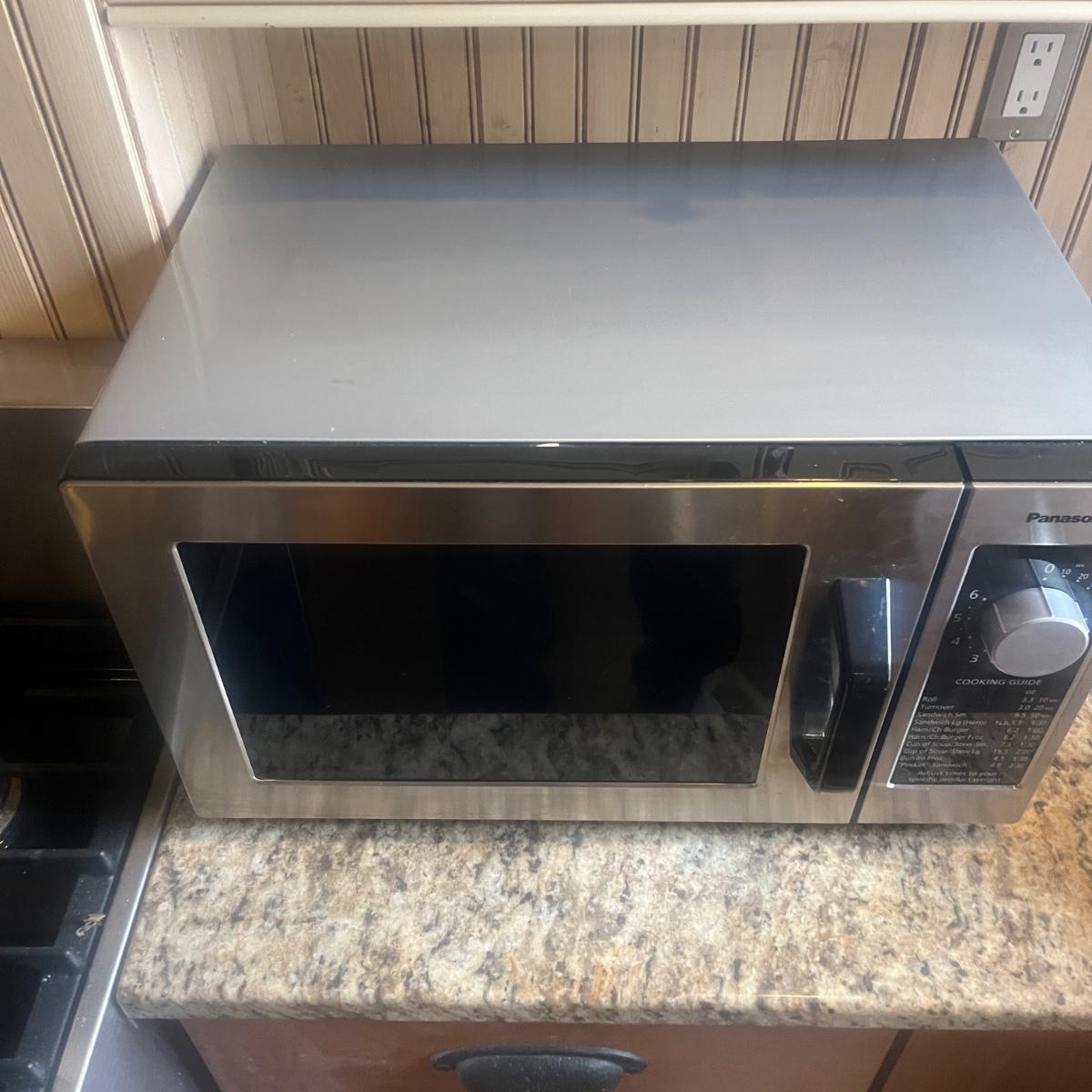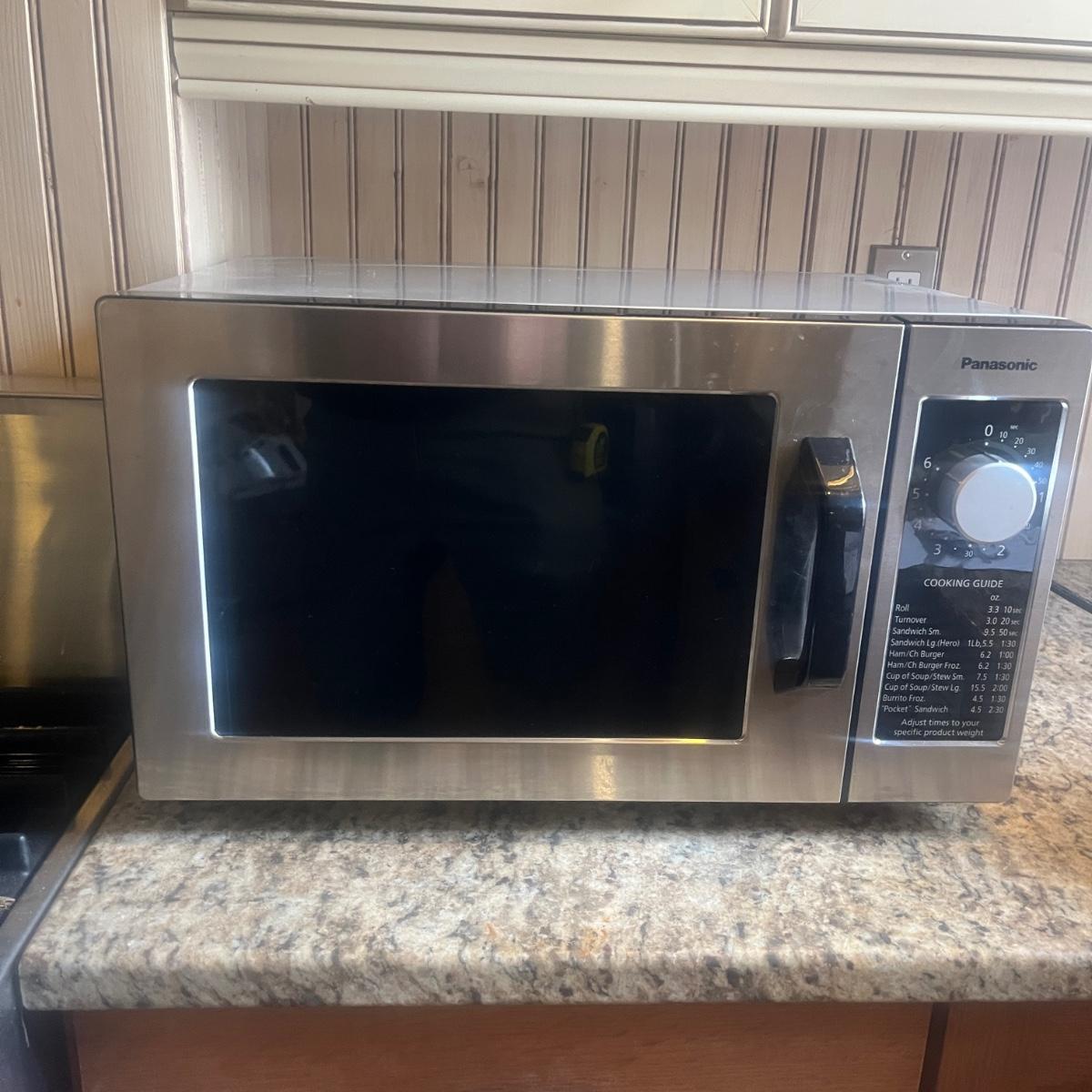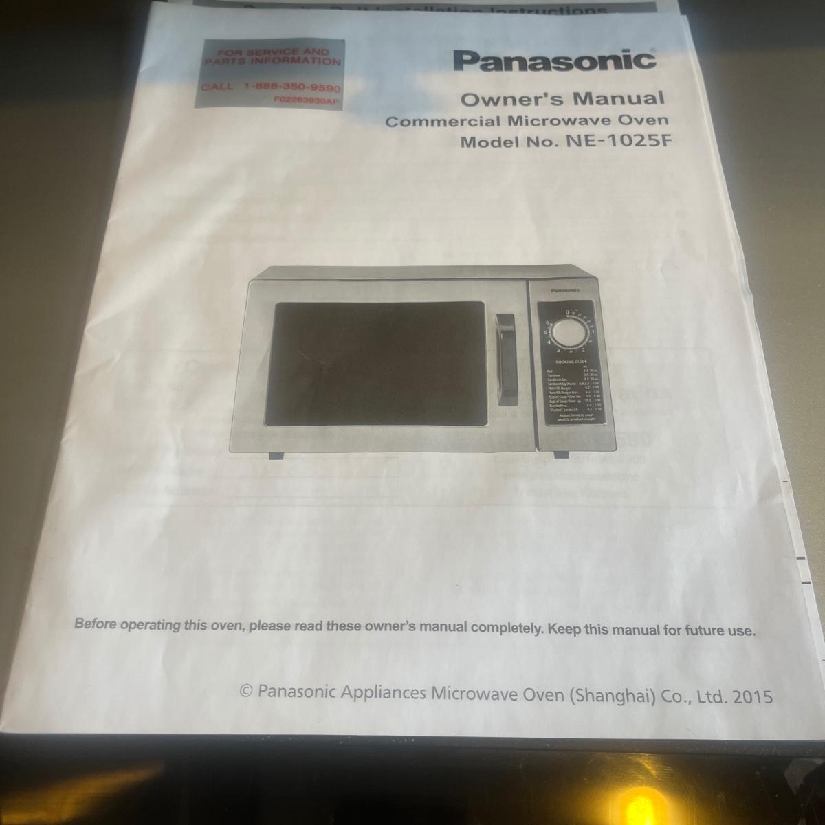 Lot includes a Panasonic commercial microwave oven with owners manual. Microwave measures 20” x 13” x 12”H. Microwave powered on when plugged in.