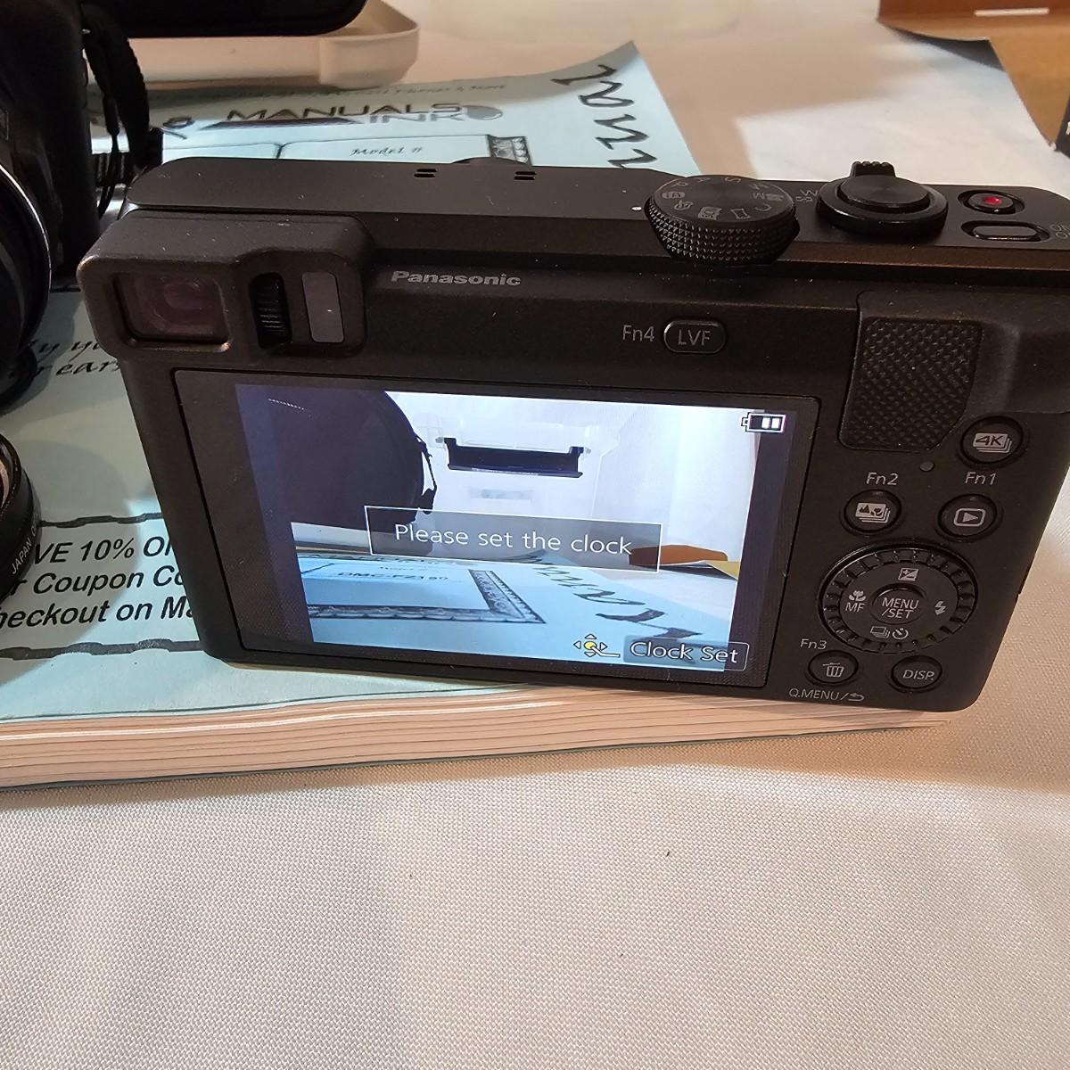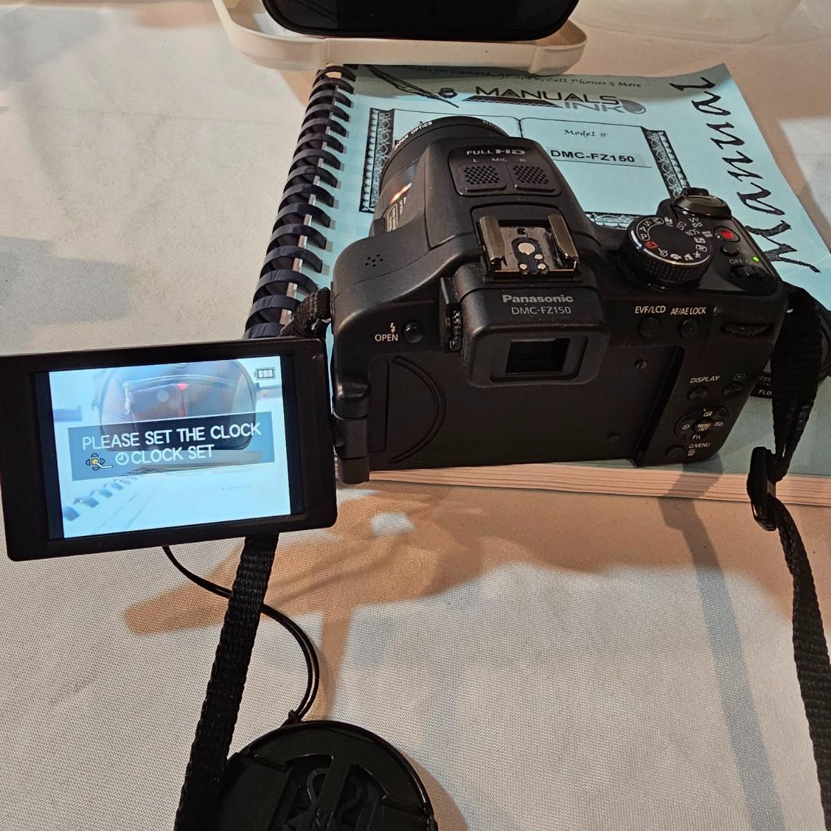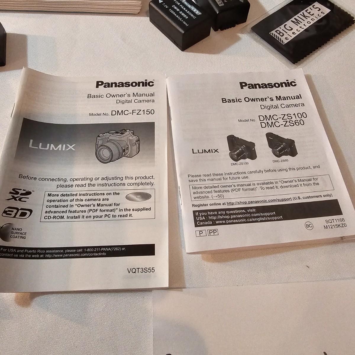 Two digital cameras and accessories. One Panasonic Lumix DMC-FZ150 with 24x optics zoom and swing out viewscreen. Includes four batteries and charger + case. Uses standard SD style memory cards. Also one Panasonic Lumix DMZ-ZS60 digital camera with Leica lens. Three batteries and charger plus soft case. One Pixel Oppilas wireless remote control with case and instructions. Also a spiral bound manual for the cameras. Both cameras powered on. See photos for details. Shipping available.
