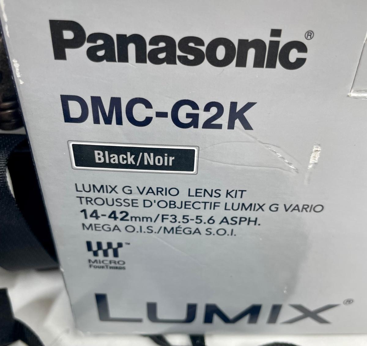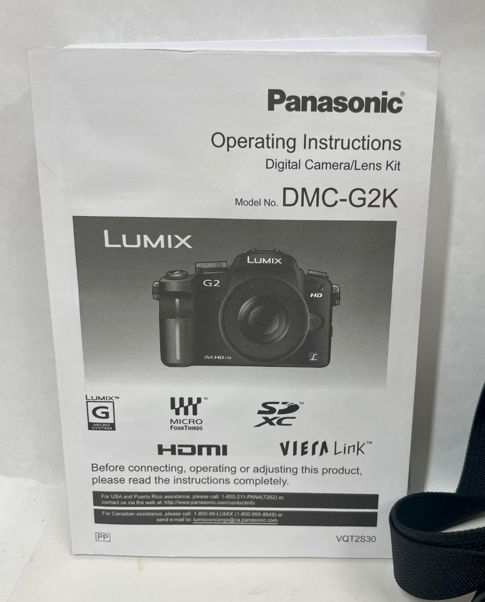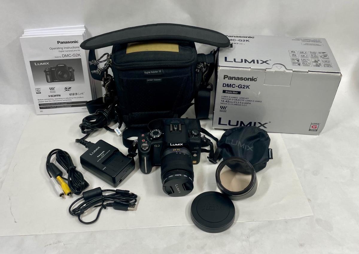 Panasonic LUMIX DMC-G2 12.1MP Digital Camera with Vario 14-42mm Lens. Camera kit includes holster bag, hood and Vivitar filter, battery charger, camera-computer cable, A/V cable, user guides, camera strap, and more. The only item missing is the original CD with associated software, which is probably available directly from the Panasonic website.
