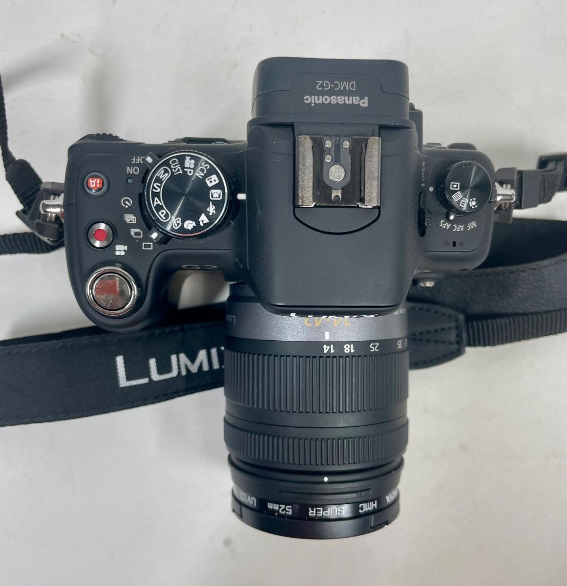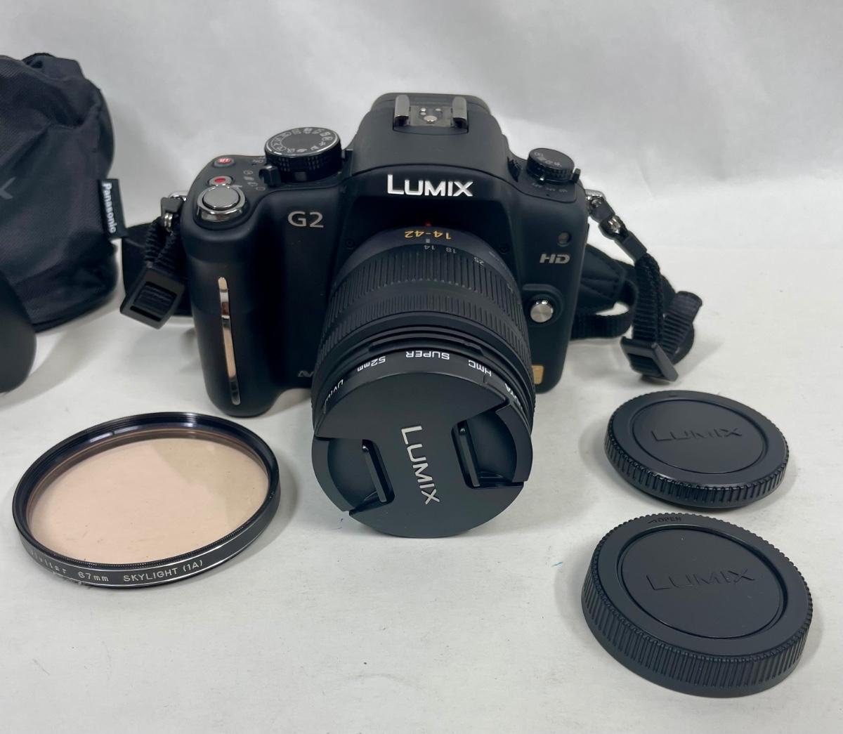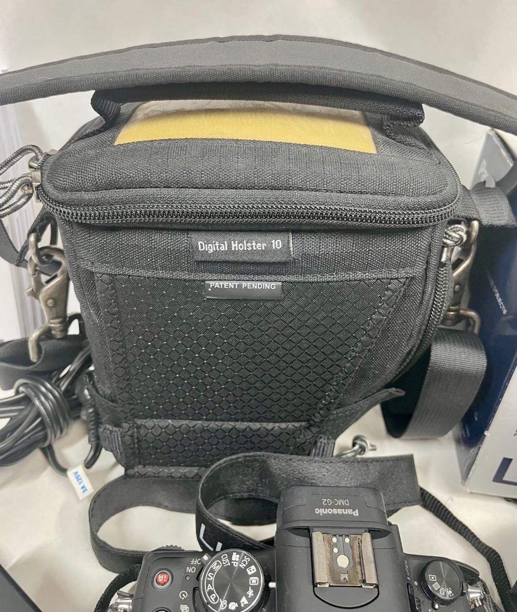 Panasonic LUMIX DMC-G2 12.1MP Digital Camera with Vario 14-42mm Lens. Camera kit includes holster bag, hood and Vivitar filter, battery charger, camera-computer cable, A/V cable, user guides, camera strap, and more. The only item missing is the original CD with associated software, which is probably available directly from the Panasonic website.